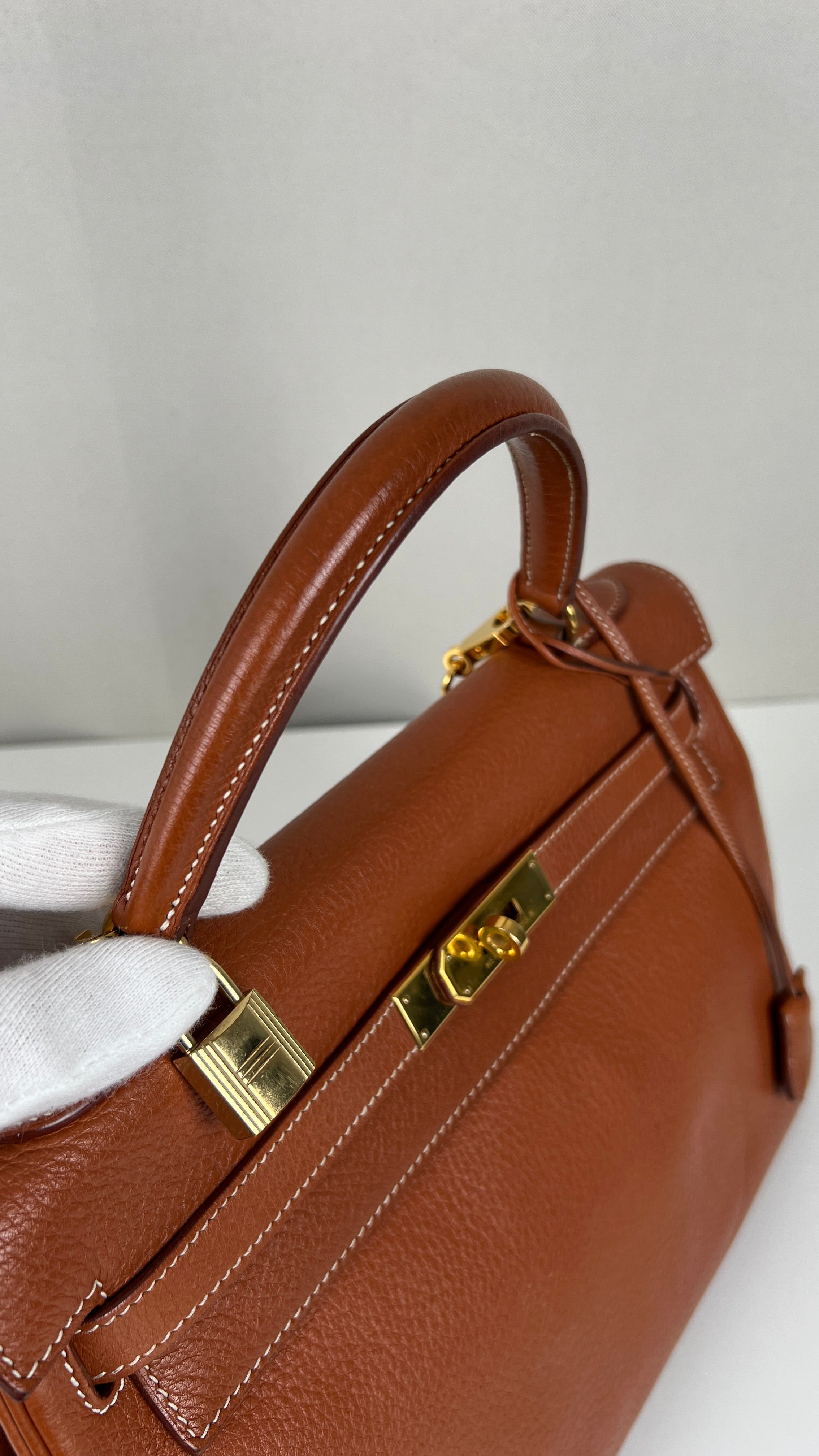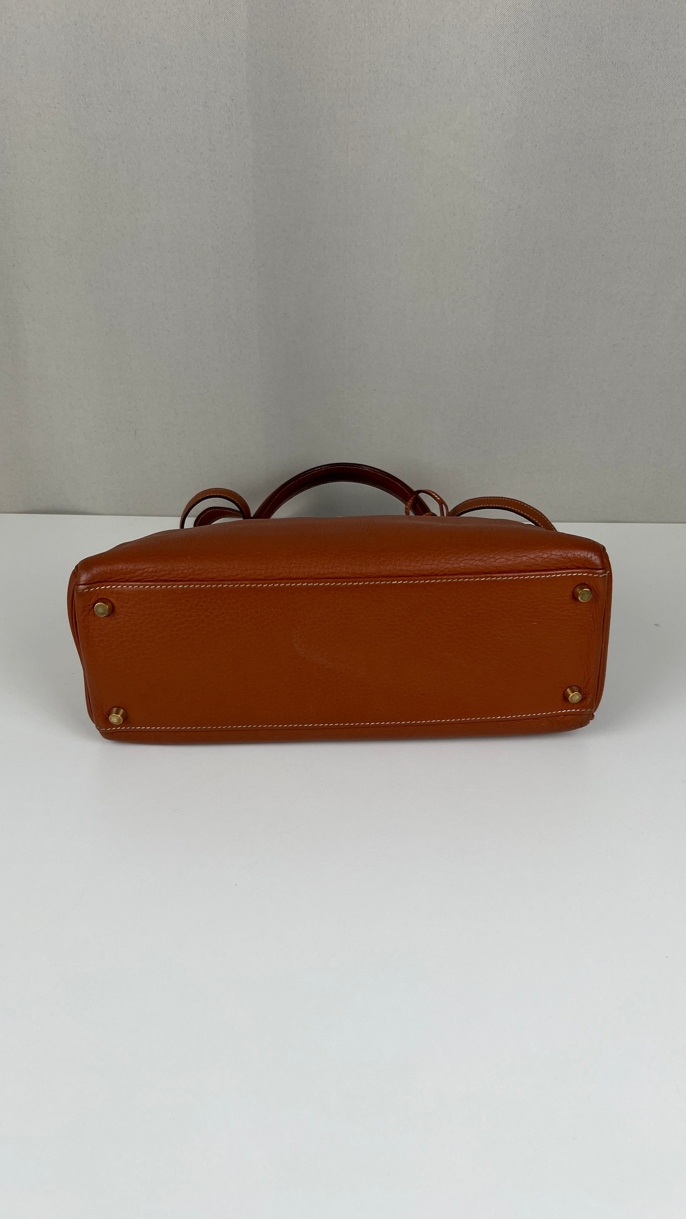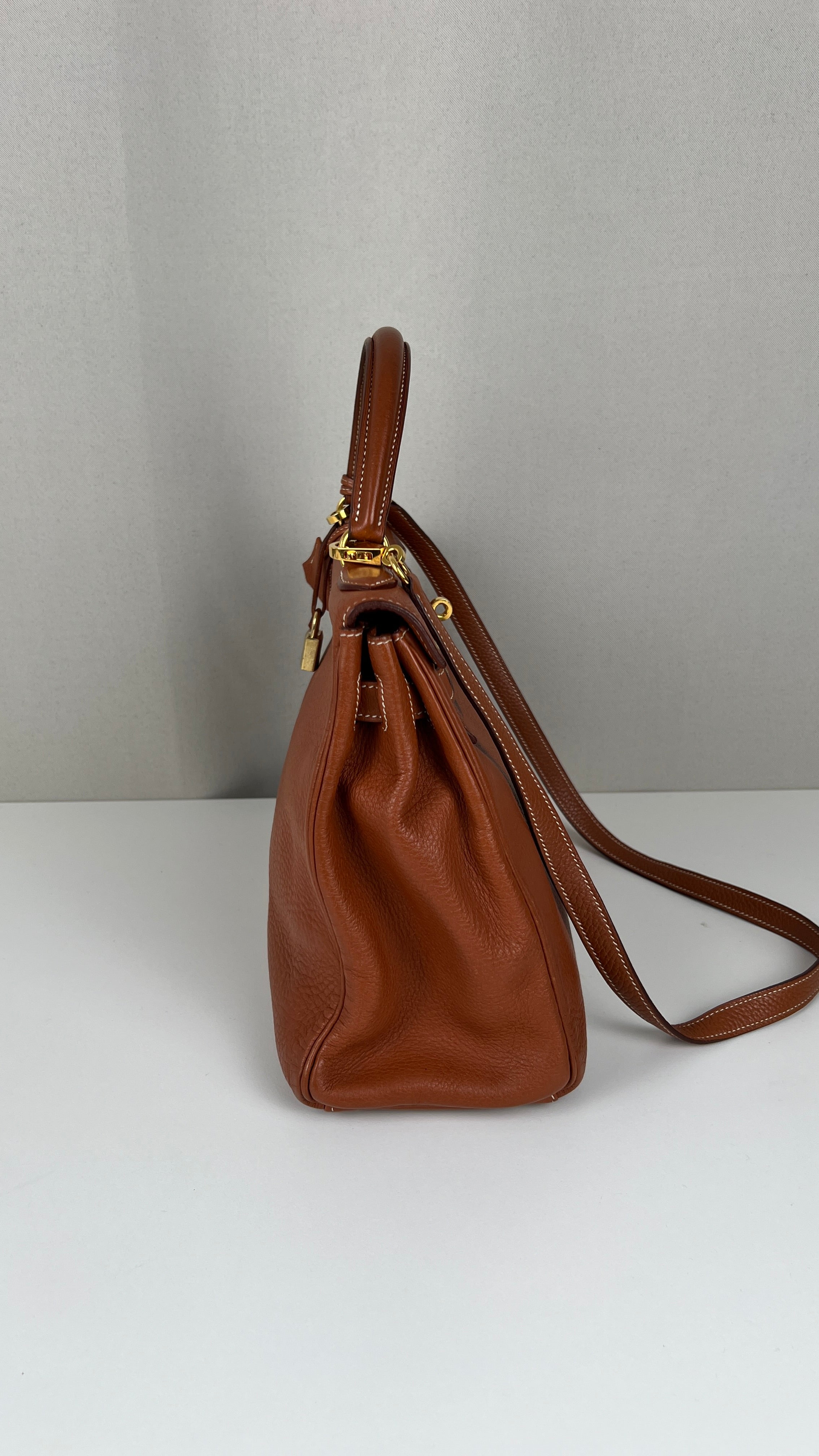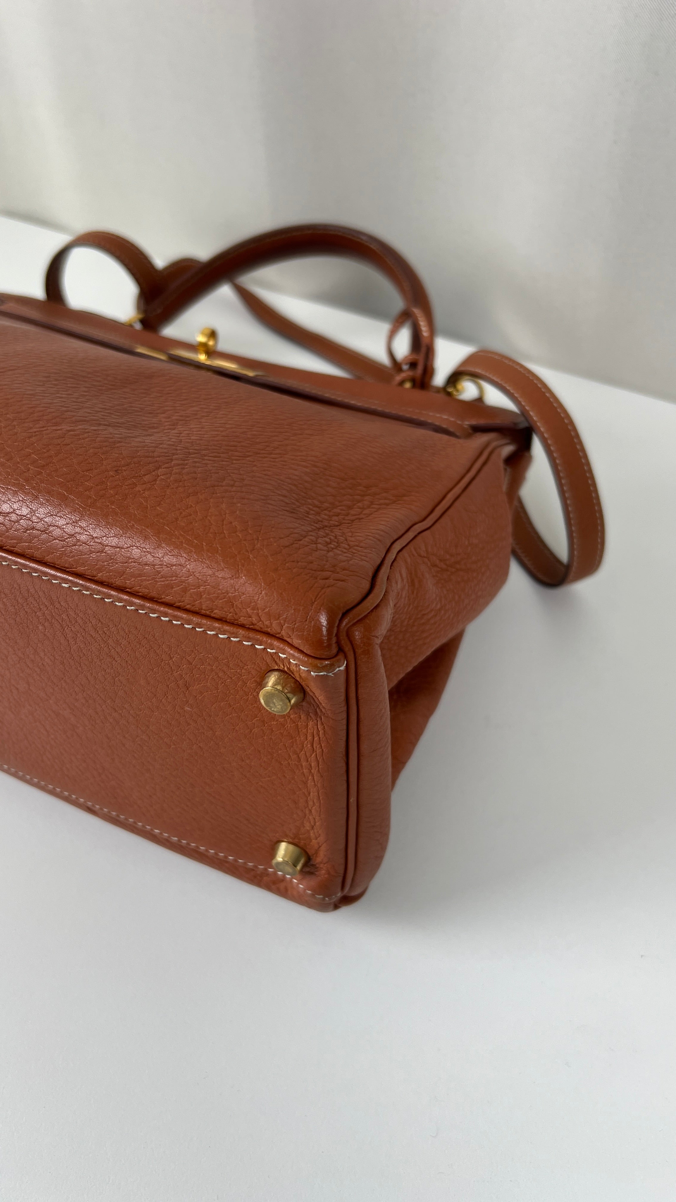 Ce sac Kelly 32 Togo Retourné Hermès est en bon / très bon état. Le cuir est de couleur Cognac. Accastillage doré. Il est livré avec le dustbag, cadenas et clé, le sac imperméable, la facture du spa Hermès + certificat d'Entrupy. Le cuir est en très bon état, vous avez des traces naturelles de portés mais assez naturelles. Les coins sont très biens. La bijouterie présente de petites marques d'usure et rayures (normales). L'intérieur du sac est en très bon état. Une seule mini tache dans une petite poche, très petite. Sinon très bon état pour le sac. C'est un retourné pas un sellier. Il est passé au spa Hermès (facture incluse) donc il est super ! Ce qui a été fait : nettoyage et entretien des coins, une couture dans la poche intérieure, petite couture sur soufflet, remplacement de la bandoulière. Beau sac et très bon état c'est un must.