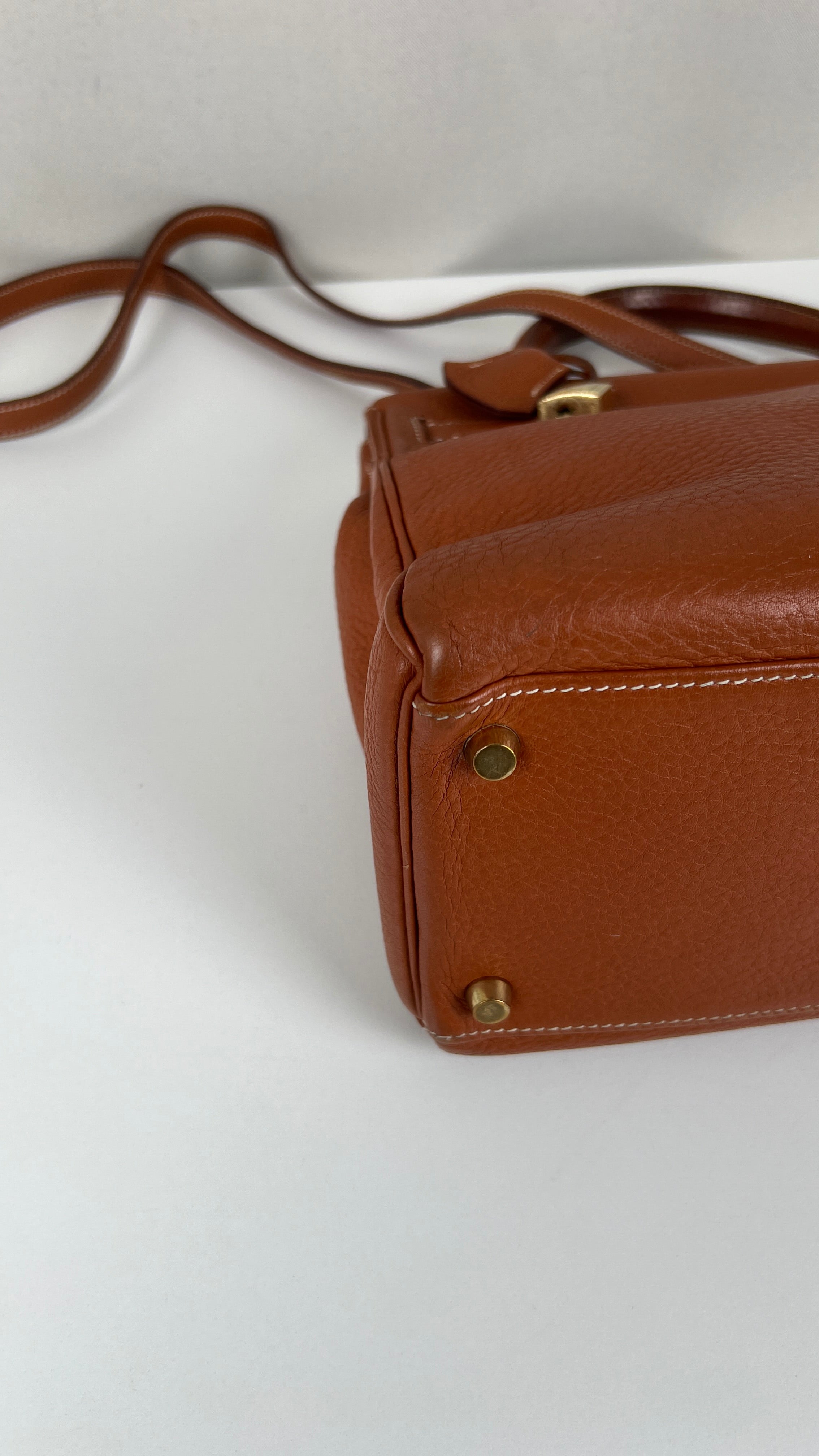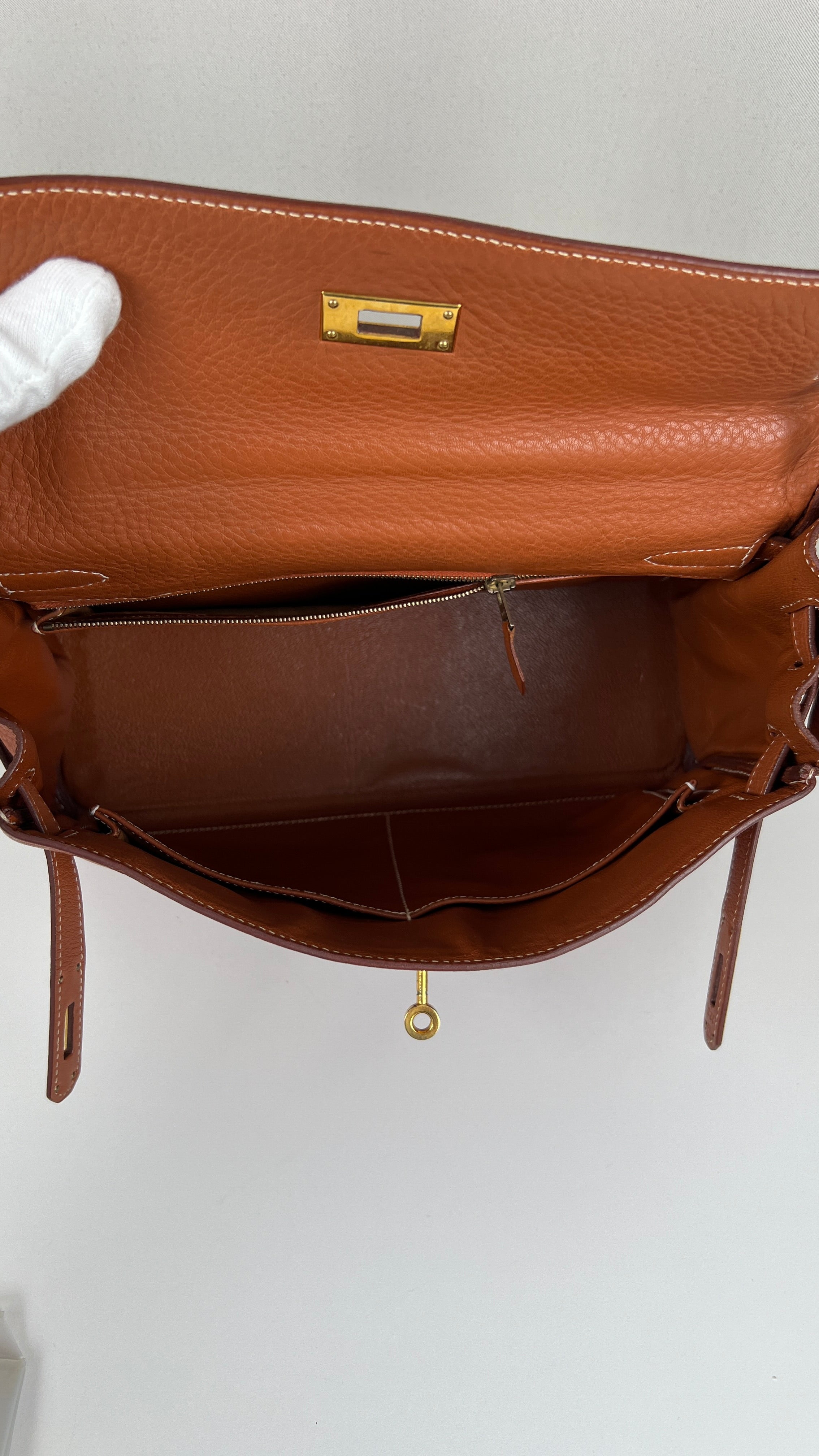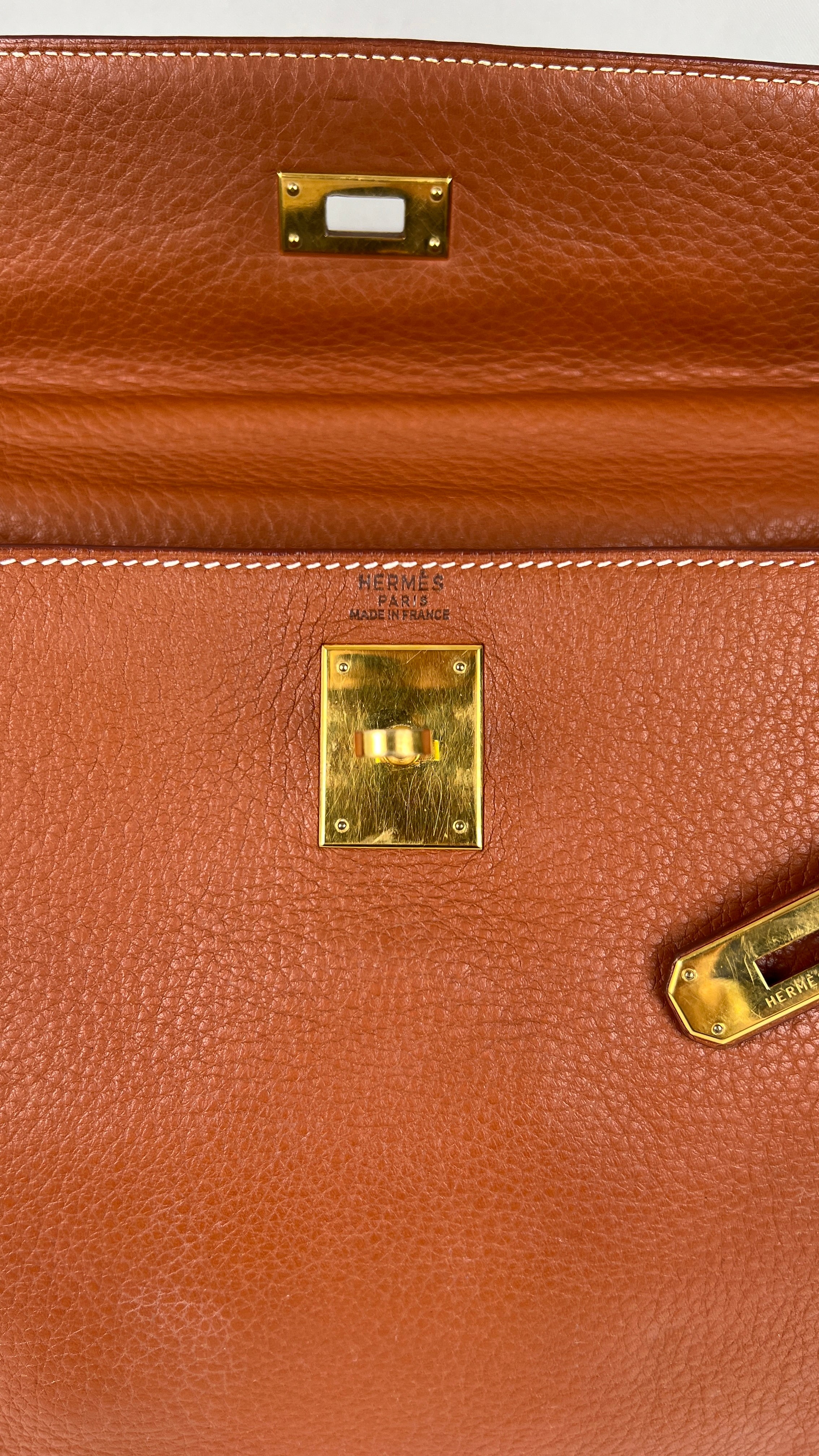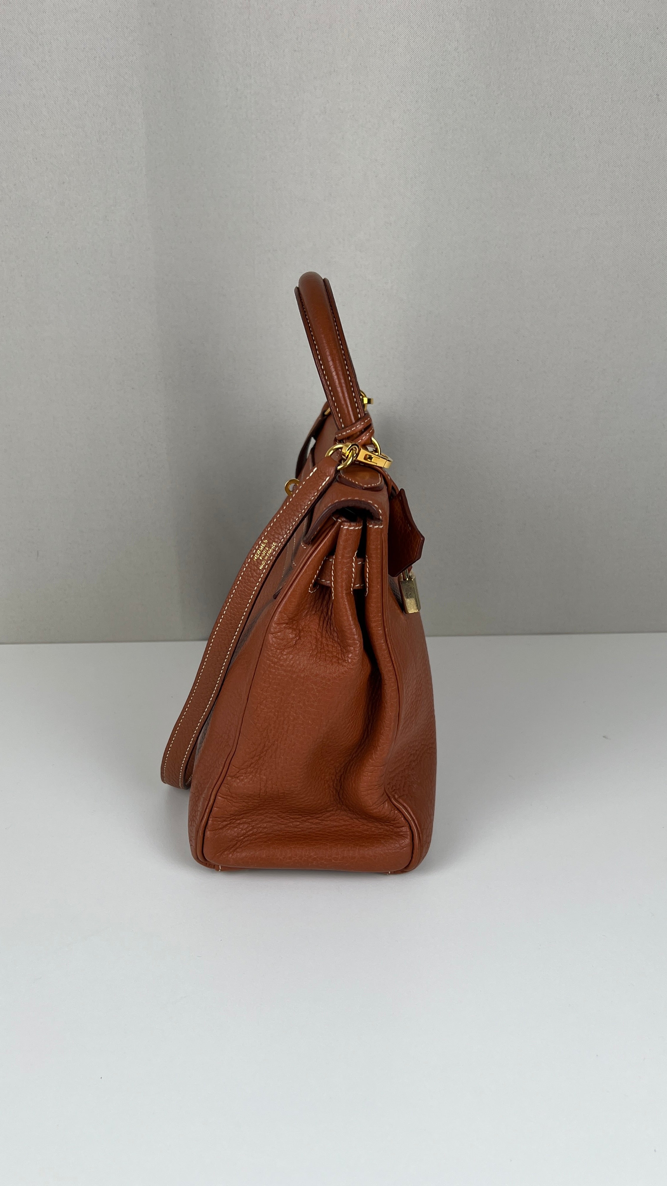 Ce sac Kelly 32 Togo Retourné Hermès est en bon / très bon état. Le cuir est de couleur Cognac. Accastillage doré. Il est livré avec le dustbag, cadenas et clé, le sac imperméable, la facture du spa Hermès + certificat d'Entrupy. Le cuir est en très bon état, vous avez des traces naturelles de portés mais assez naturelles. Les coins sont très biens. La bijouterie présente de petites marques d'usure et rayures (normales). L'intérieur du sac est en très bon état. Une seule mini tache dans une petite poche, très petite. Sinon très bon état pour le sac. C'est un retourné pas un sellier. Il est passé au spa Hermès (facture incluse) donc il est super ! Ce qui a été fait : nettoyage et entretien des coins, une couture dans la poche intérieure, petite couture sur soufflet, remplacement de la bandoulière. Beau sac et très bon état c'est un must.