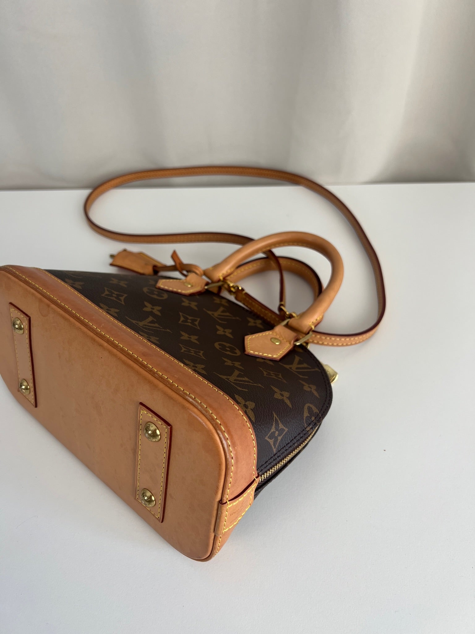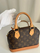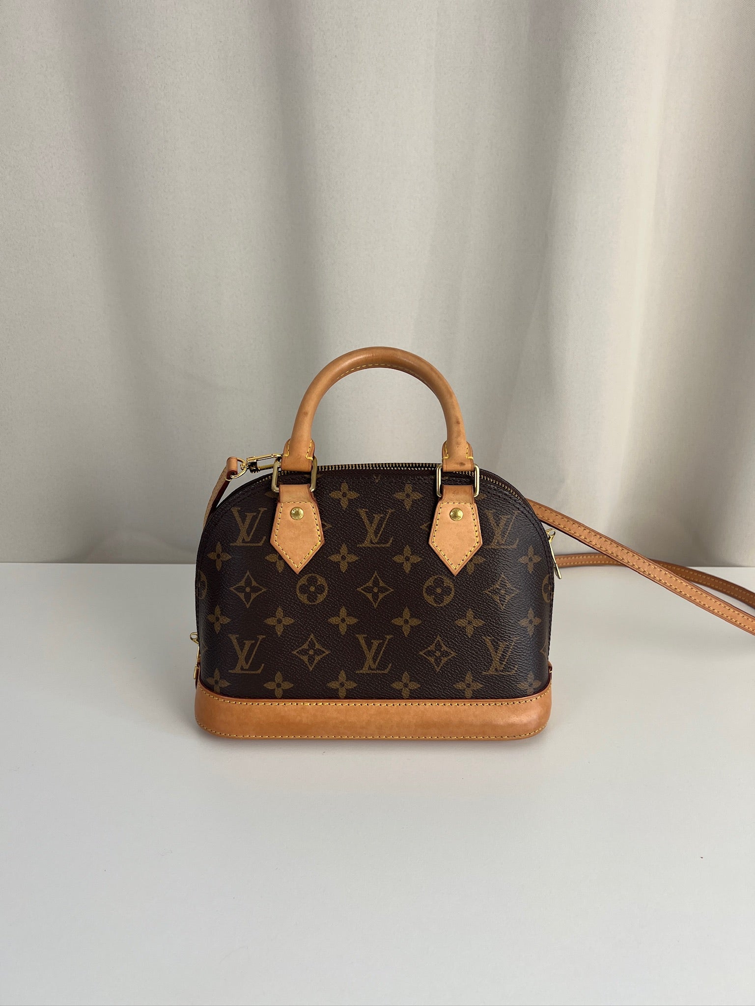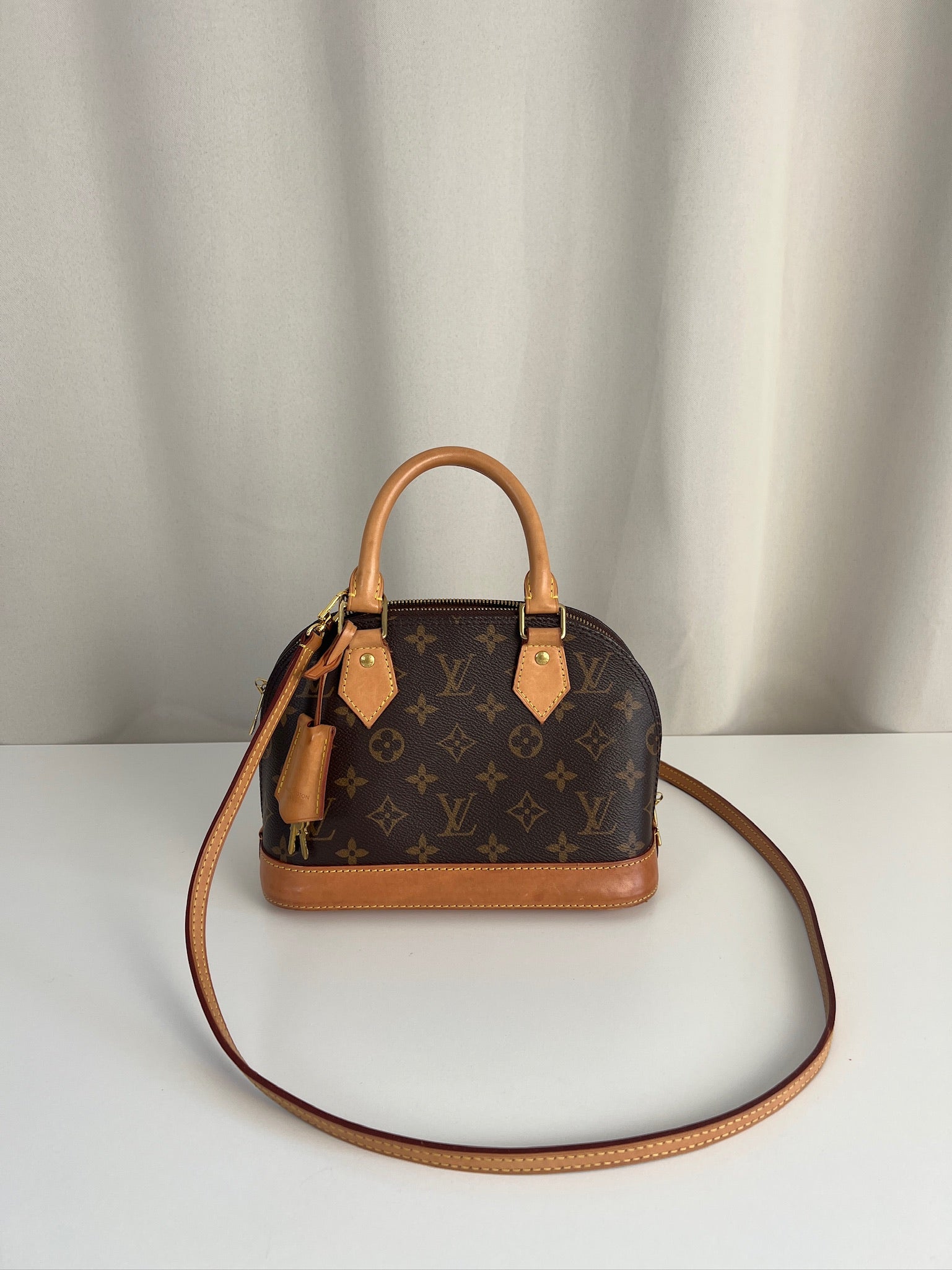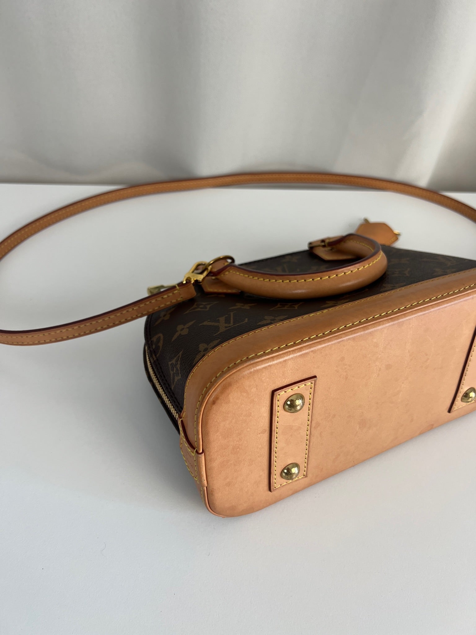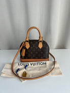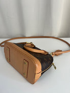 Ce sac Louis Vuitton Alma Bb est en très bon état. La toile est en très bon état. Les parties en cuir sont tannées et en très bon état. Les anses et la bandoulière sont en très bon état. La base en cuir présente quelques petites taches habituelles sur ce sac spécifique.