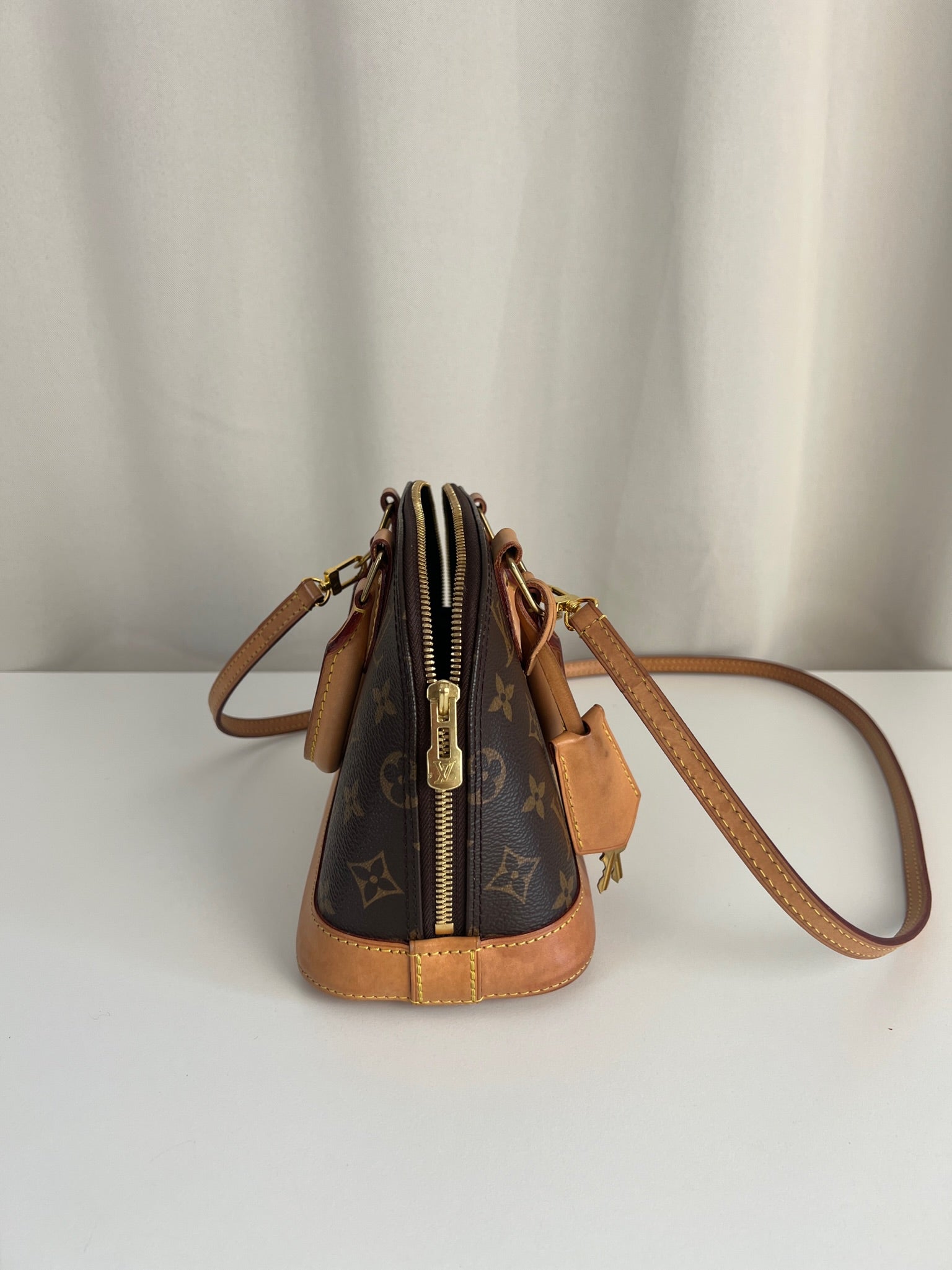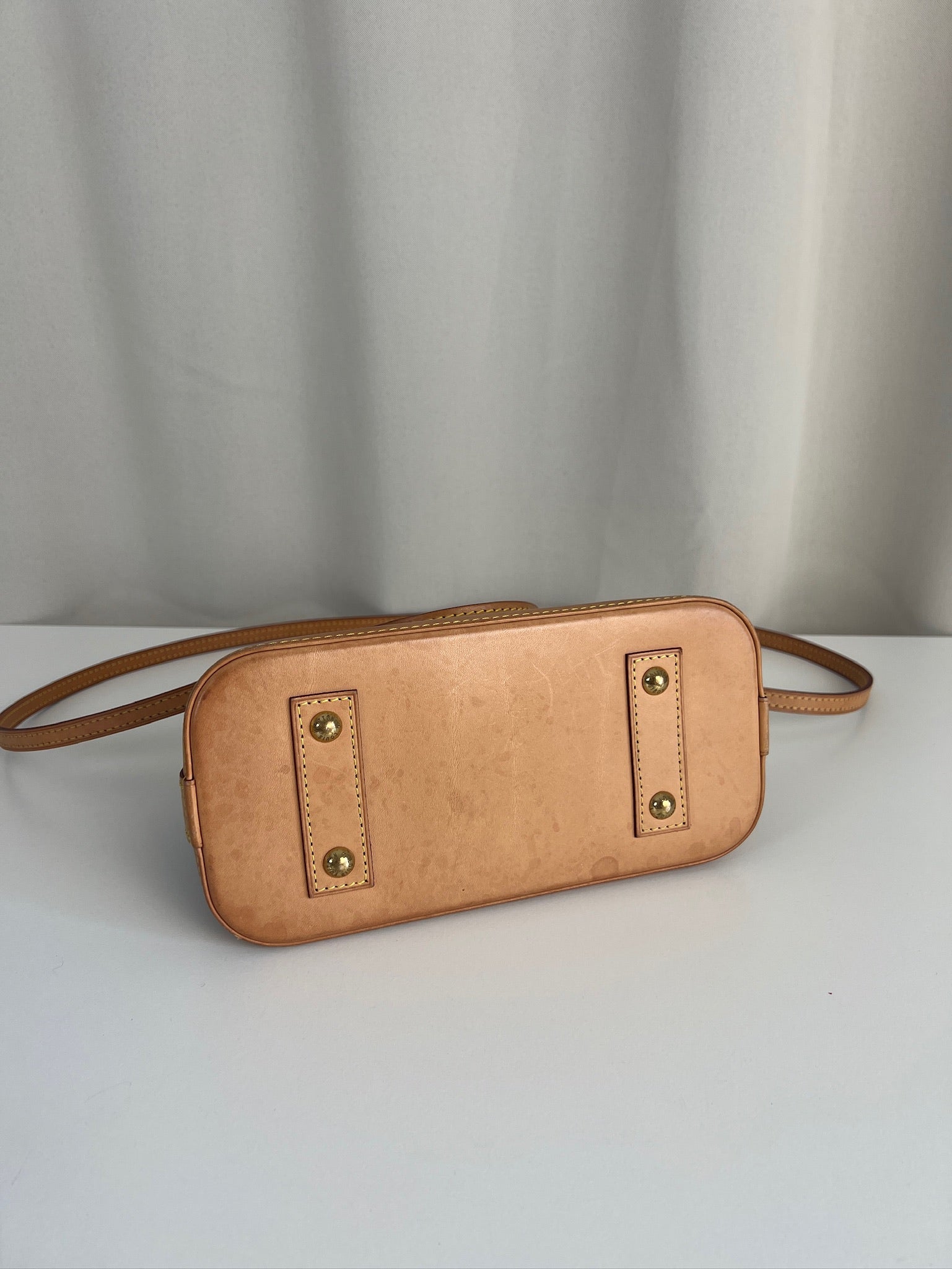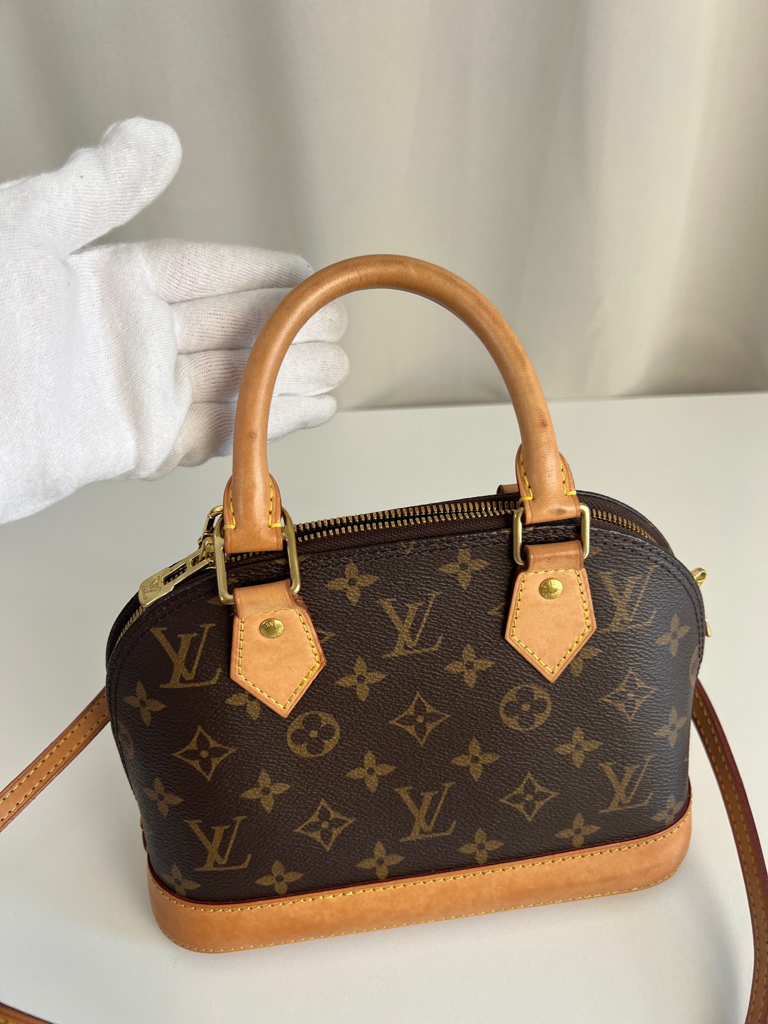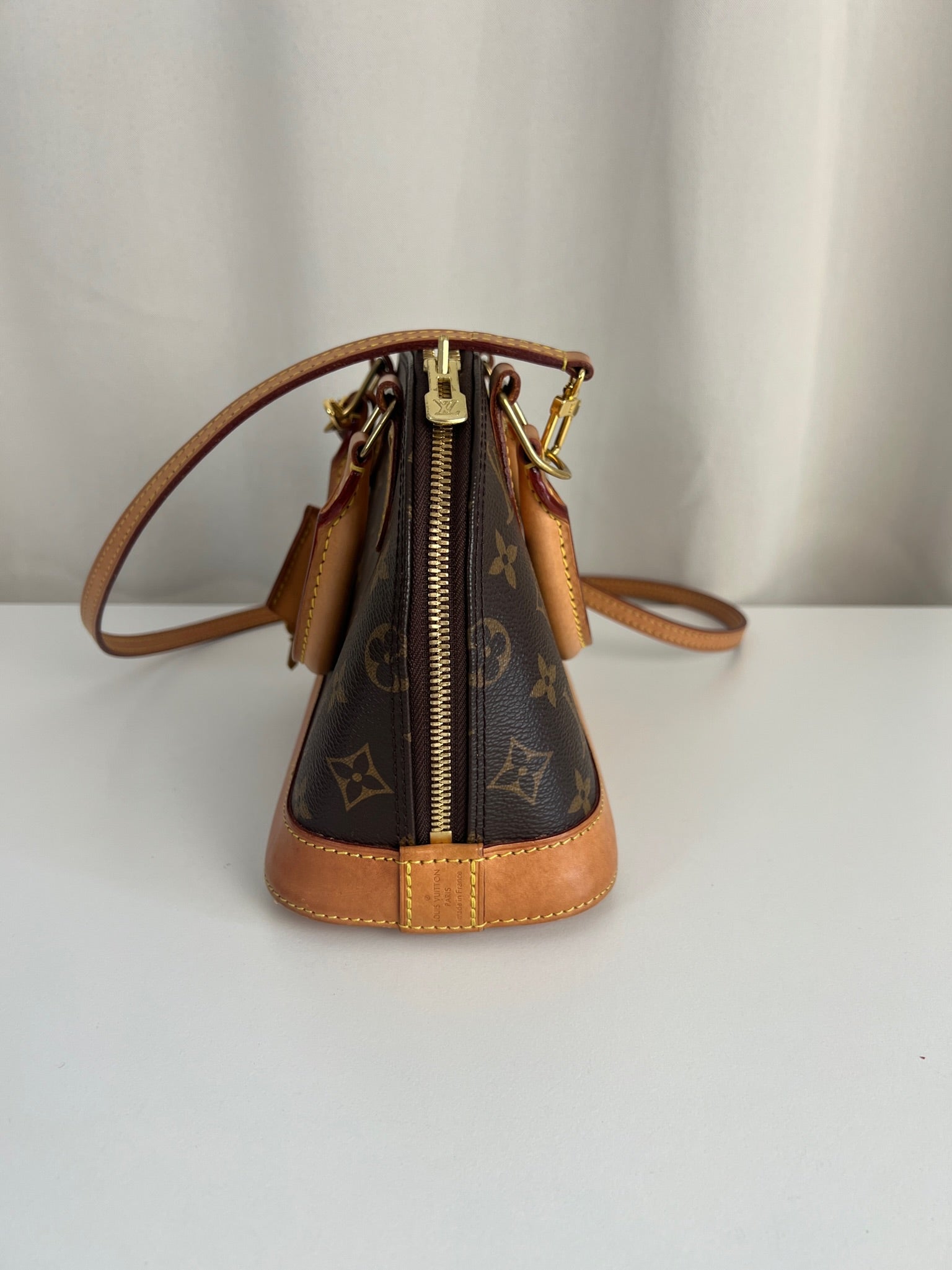 Ce sac Louis Vuitton Alma Bb est en très bon état. La toile est en très bon état. Les parties en cuir sont tannées et en très bon état. Les anses et la bandoulière sont en très bon état. La base en cuir présente quelques petites taches habituelles sur ce sac spécifique.