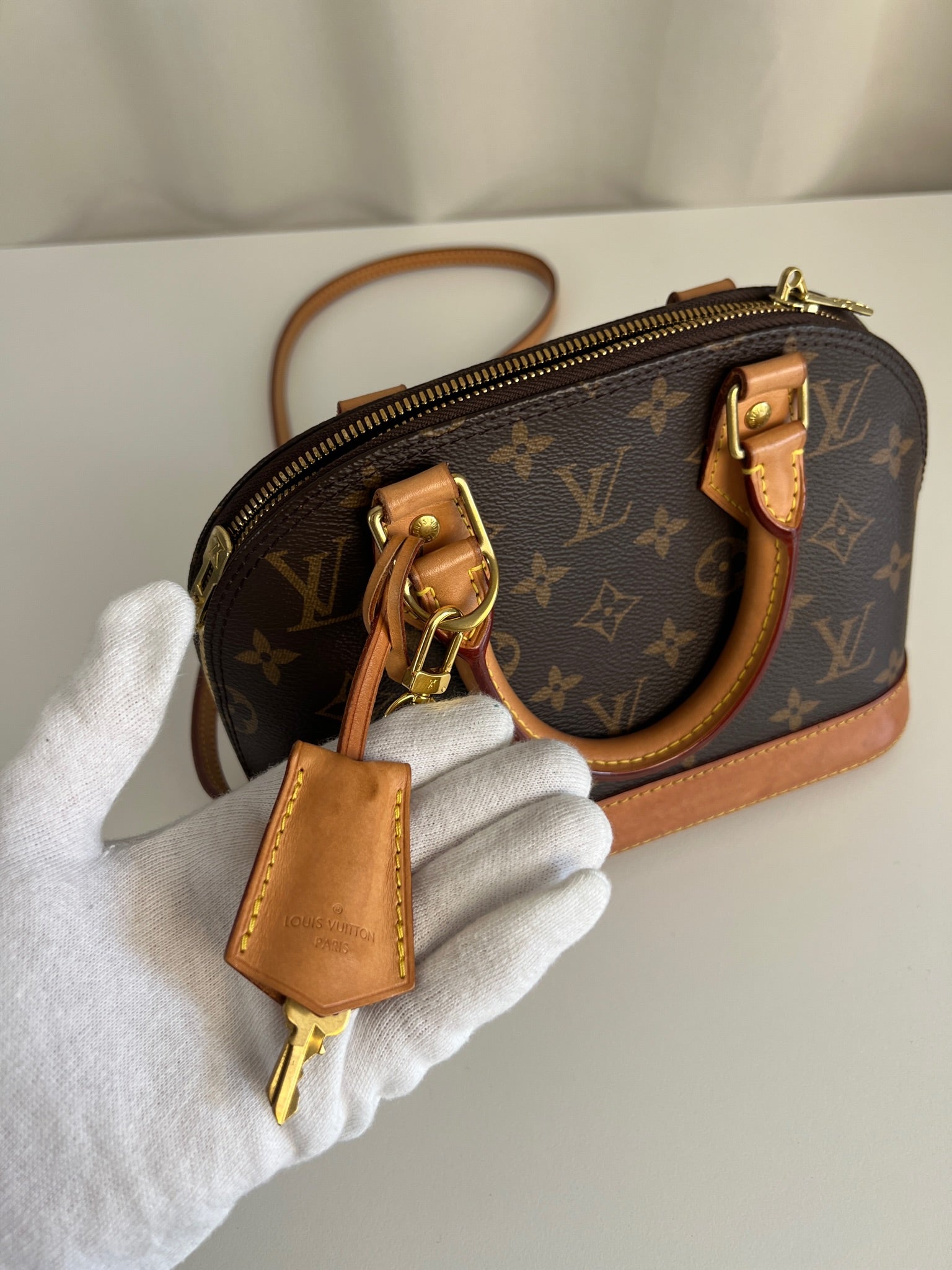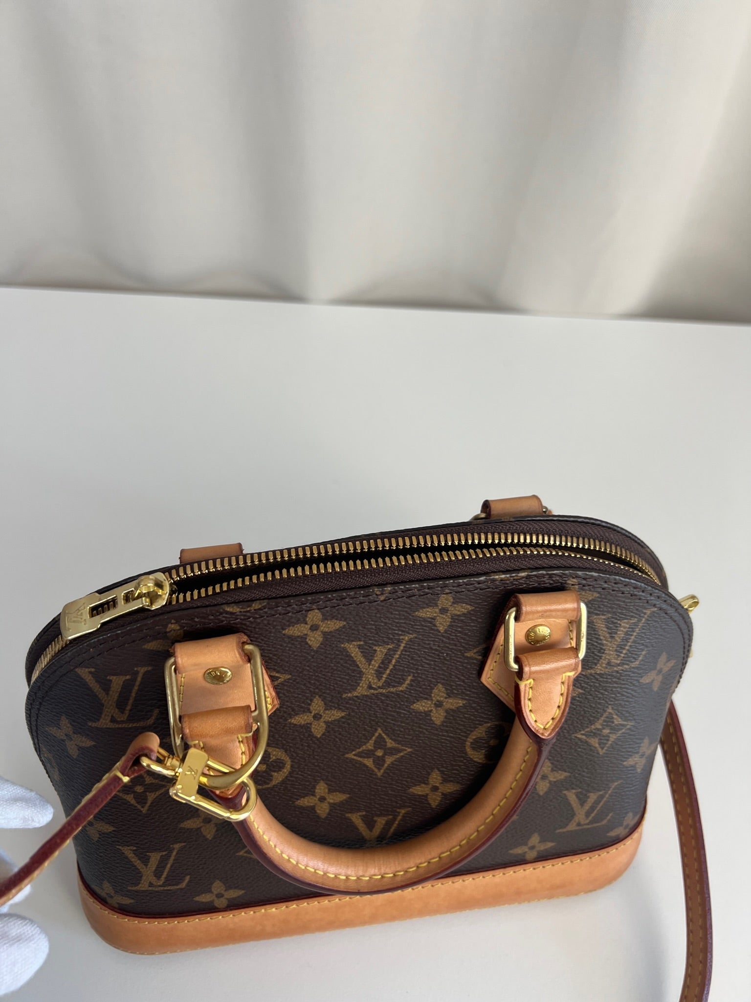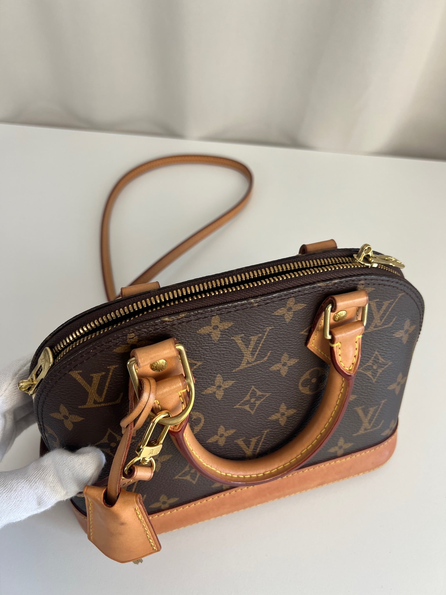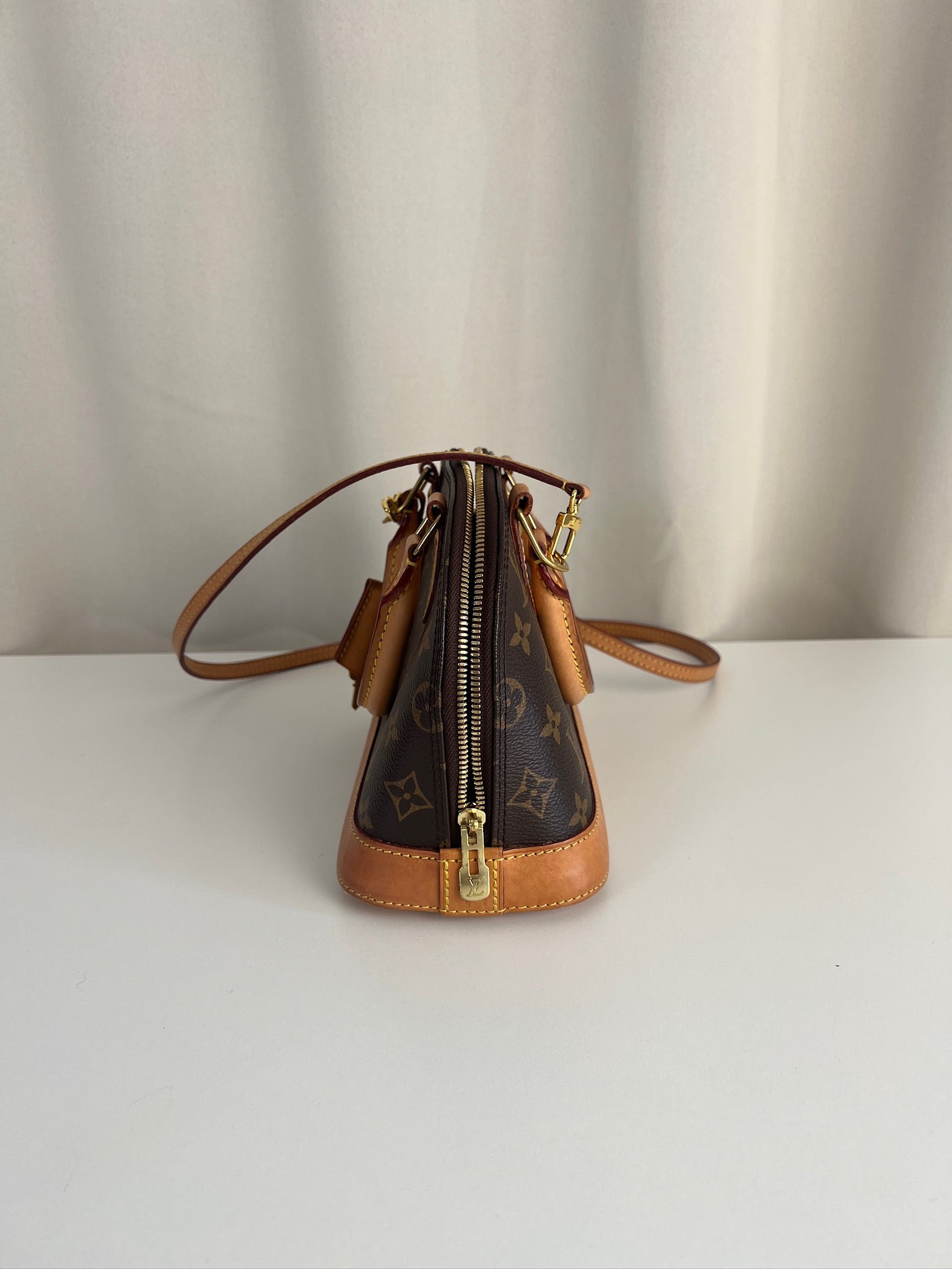 Ce sac Louis Vuitton Alma Bb est en très bon état. La toile est en très bon état. Les parties en cuir sont tannées et en très bon état. Les anses et la bandoulière sont en très bon état. La base en cuir présente quelques petites taches habituelles sur ce sac spécifique.