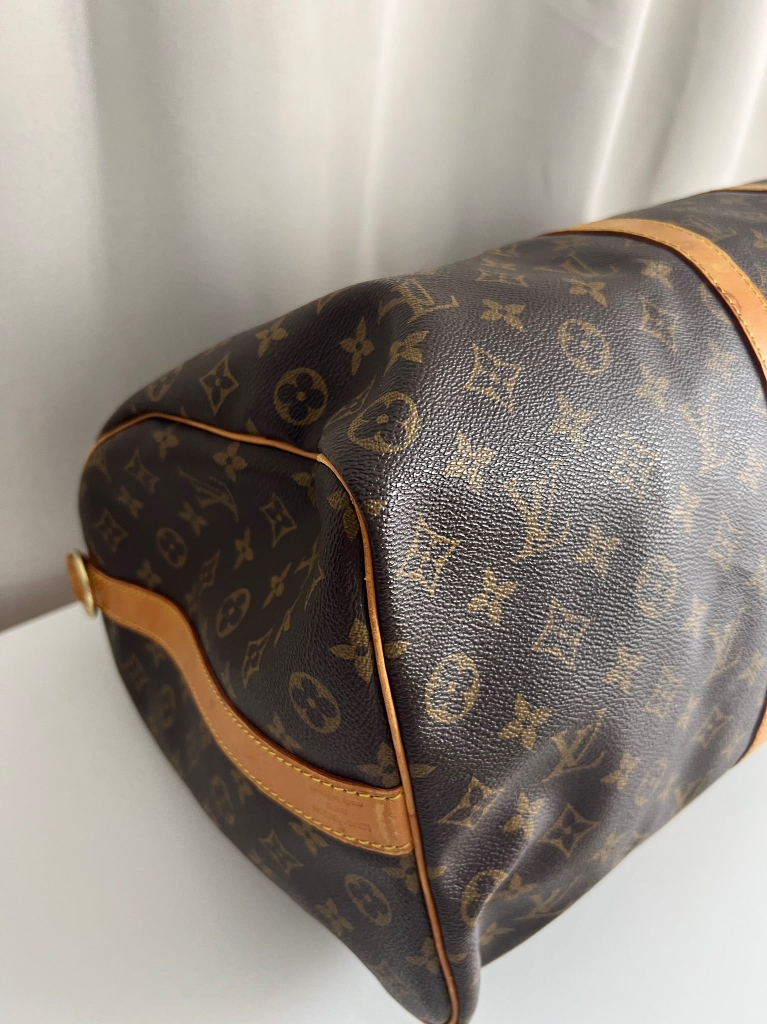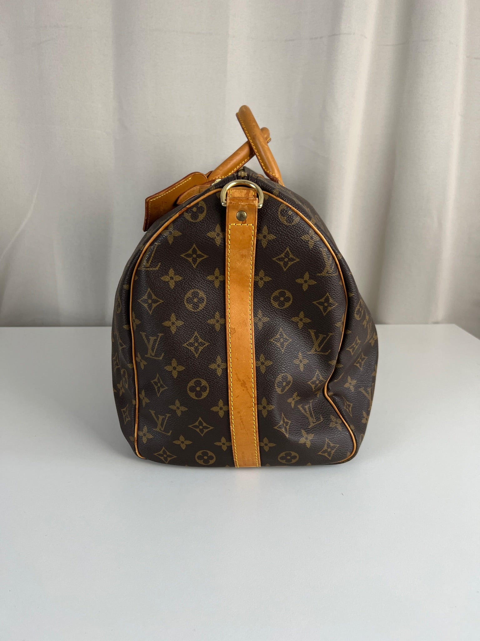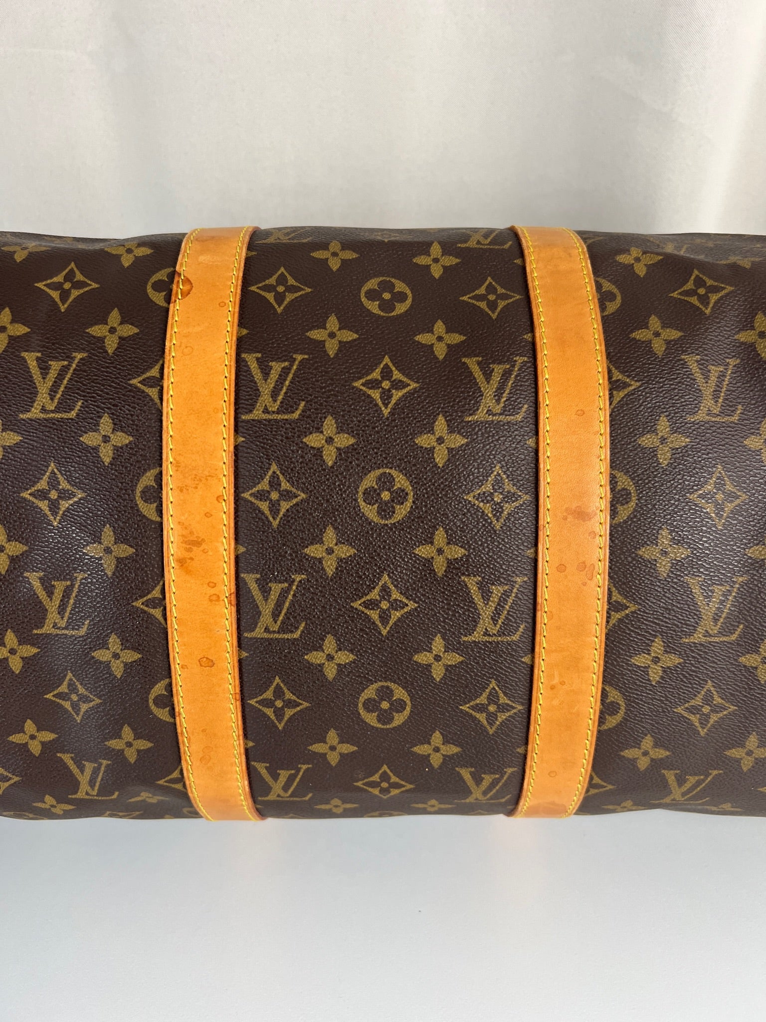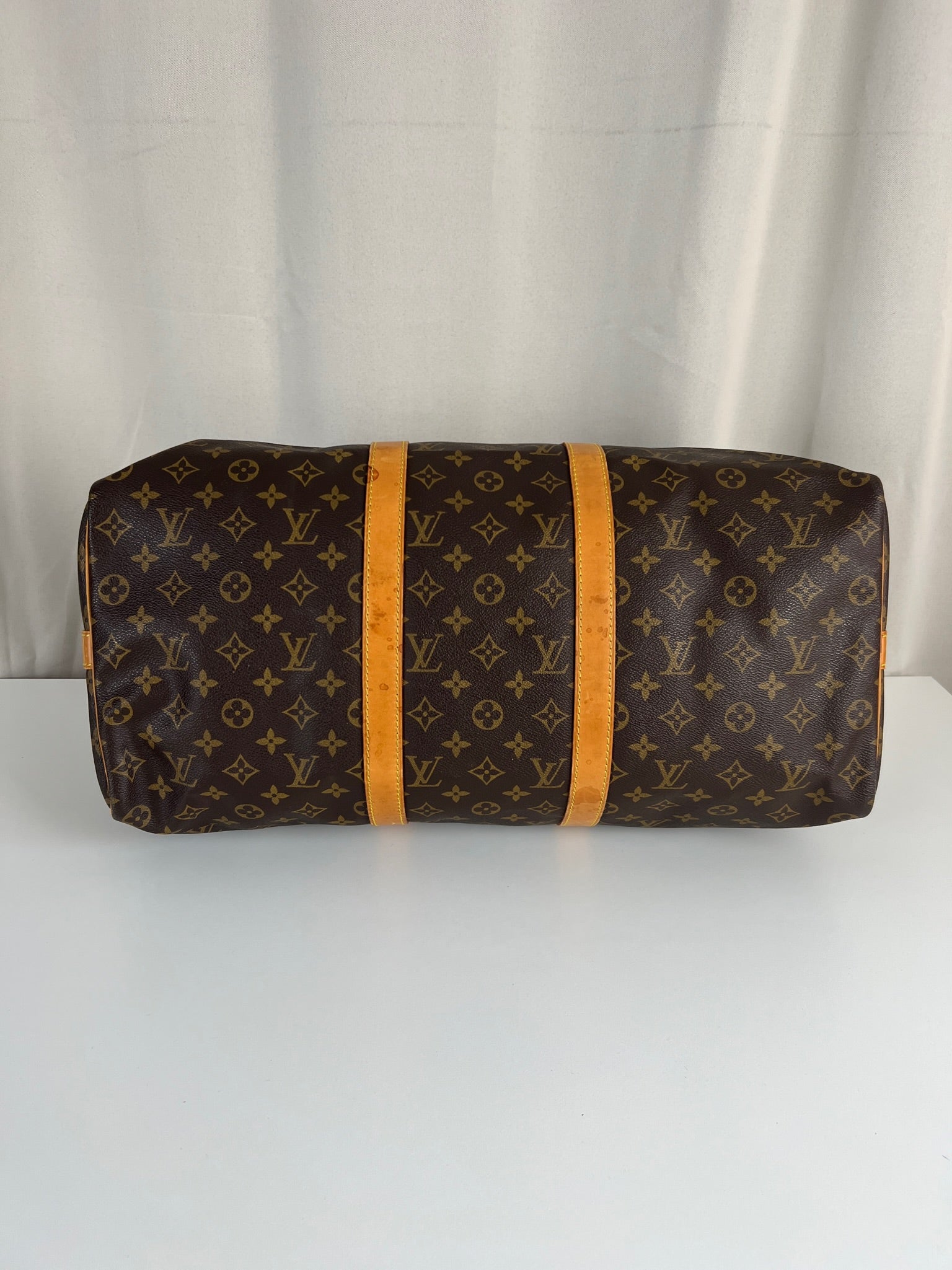 Ce Louis Vuitton Keepall 50 est en très bon état. La toile est en très bon état. Les parties en cuir sont tannées et présentent quelques taches. Les poignées sont en bon état. La bandoulière est en super état.