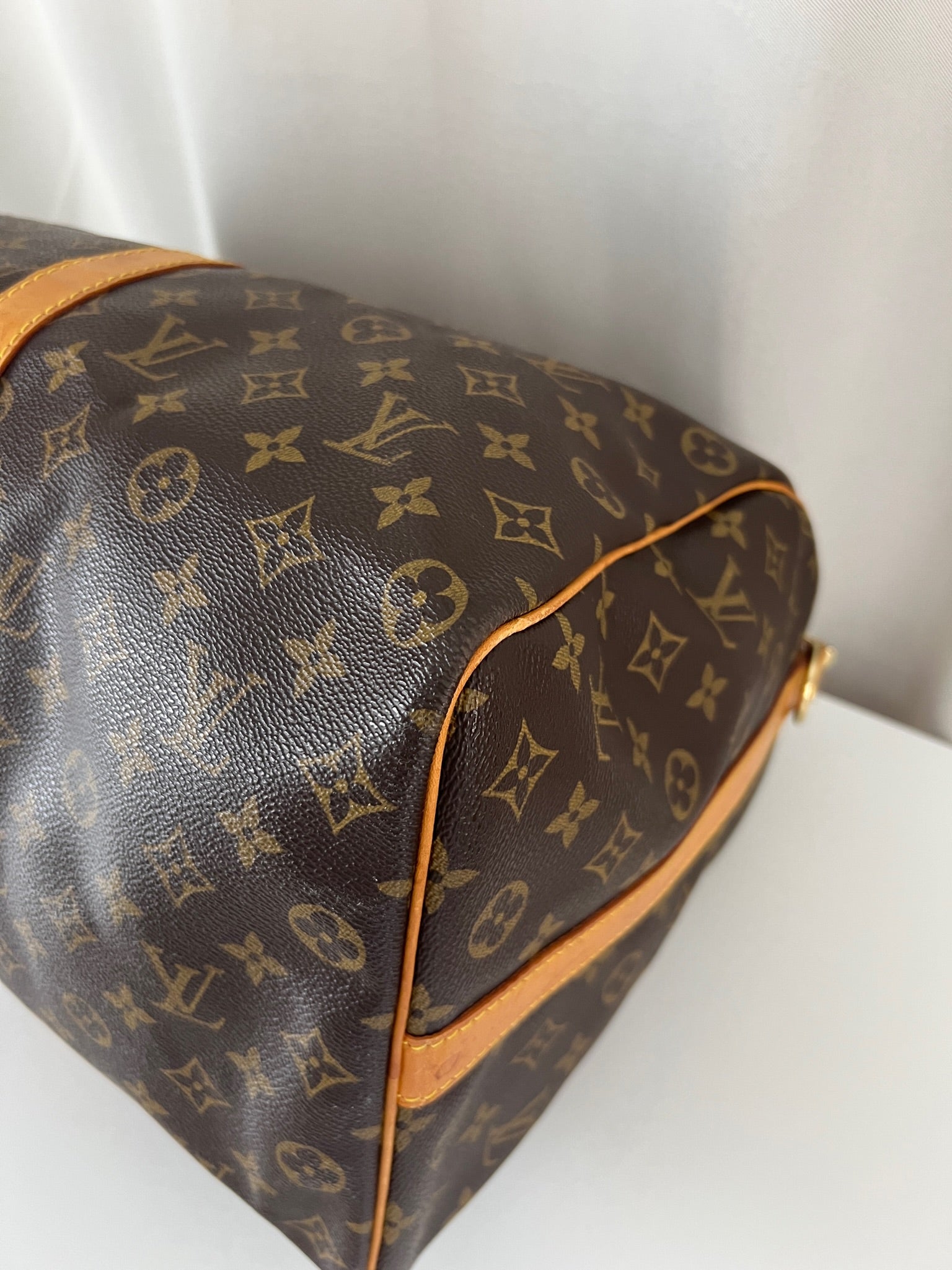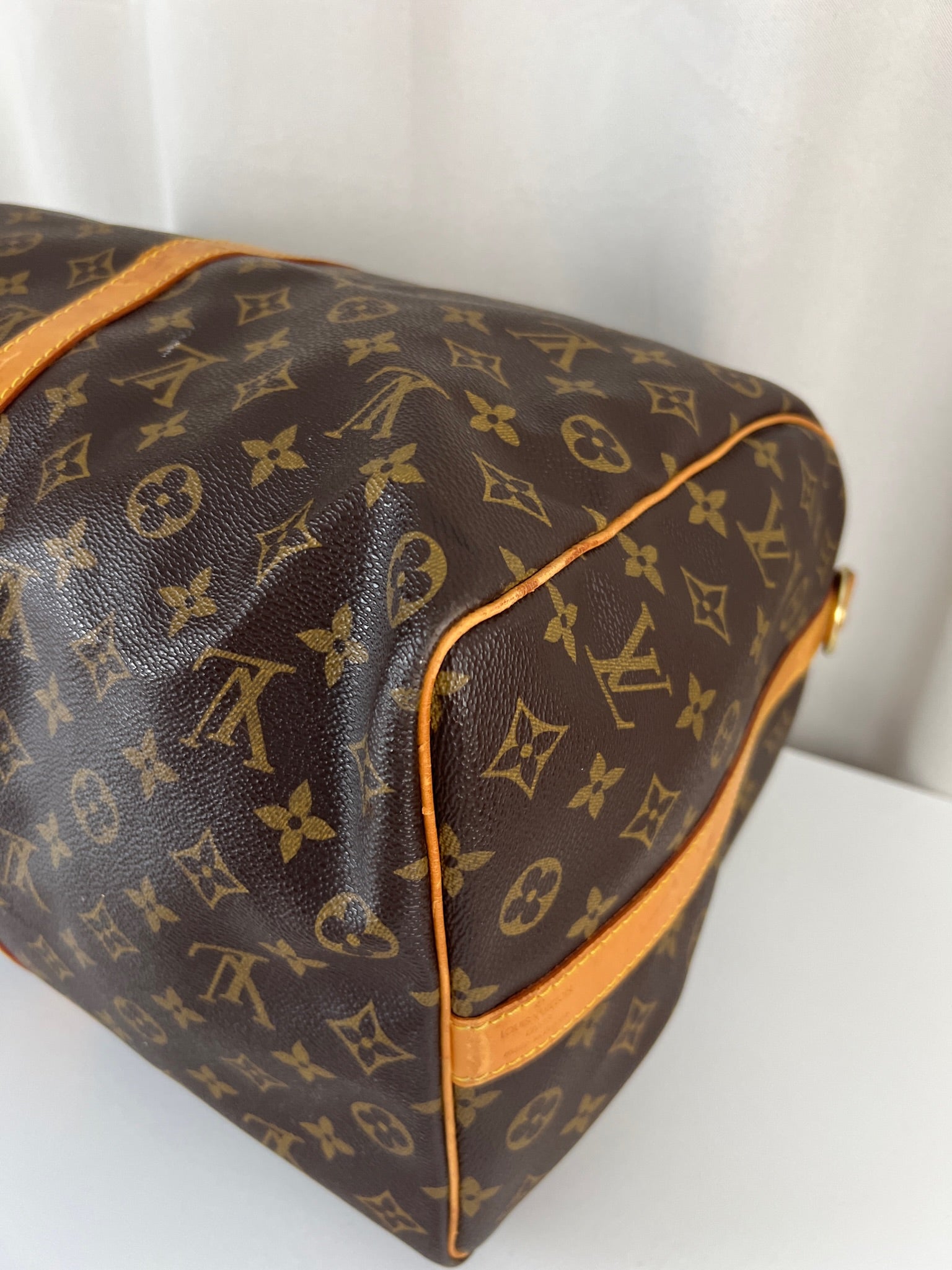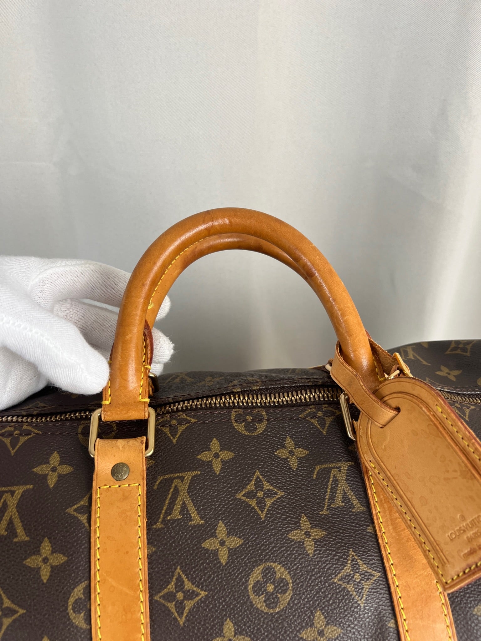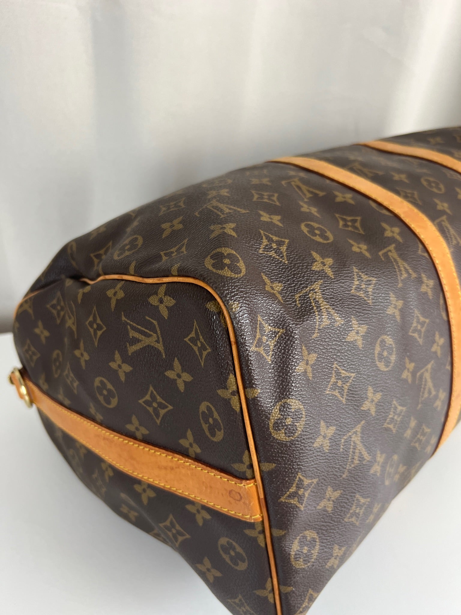Ce Louis Vuitton Keepall 50 est en très bon état. La toile est en très bon état. Les parties en cuir sont tannées et présentent quelques taches. Les poignées sont en bon état. La bandoulière est en super état.