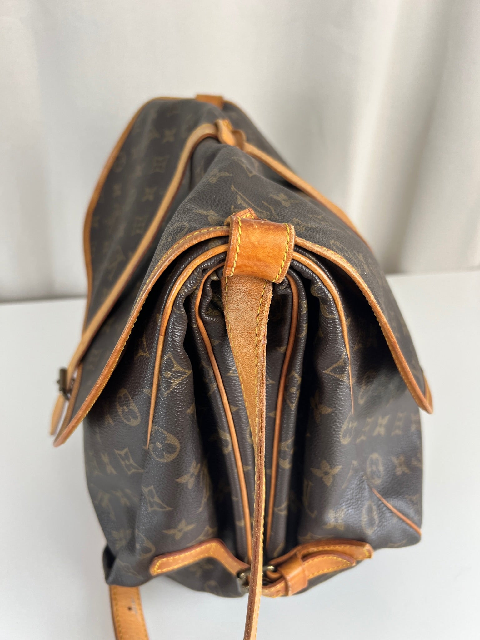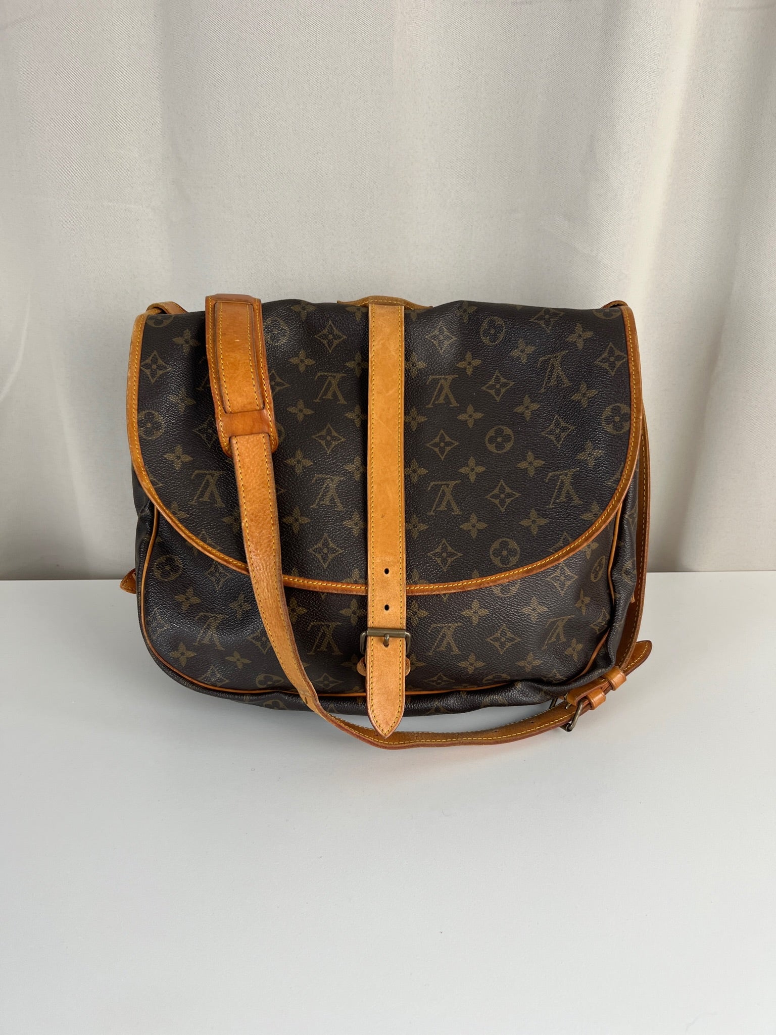 Ce Louis Vuitton Saumur 35 est en bon état. La toile est en très bon état. Les coins sont un peu frottés. Les parties en cuir sont tannées et présentent quelques traces d'usure. Le bracelet est en bon état. L'intérieur est en bon état.