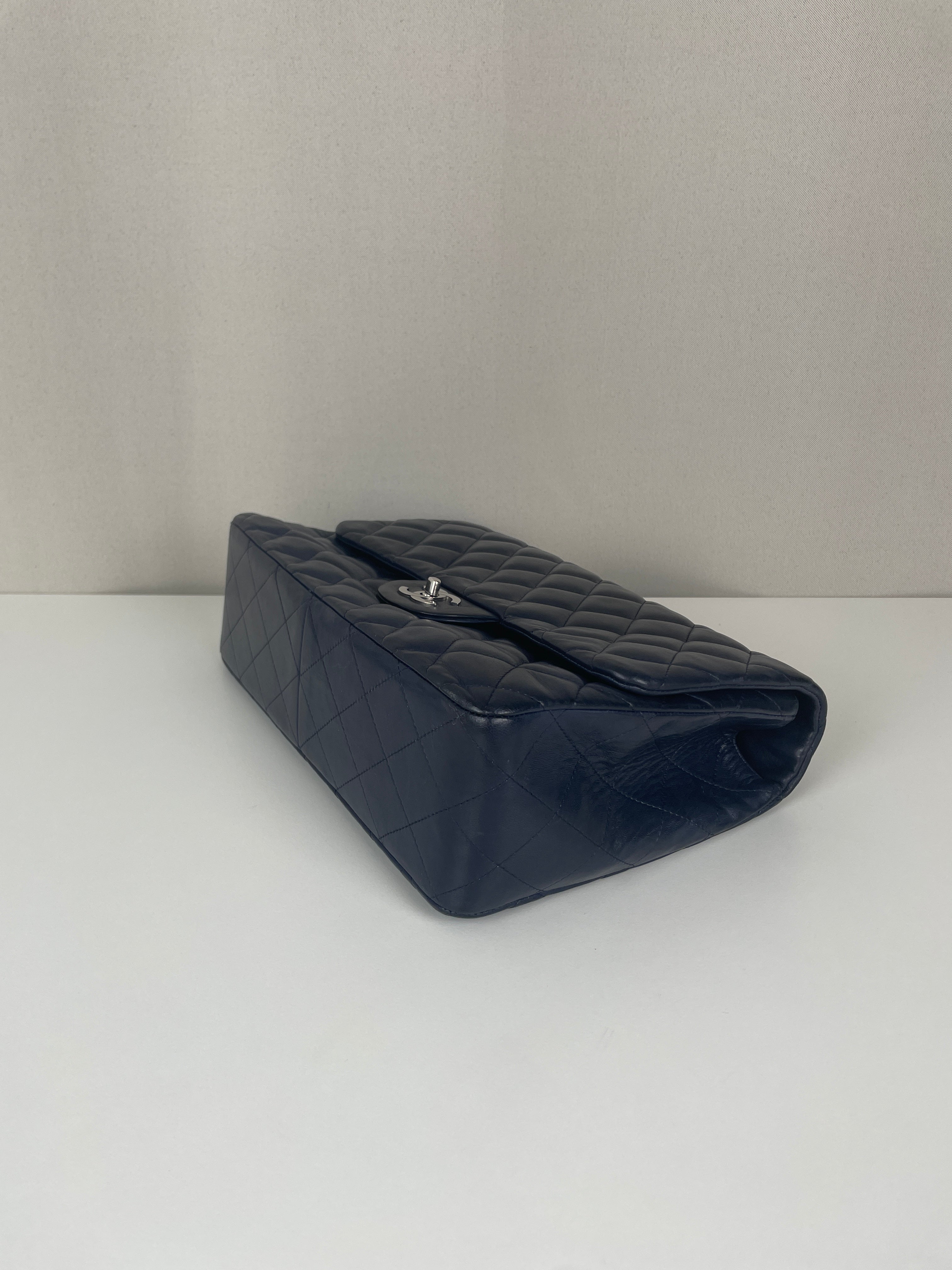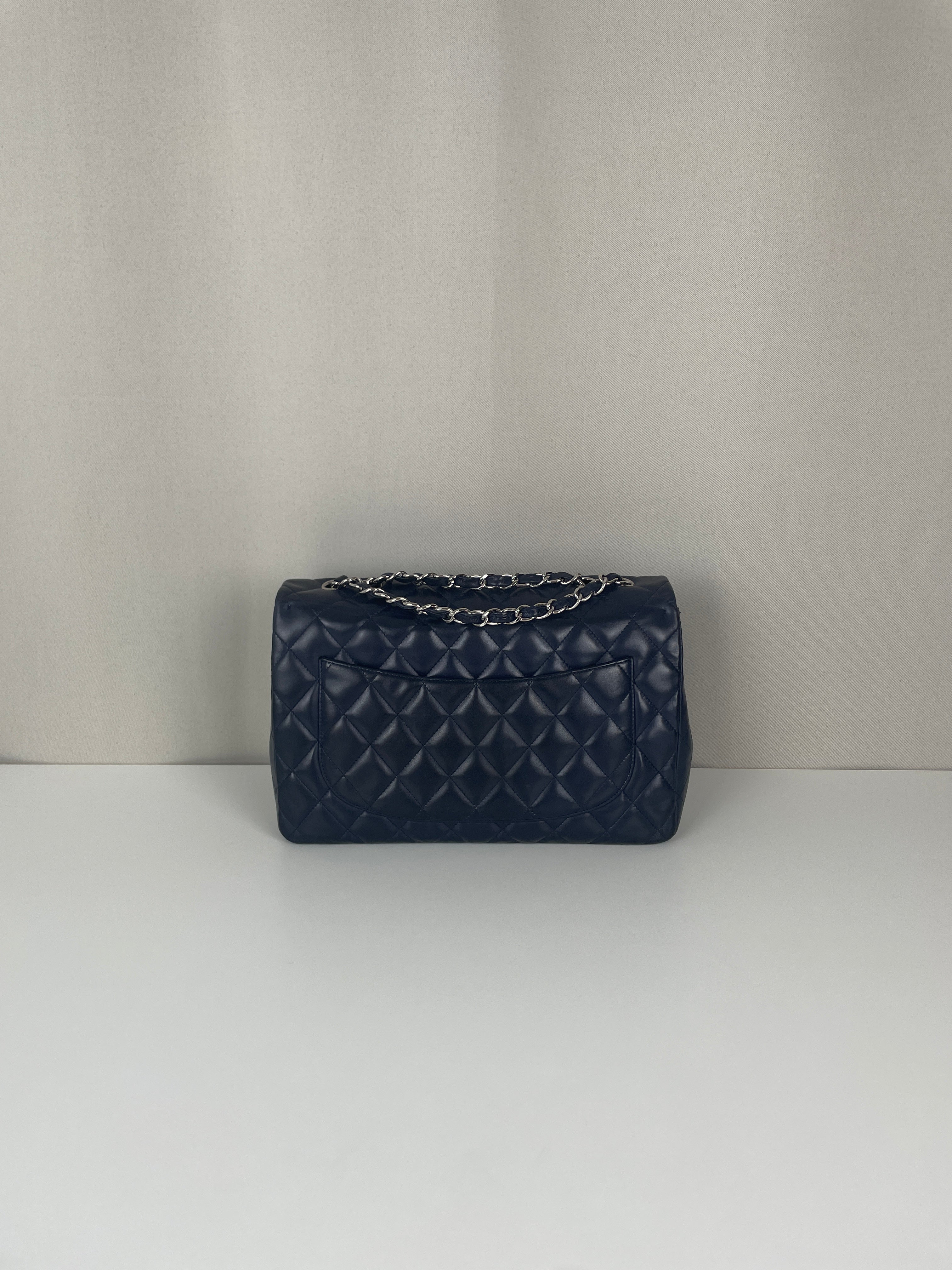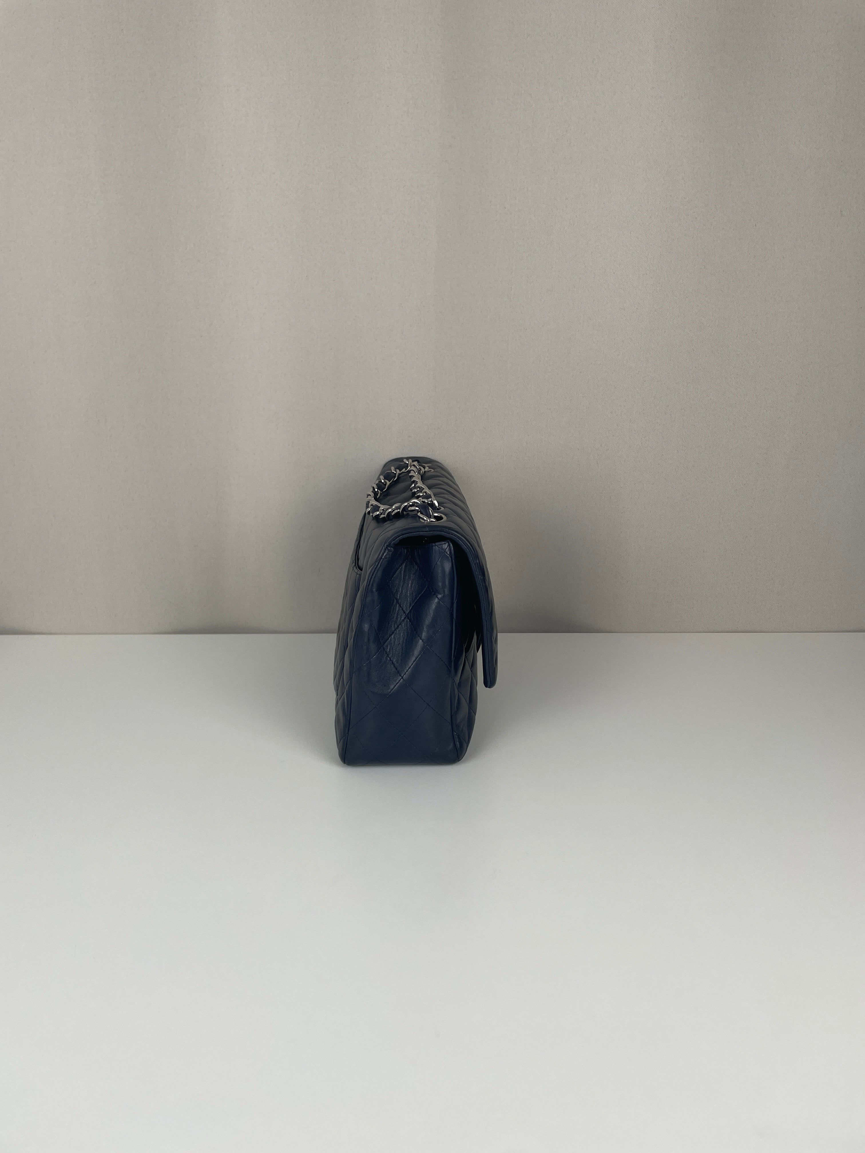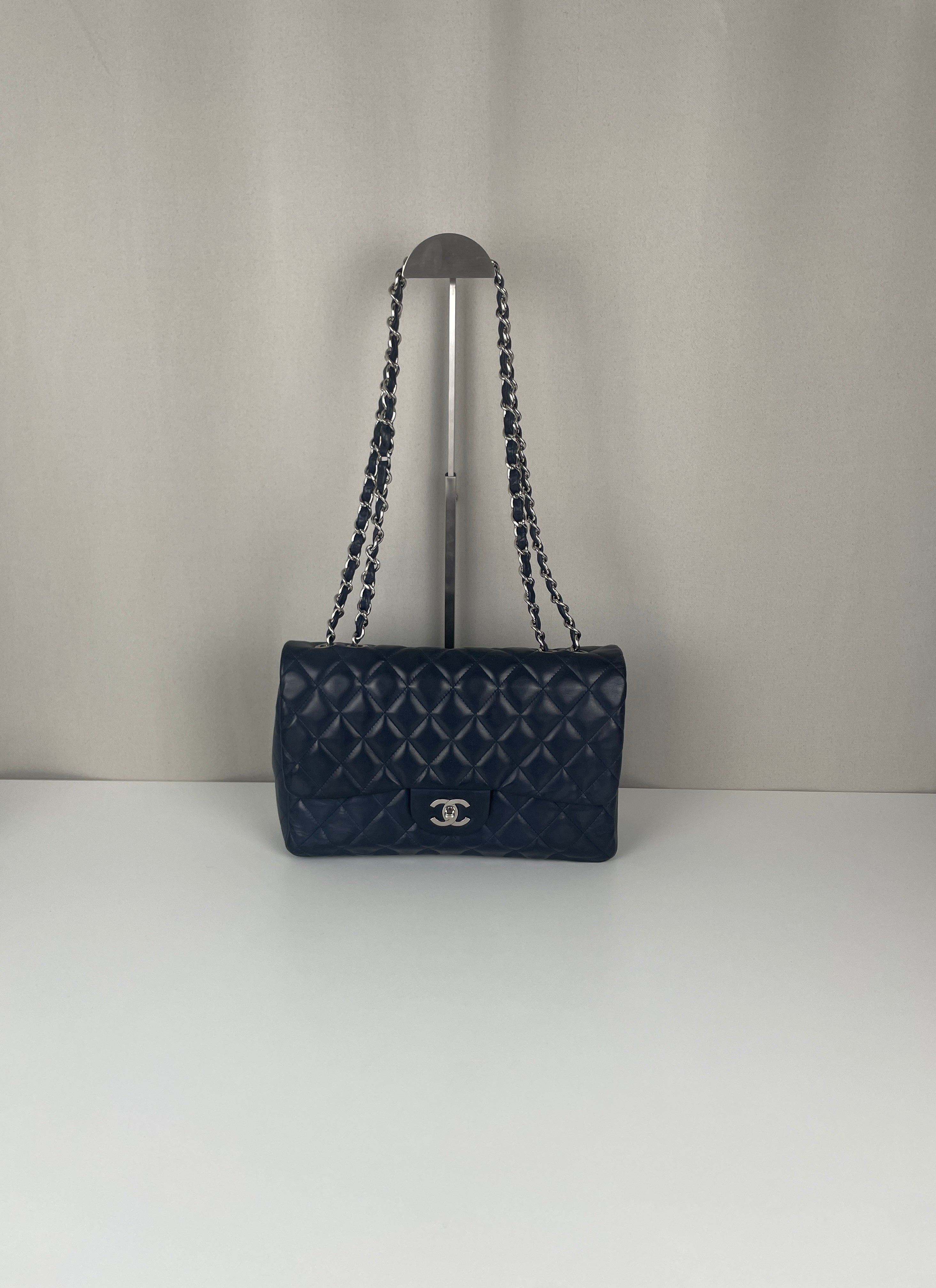 Ce Chanel Jumbo en cuir bleu marine est un classique de la collection 2005–2006. On retrouve tout le charme iconique de la maison avec son matelassage, sa double rabat et sa bijouterie argentée. Sa taille est parfaite pour un usage quotidien chic ou des occasions plus habillées. Un modèle emblématique et un excellent investissement mode.