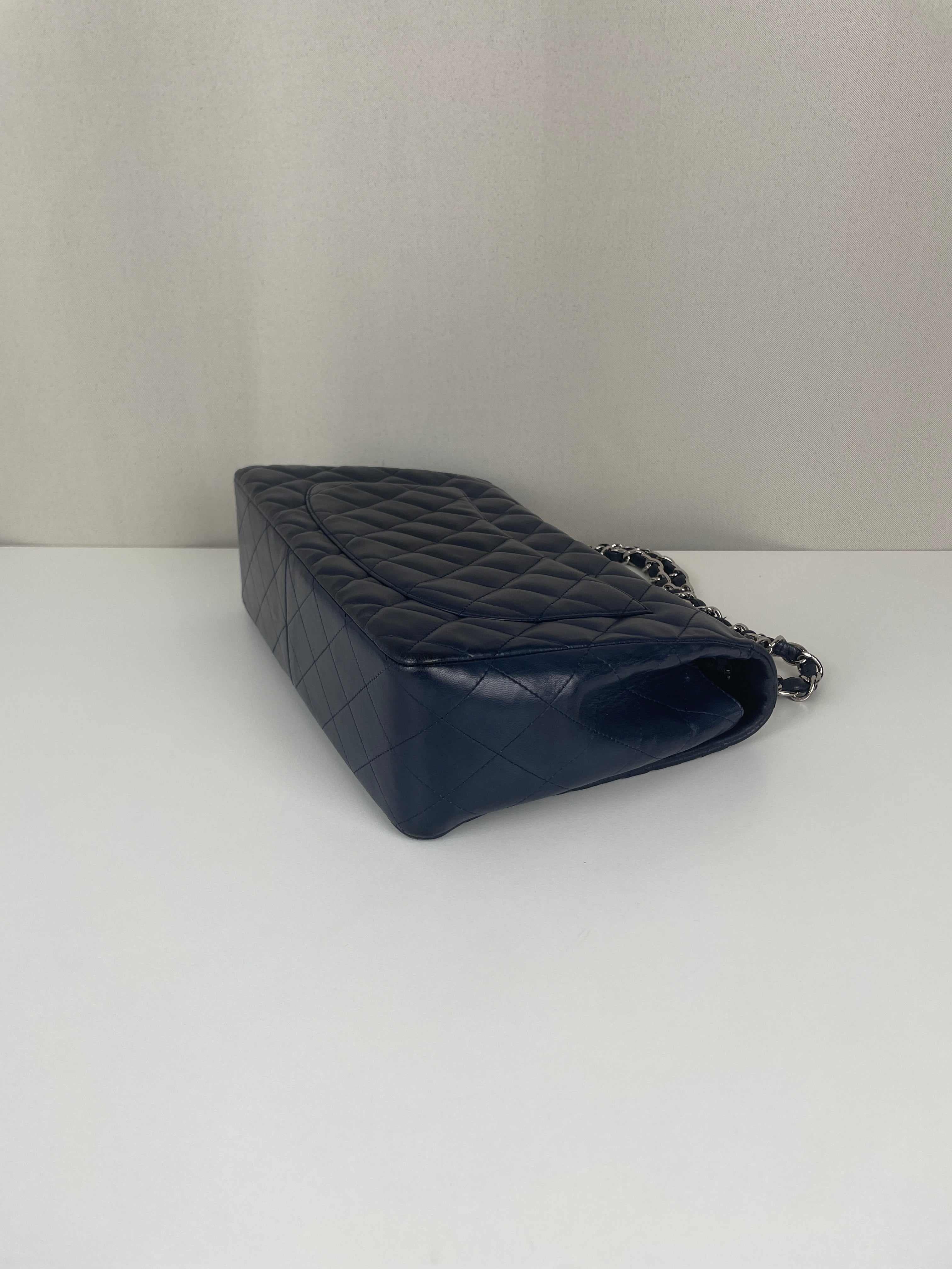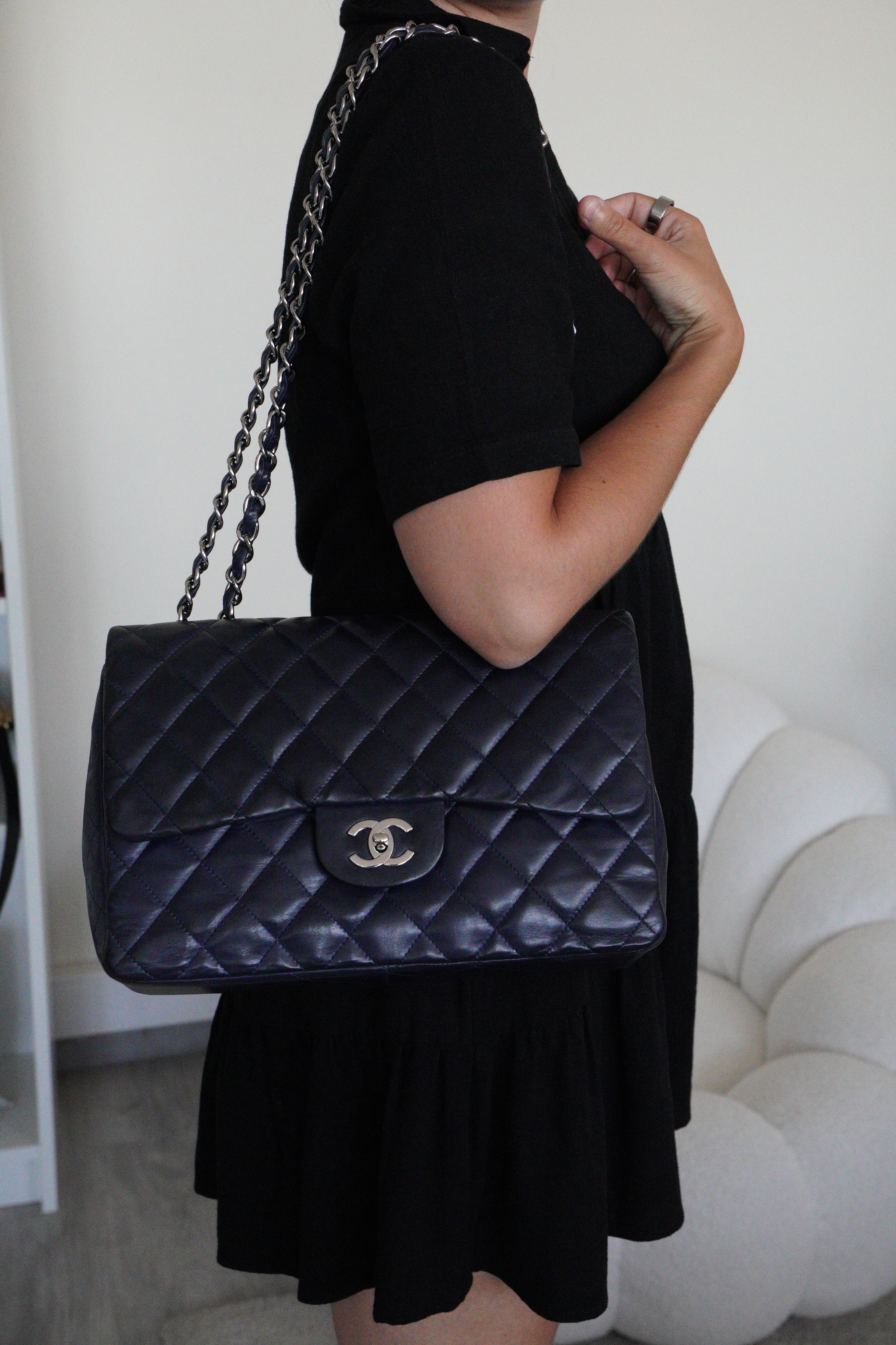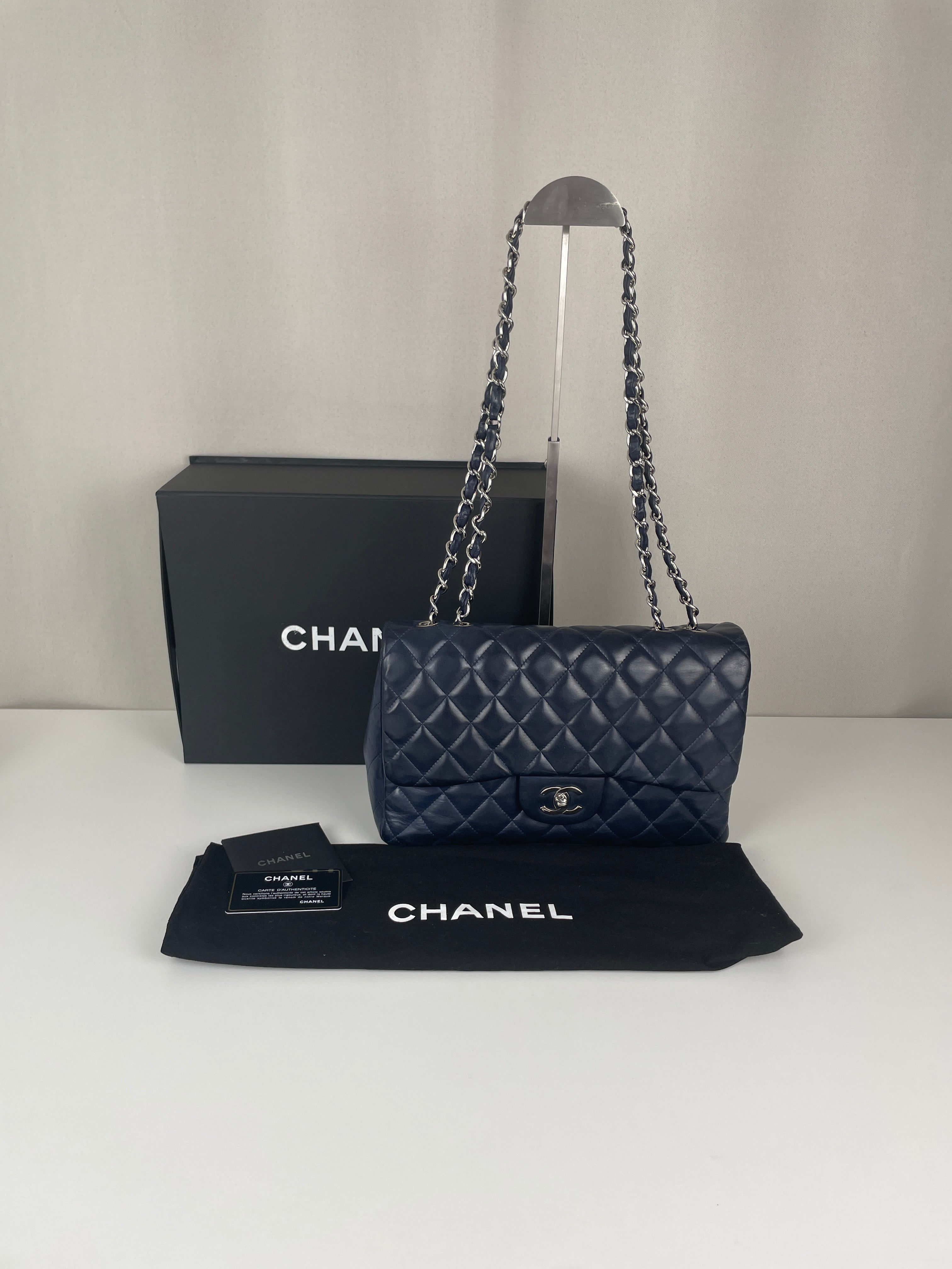 Ce Chanel Jumbo en cuir bleu marine est un classique de la collection 2005–2006. On retrouve tout le charme iconique de la maison avec son matelassage, sa double rabat et sa bijouterie argentée. Sa taille est parfaite pour un usage quotidien chic ou des occasions plus habillées. Un modèle emblématique et un excellent investissement mode.