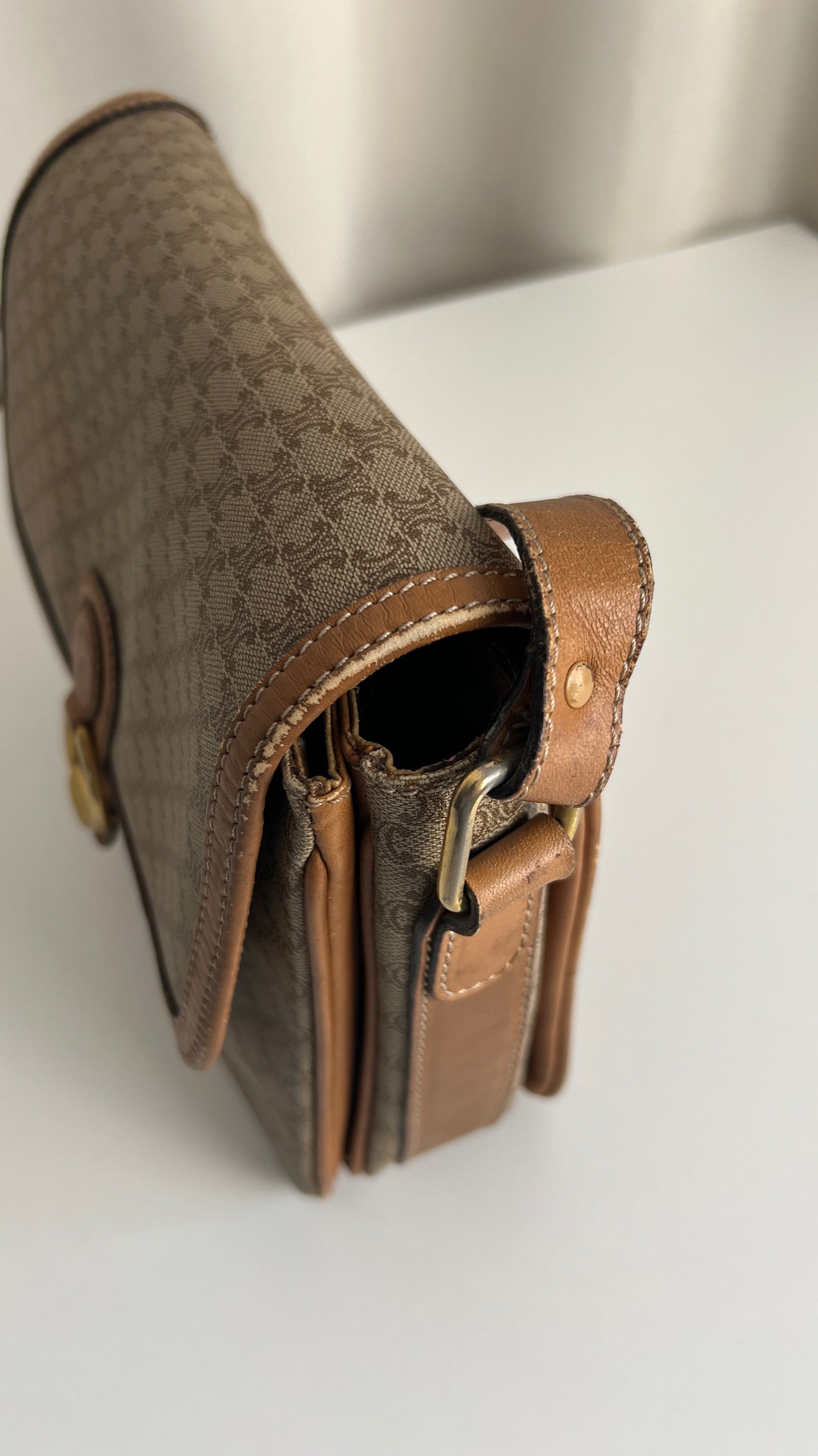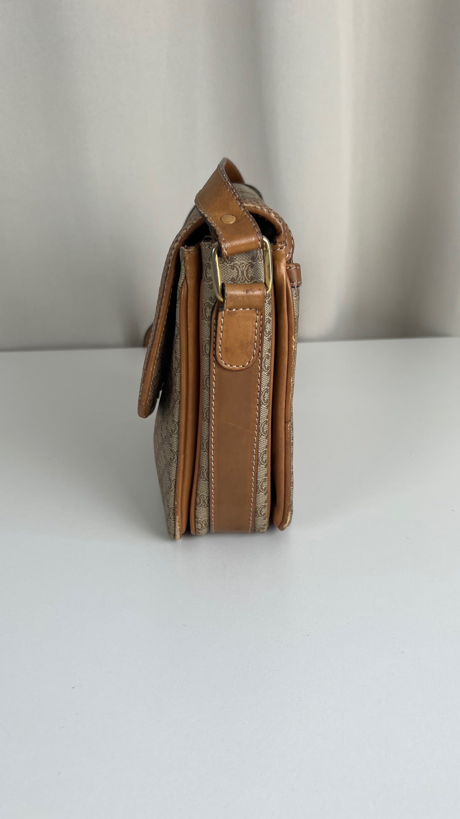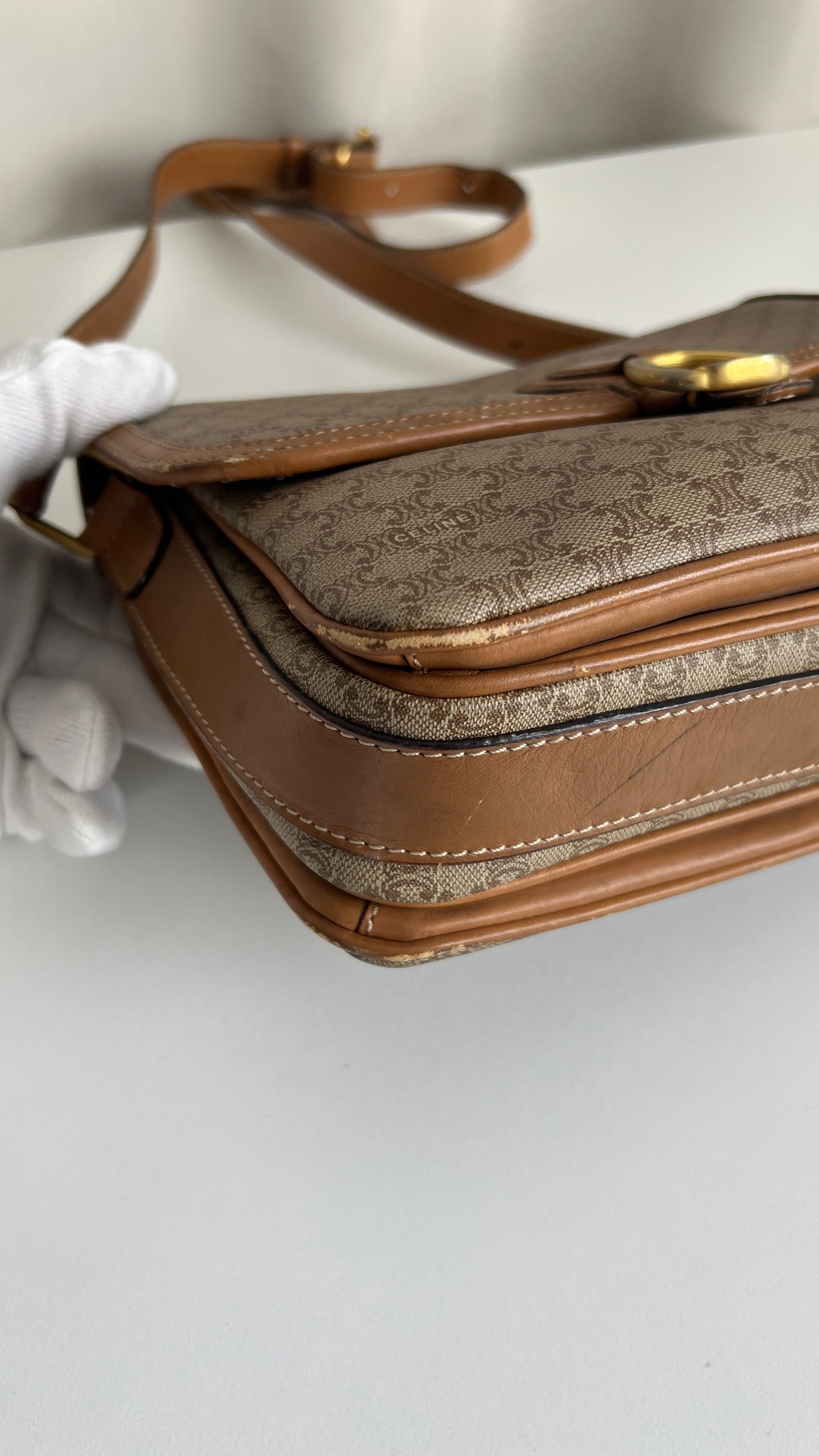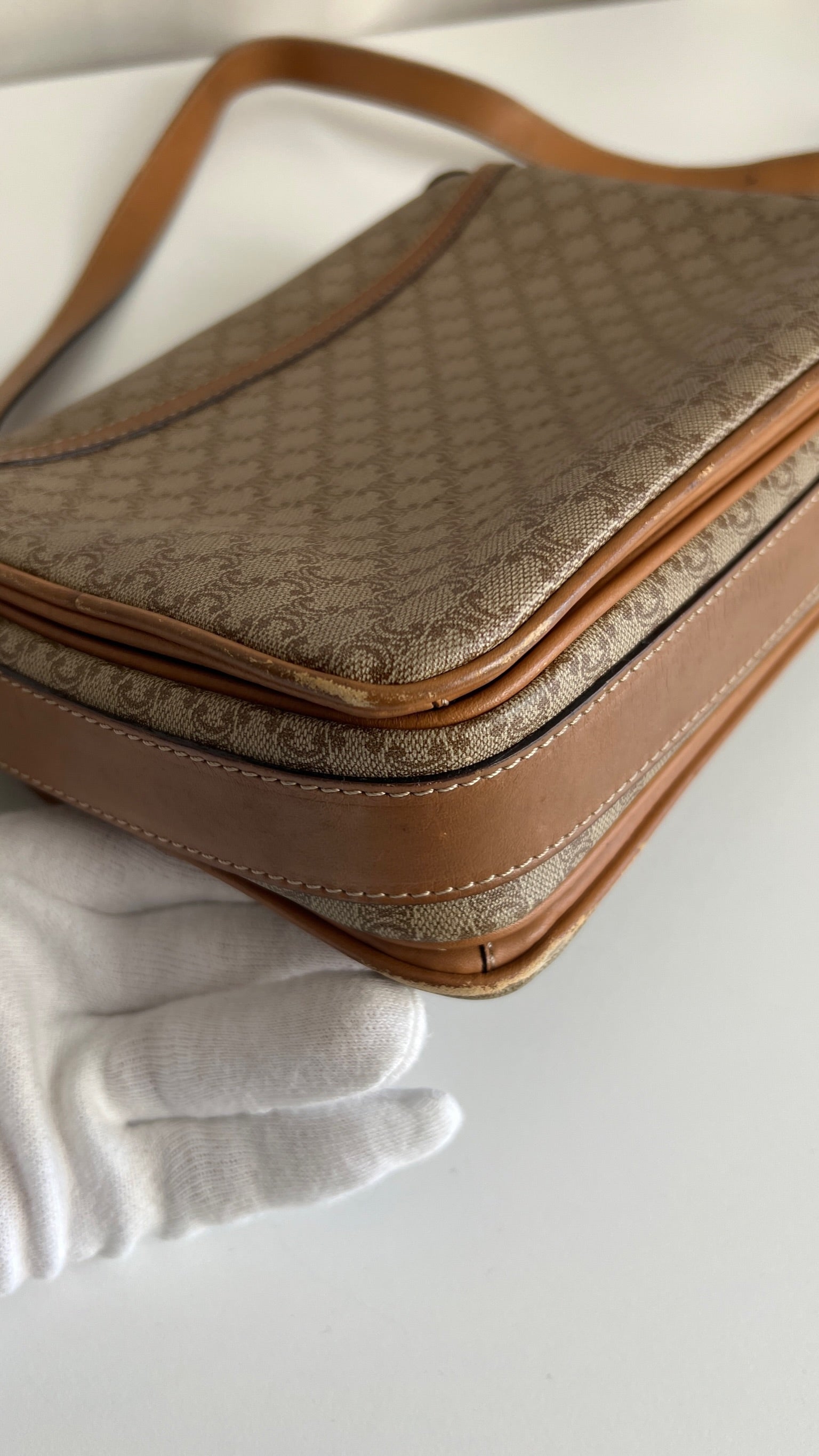 Ce sac Céline est en bon état. Le cuir présente des traces d'usure, les coins sont frottés, la bandoulière est en bon état. Le sac a été utilisé mais est toujours en bon état. La toile est en très bon état. L'intérieur est également en très bon état, aucune tache. La bijouterie est un peu usé suite à une utilisation normale. Vous disposez d'une poche zippée à l'intérieur du sac.
