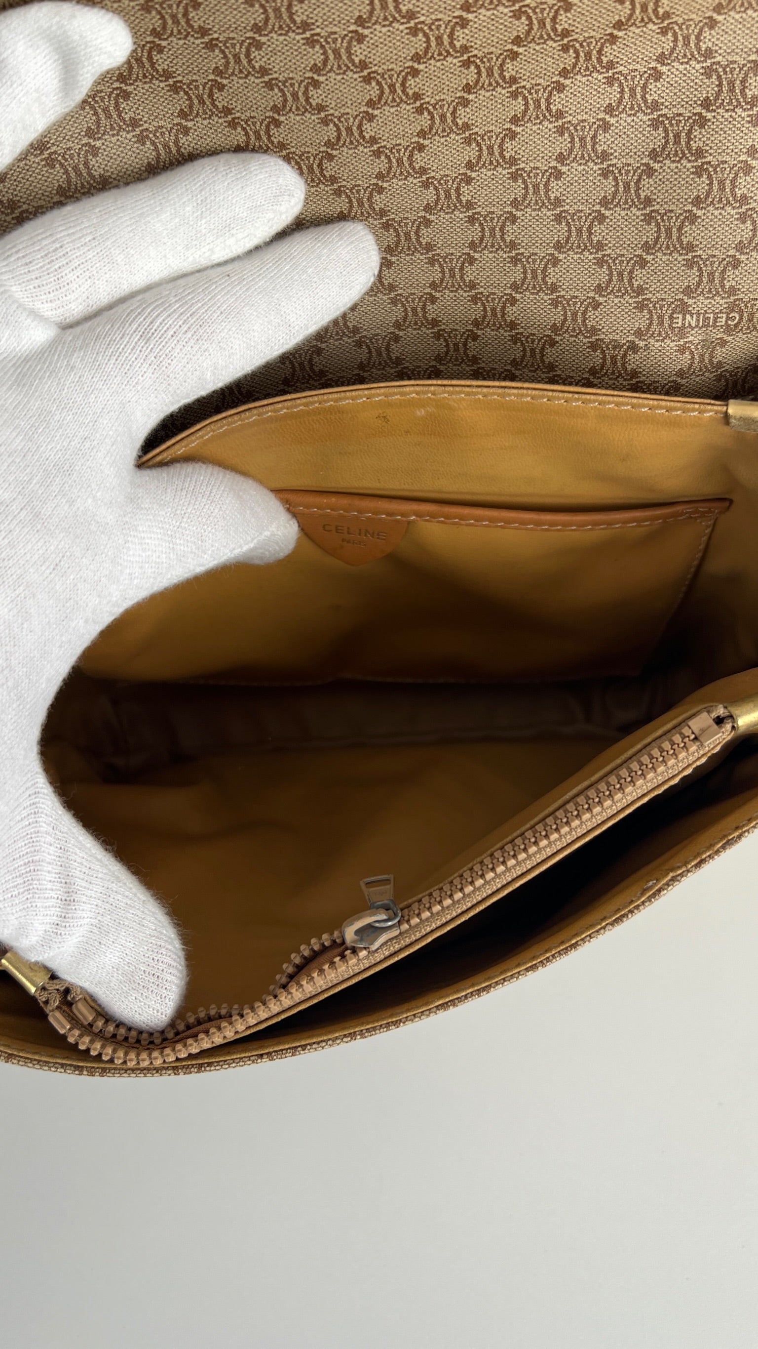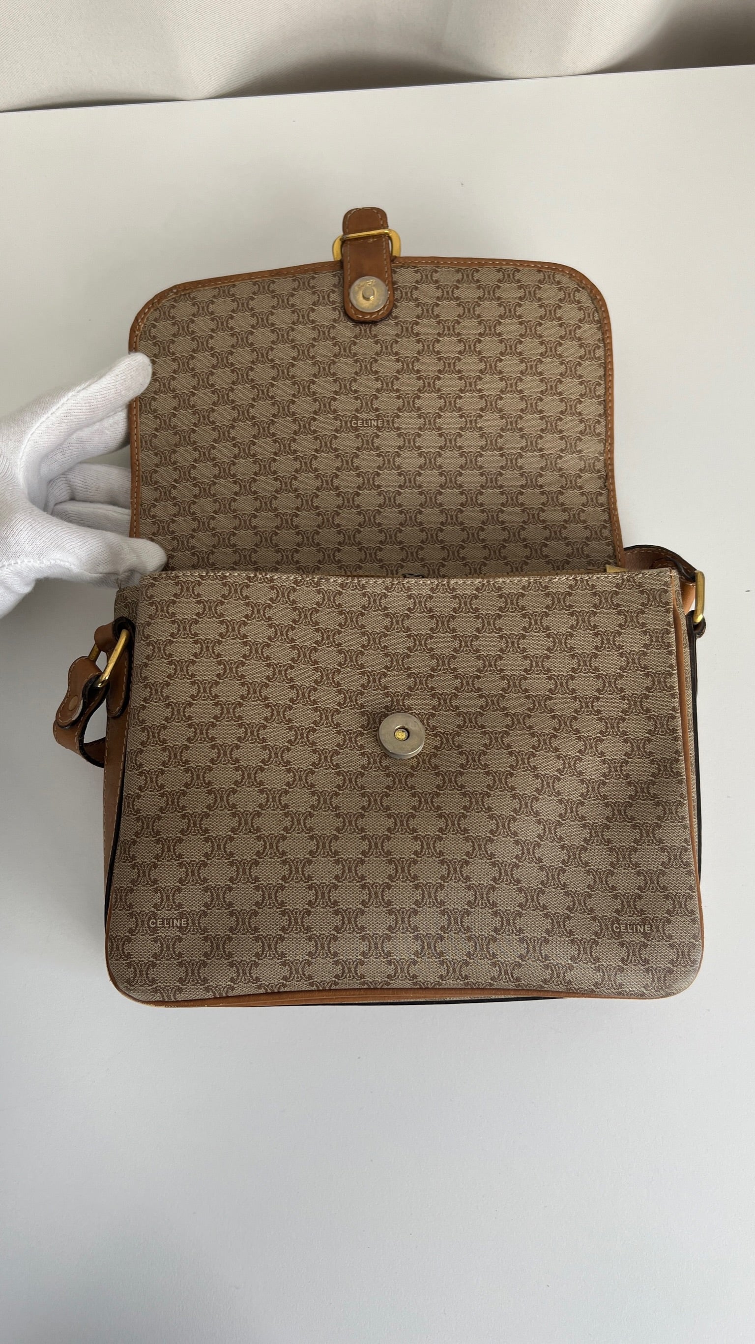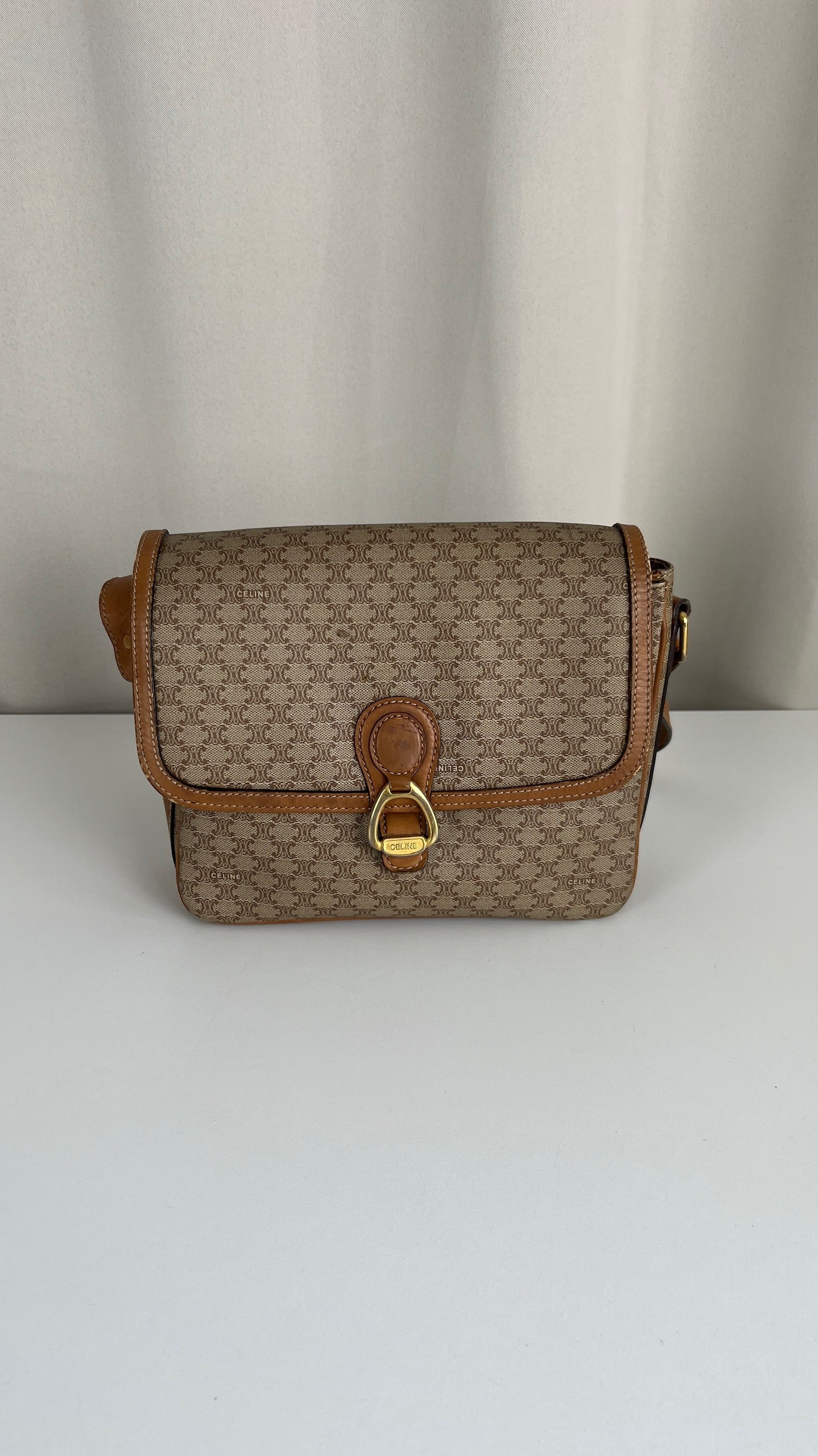 Ce sac Céline est en bon état. Le cuir présente des traces d'usure, les coins sont frottés, la bandoulière est en bon état. Le sac a été utilisé mais est toujours en bon état. La toile est en très bon état. L'intérieur est également en très bon état, aucune tache. La bijouterie est un peu usé suite à une utilisation normale. Vous disposez d'une poche zippée à l'intérieur du sac.
