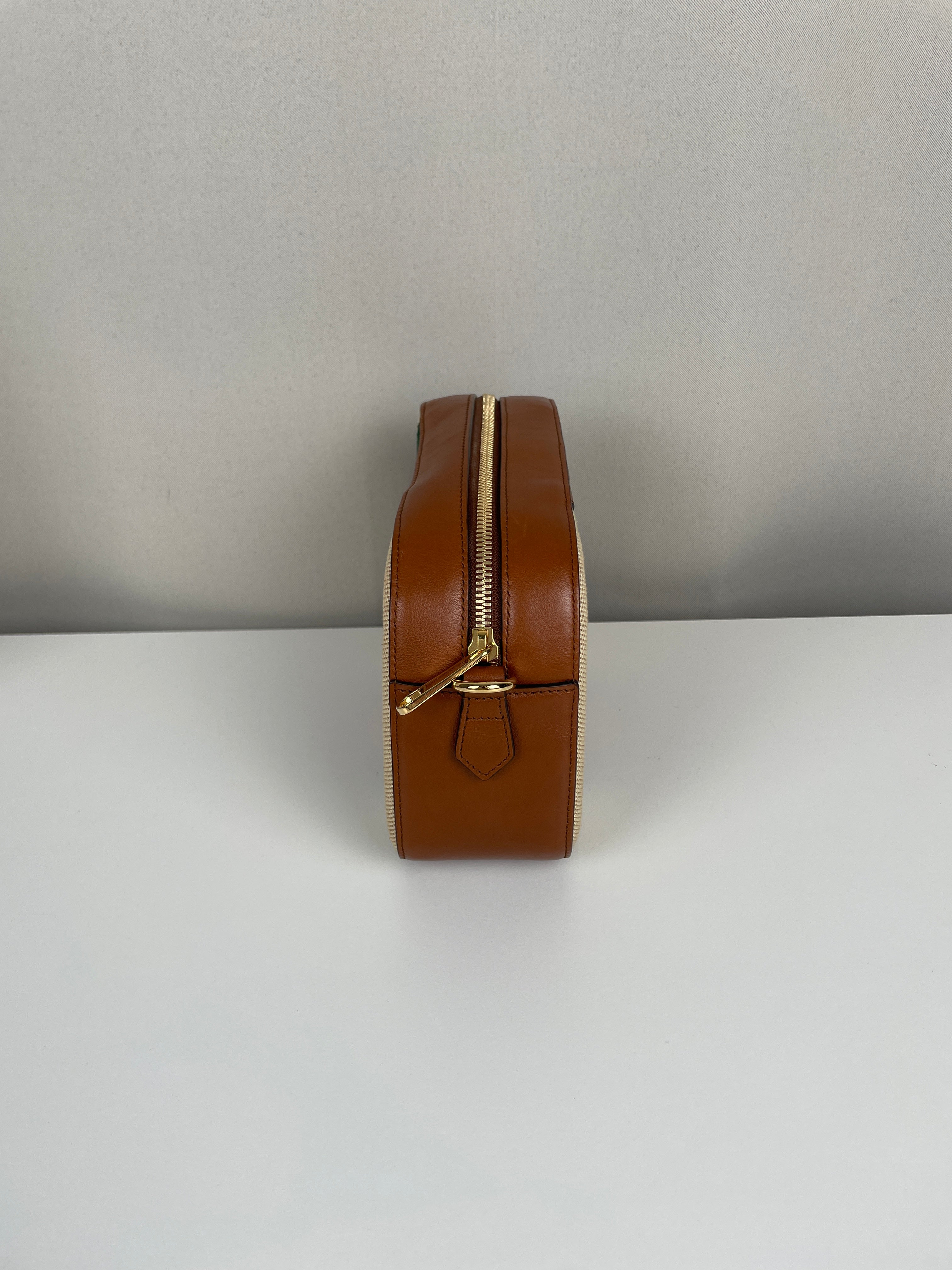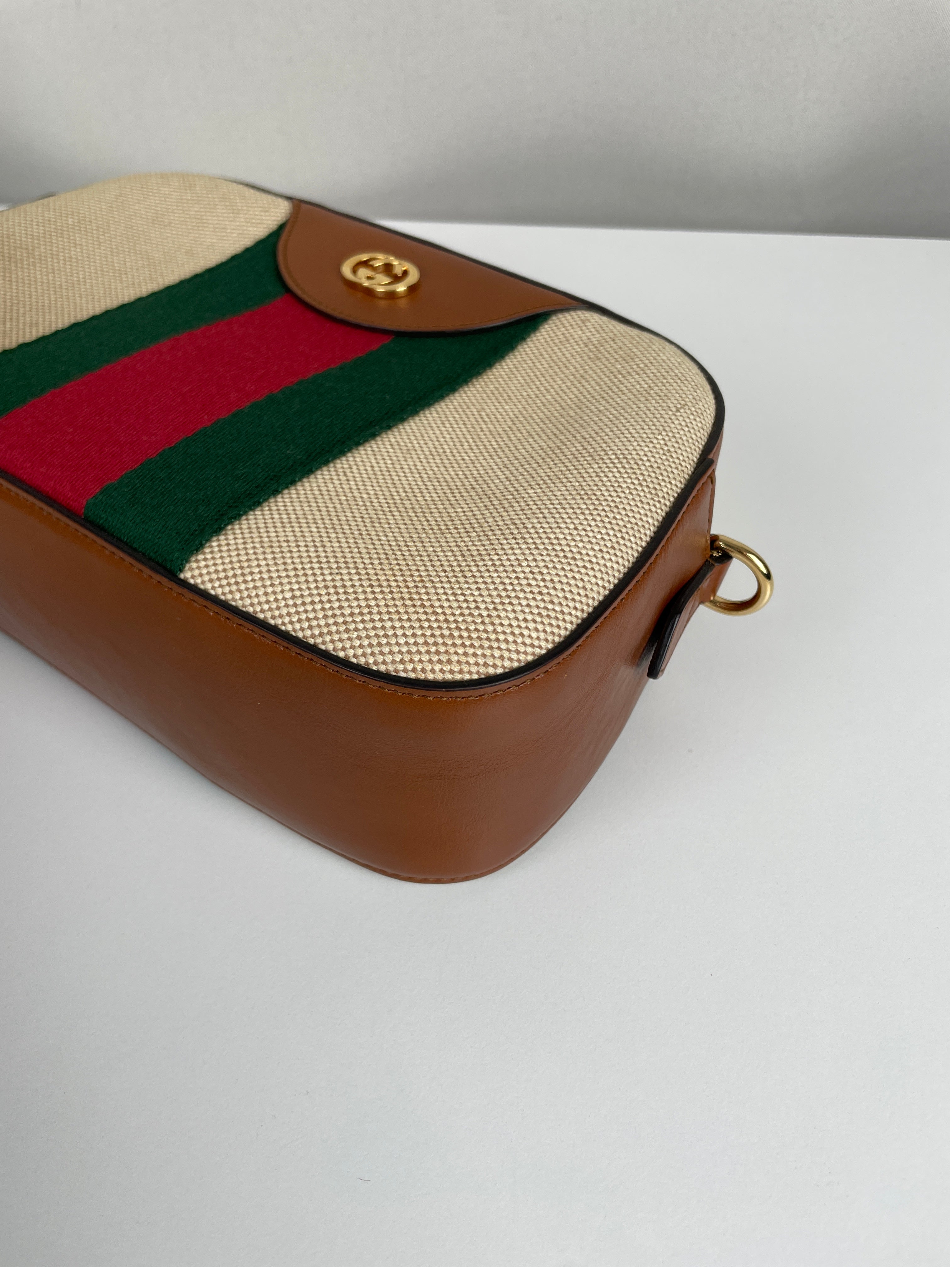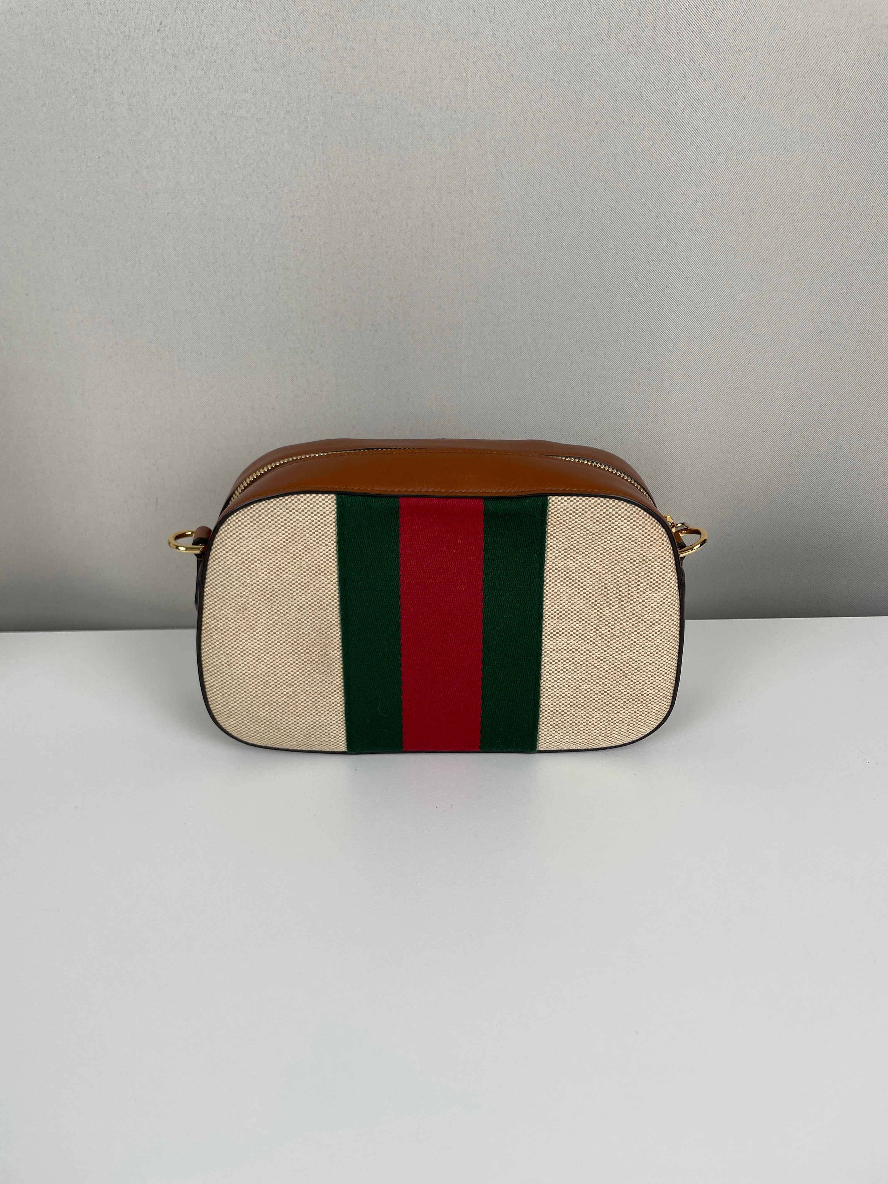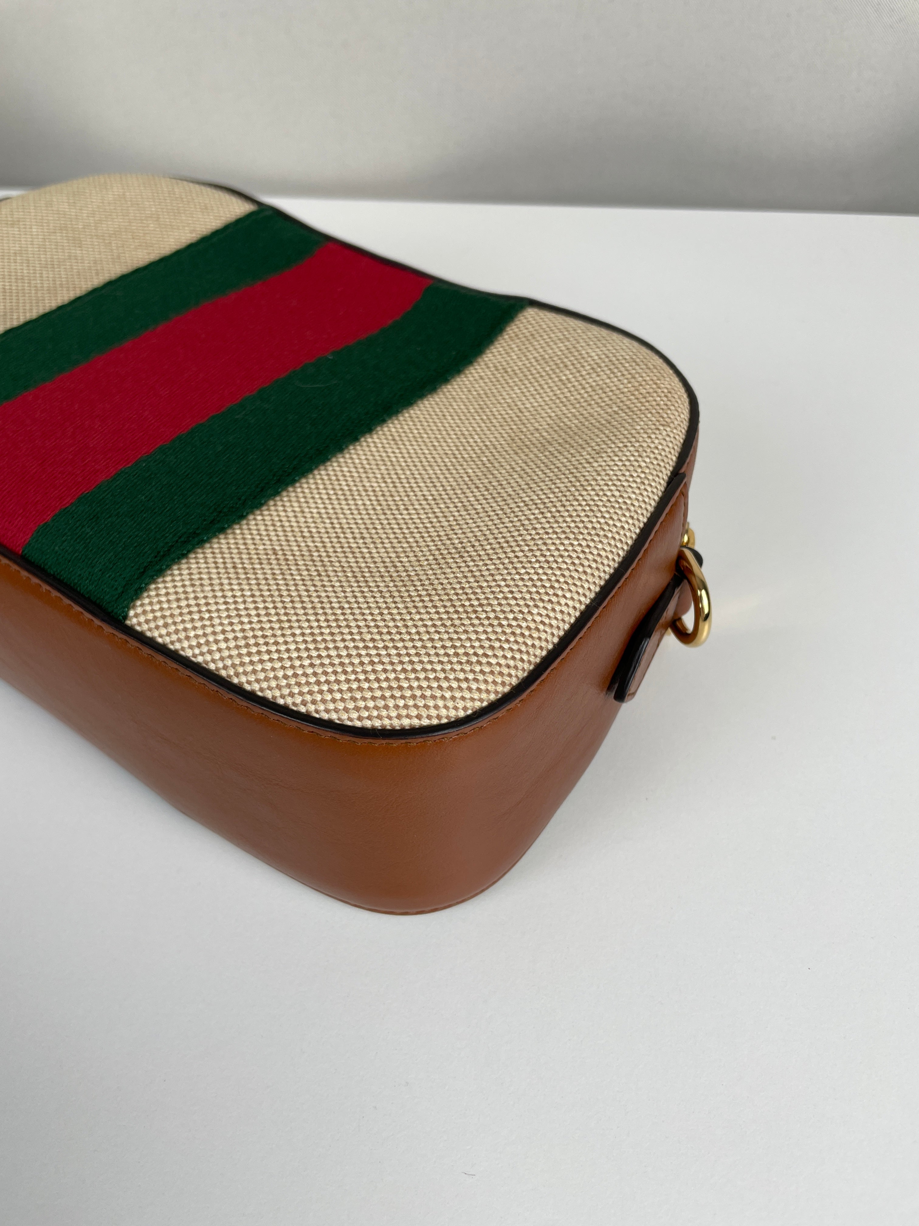 Ce sac Gucci Camera Bag est en très bon état. Le cuir est en très bon état. La toile est en très bon état. La bijouterie est en très bon état. L'intérieur est en très bon état. Comme neuf.