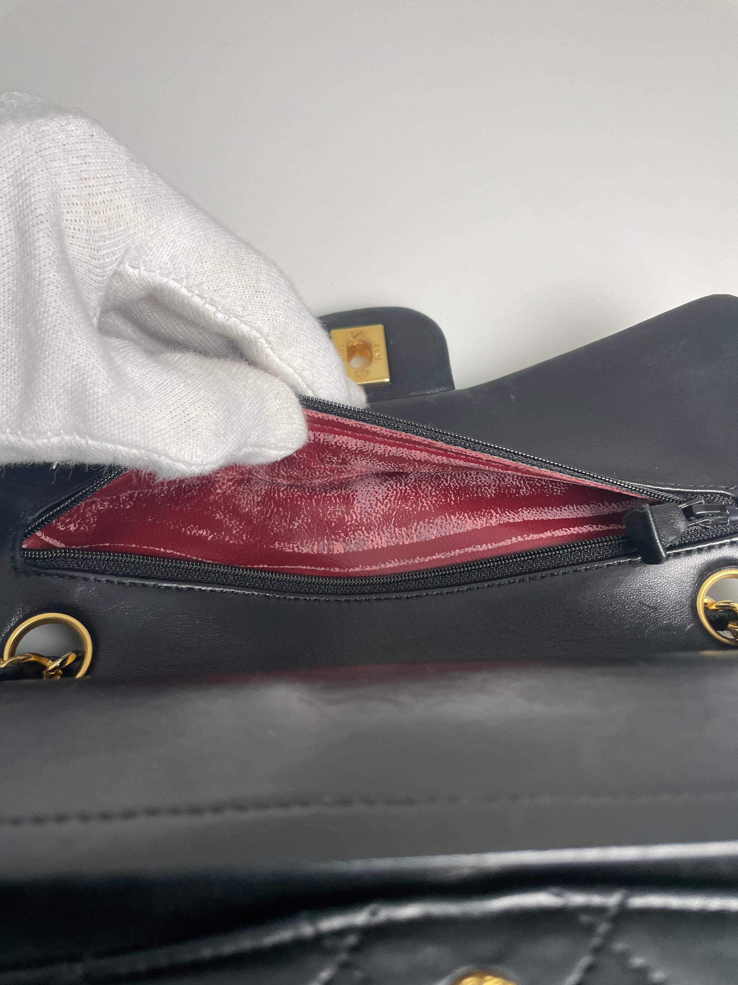 • Intérieur: Bon état, intérieur du rabat endommagé (la petite pochette en haut, voir dernière photo)