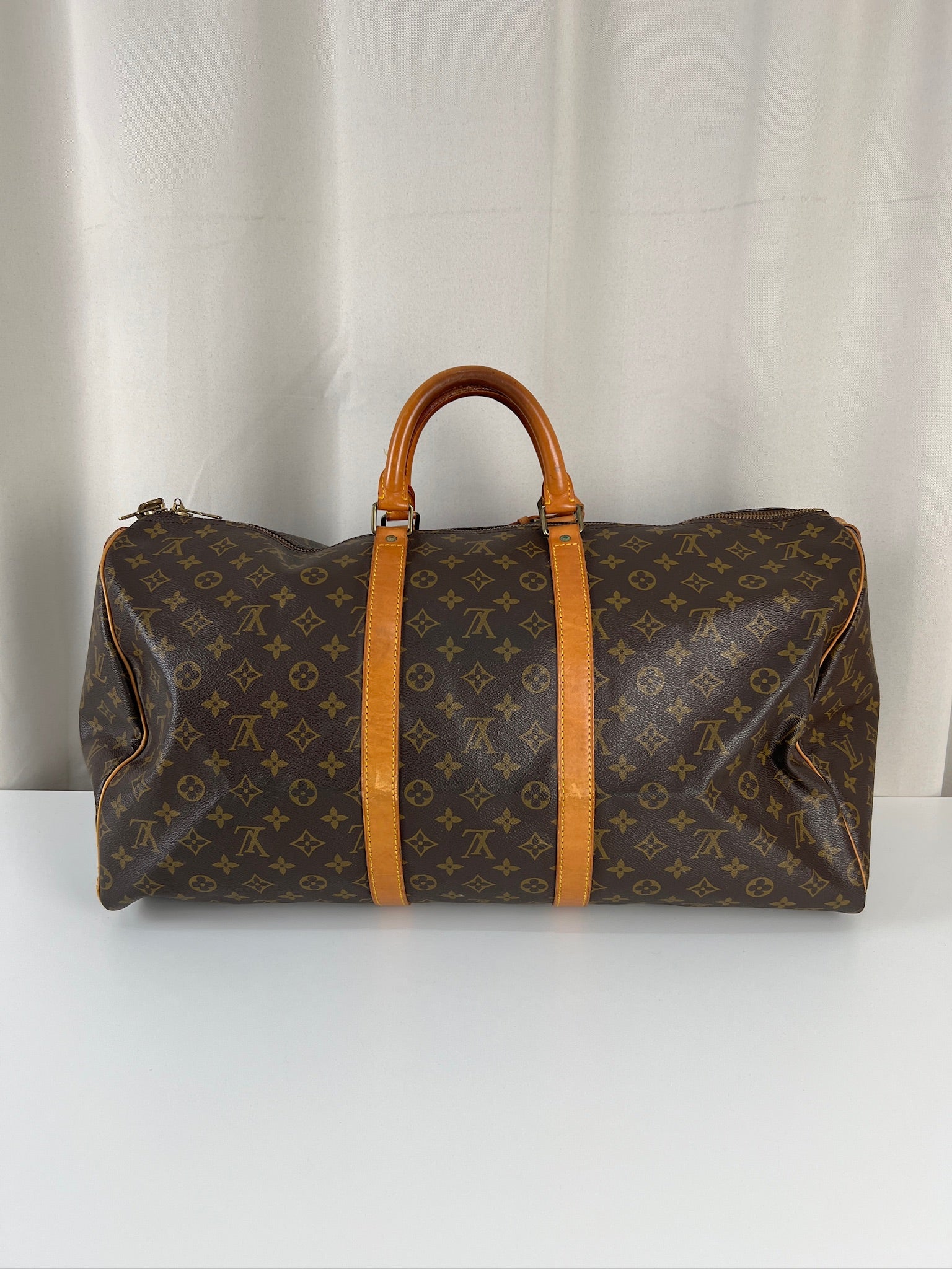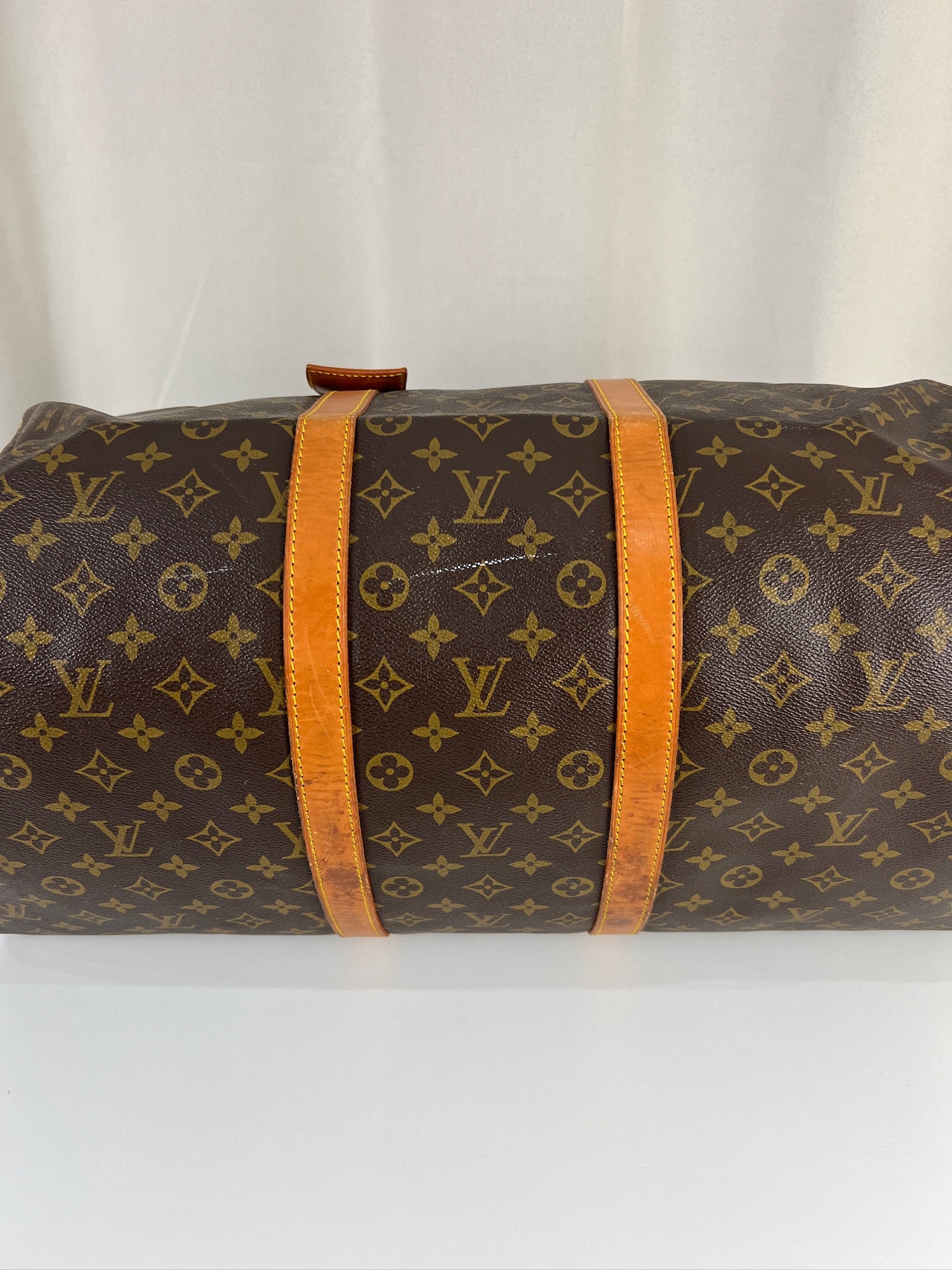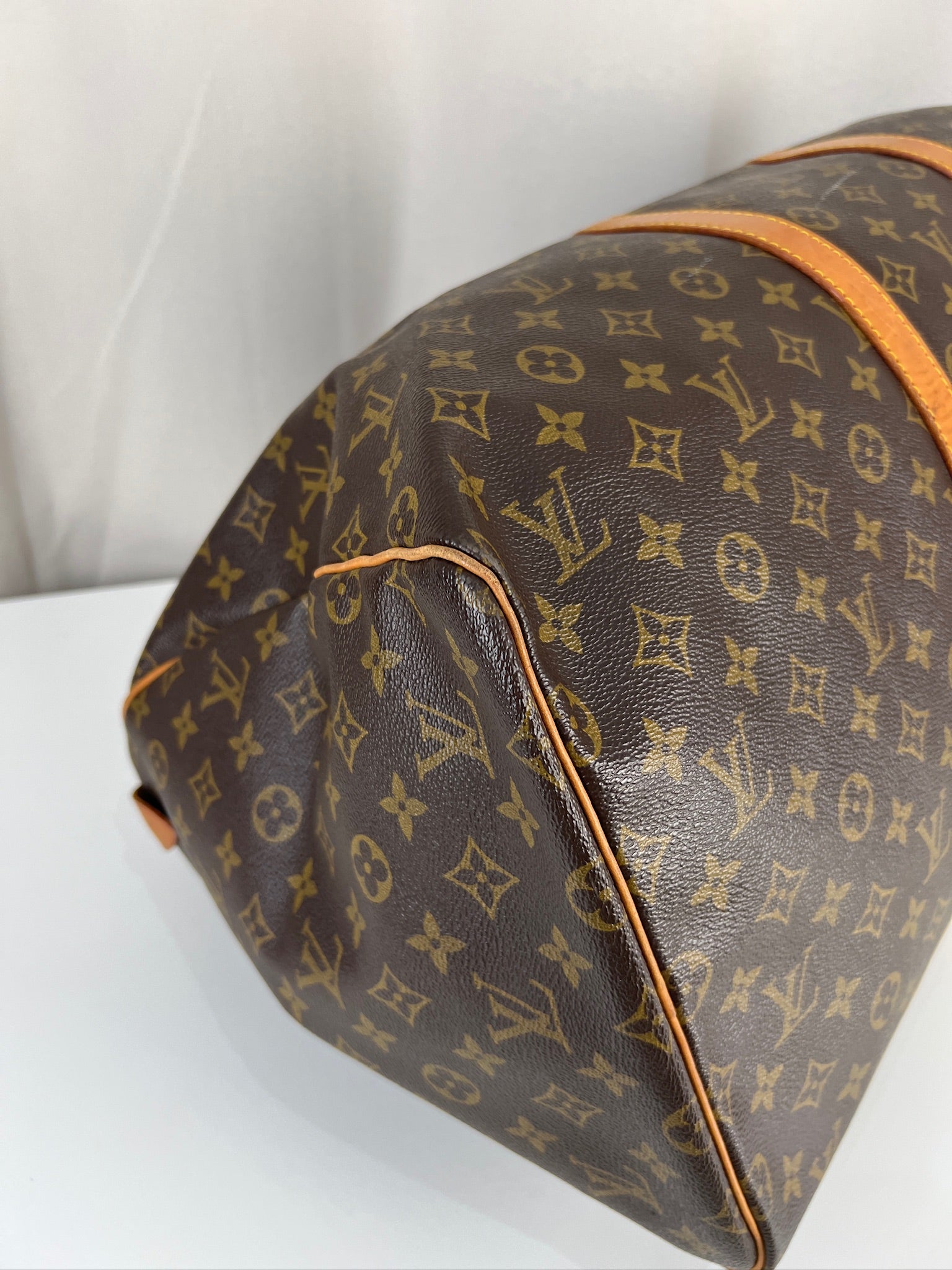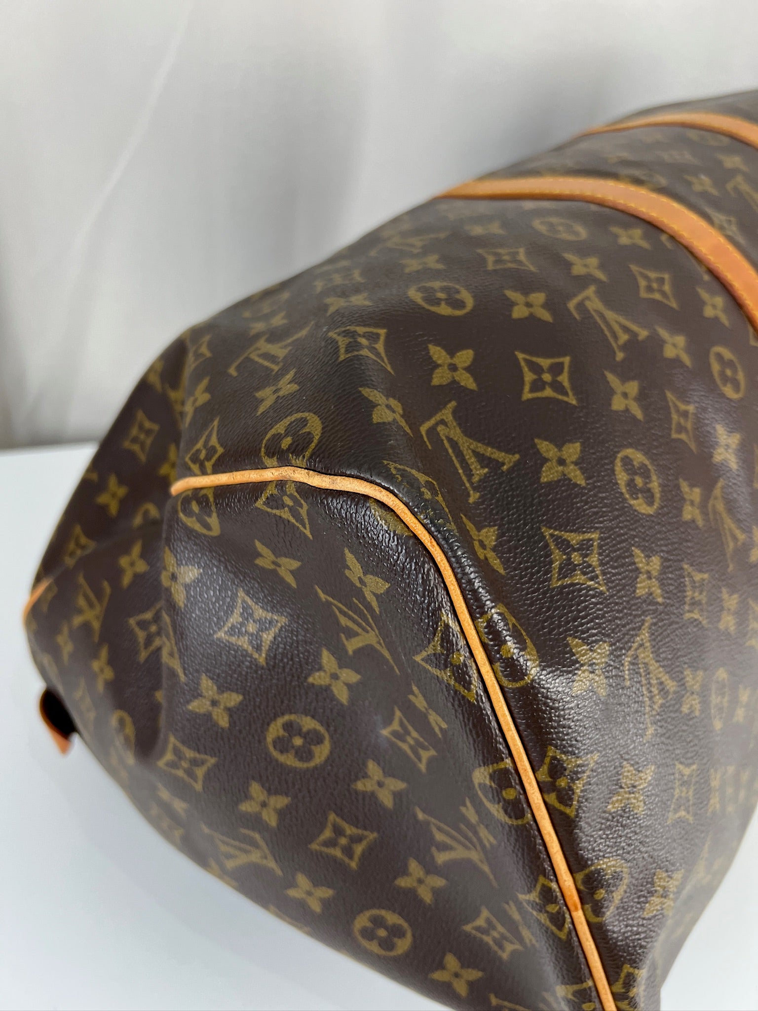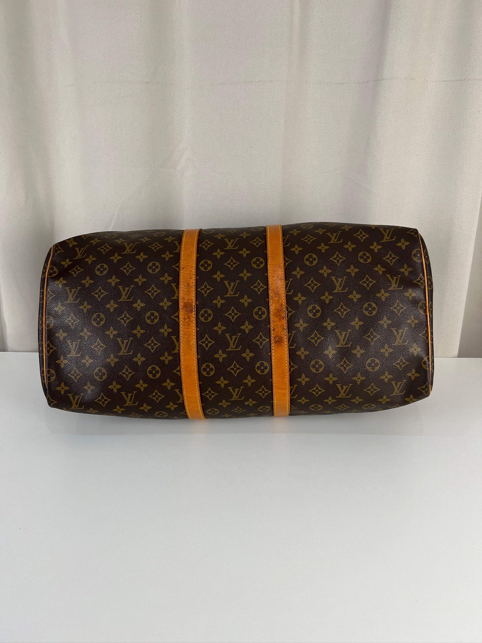Ce Keepall Louis Vuitton est en bon état. La toile est en très bon état. Les coins sont un peu frottés. Les parties en cuir sont tannées. Le dessous du sac présente quelques tâches sur les parties en cuir et sur la toile. Les anses sont en très bon état. L'intérieur est en très bon état.