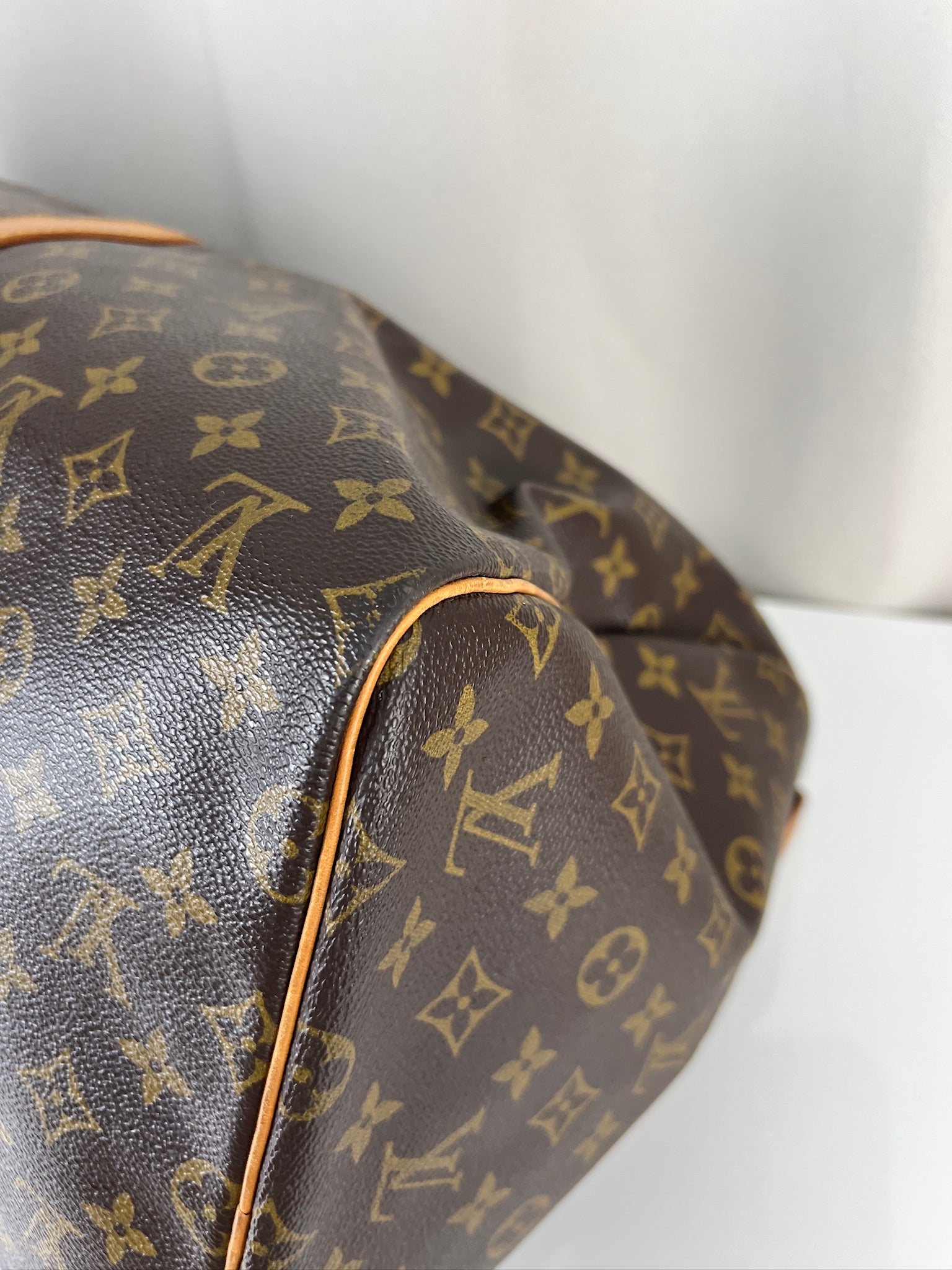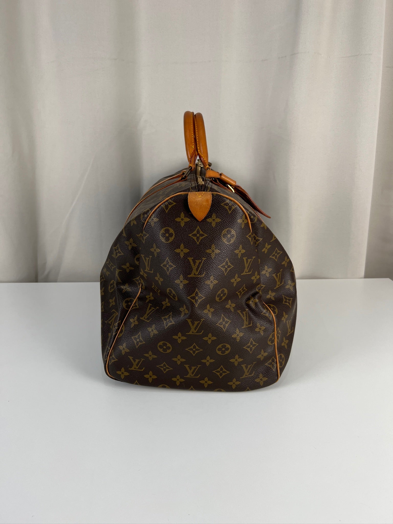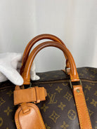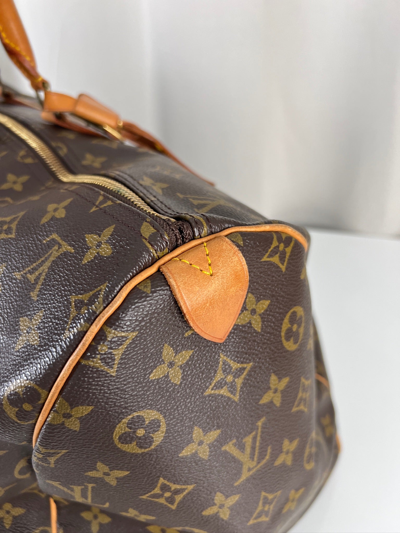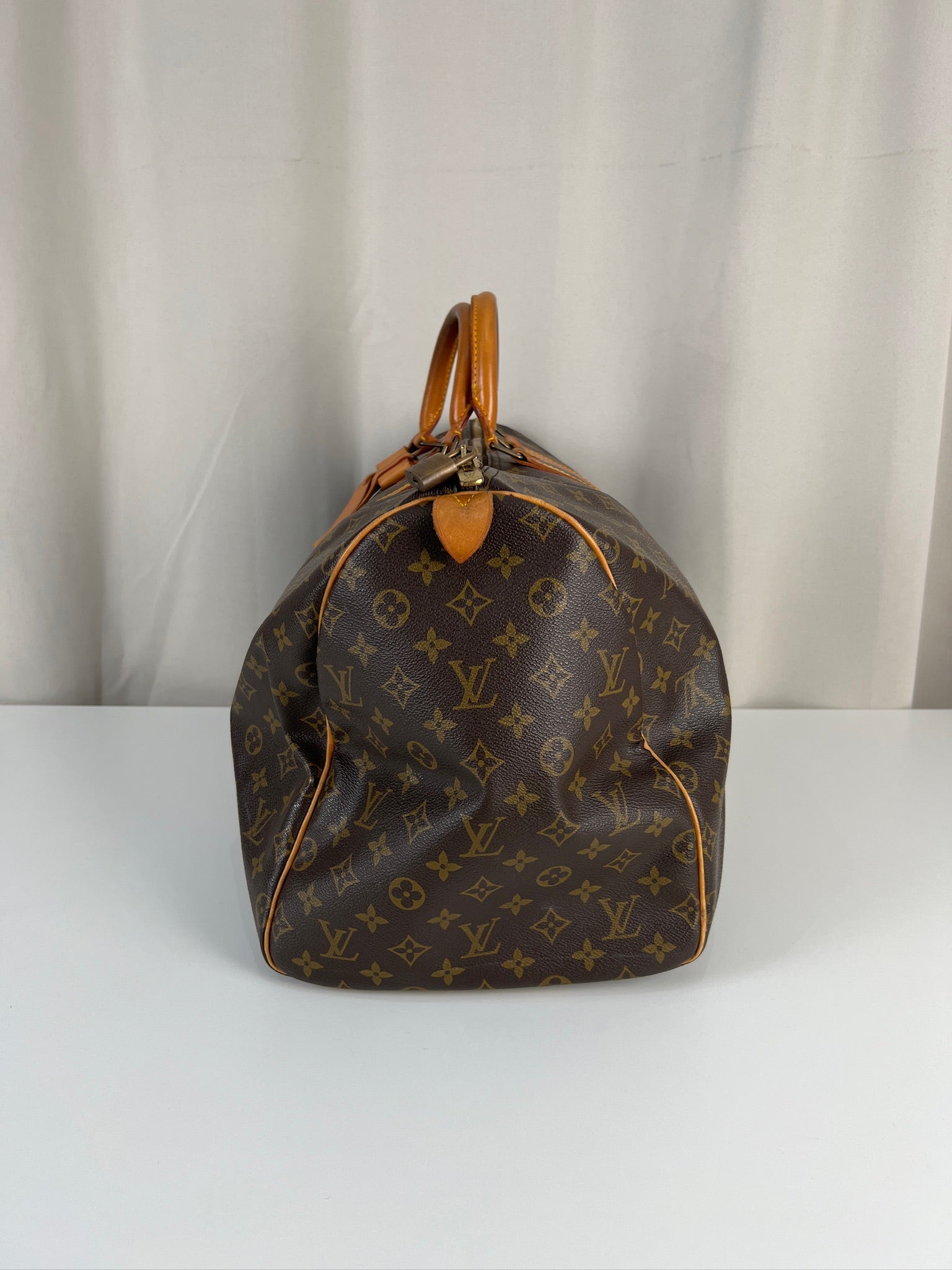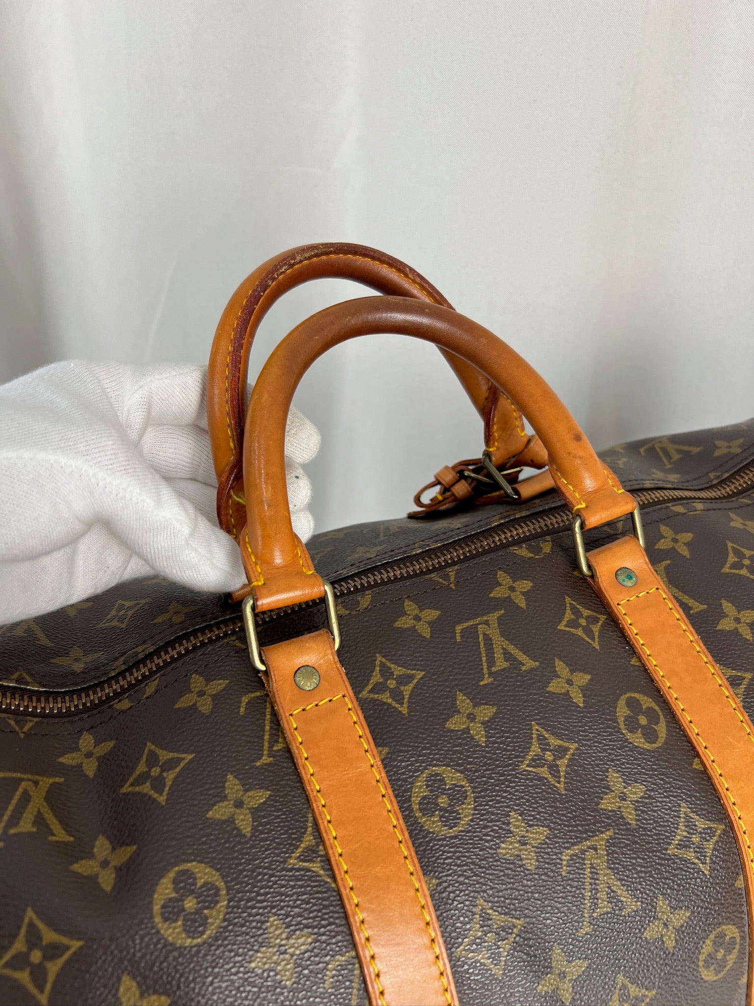 Ce Keepall Louis Vuitton est en bon état. La toile est en très bon état. Les coins sont un peu frottés. Les parties en cuir sont tannées. Le dessous du sac présente quelques tâches sur les parties en cuir et sur la toile. Les anses sont en très bon état. L'intérieur est en très bon état.