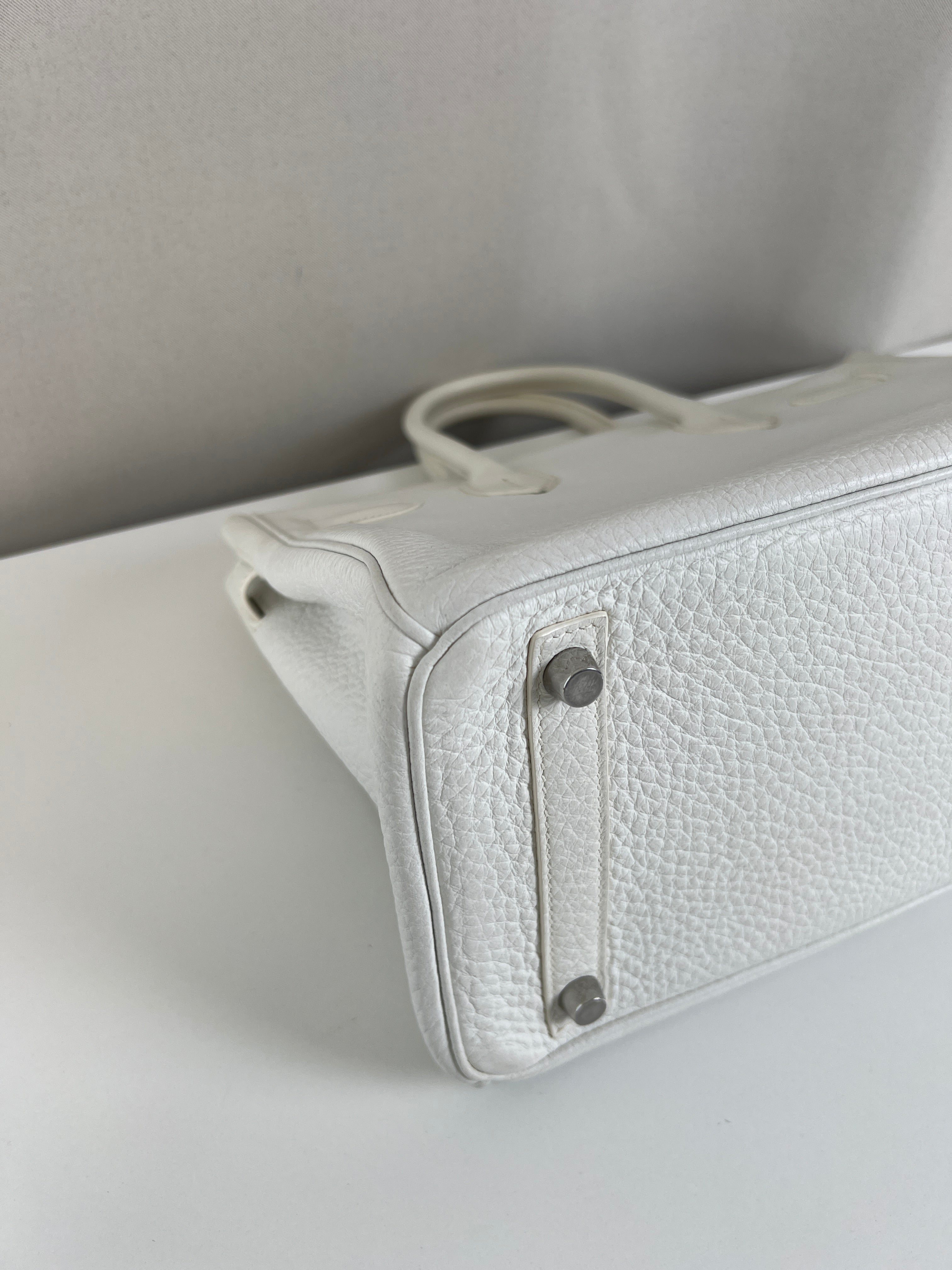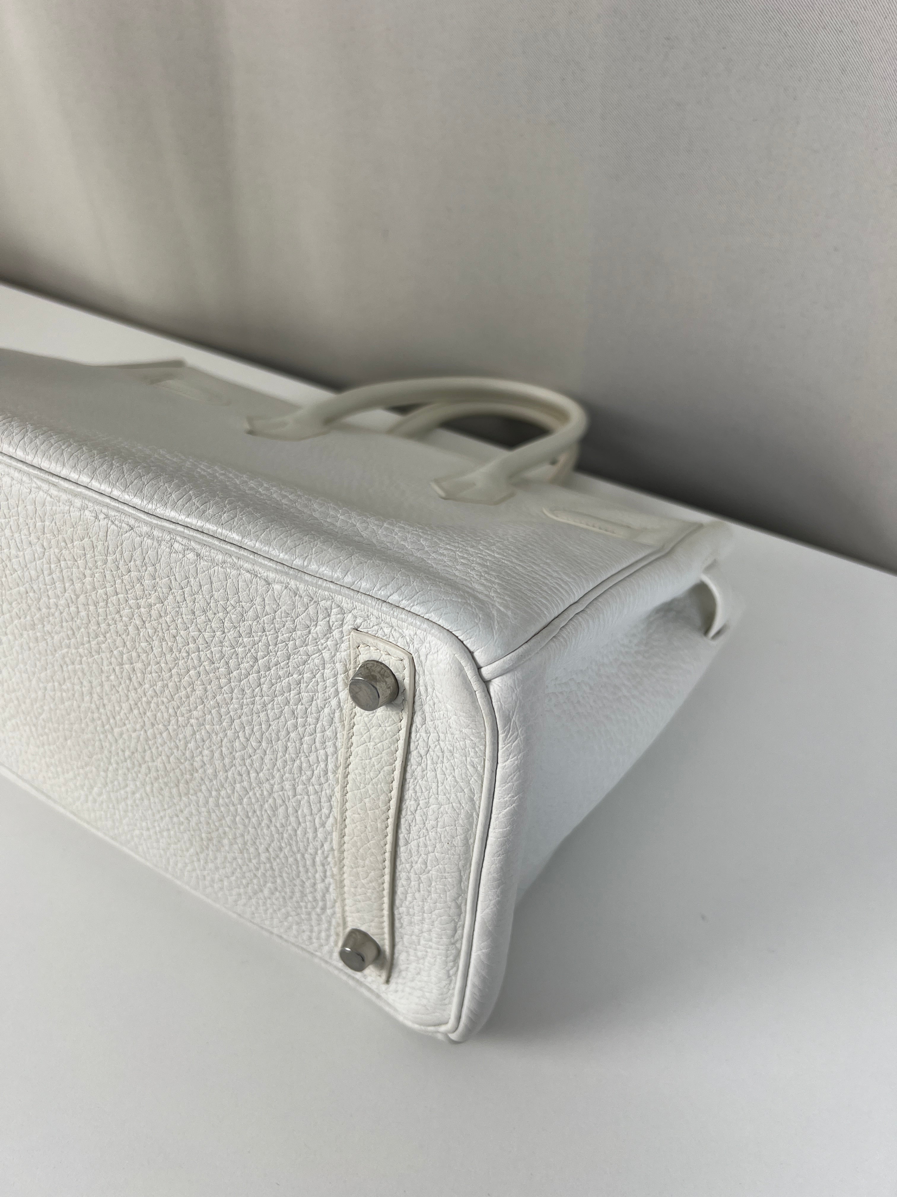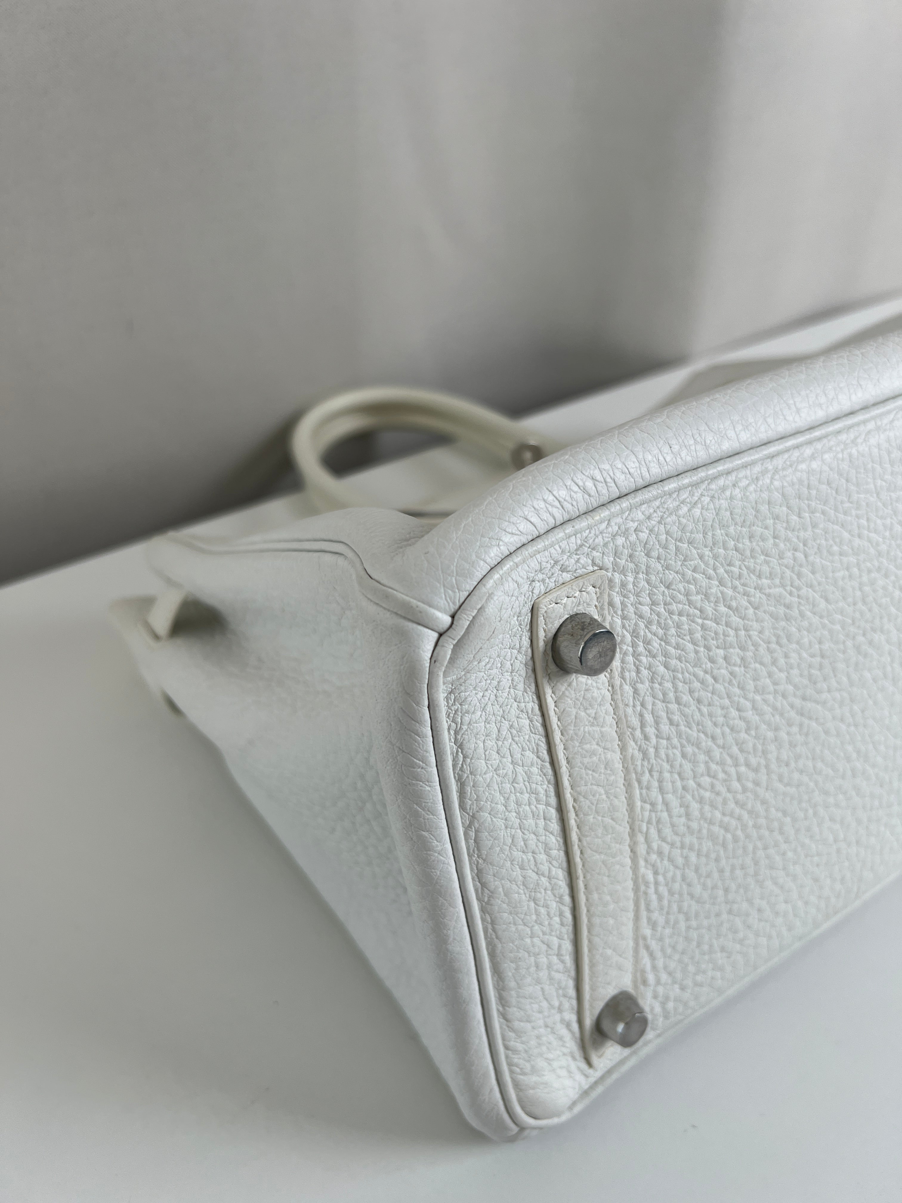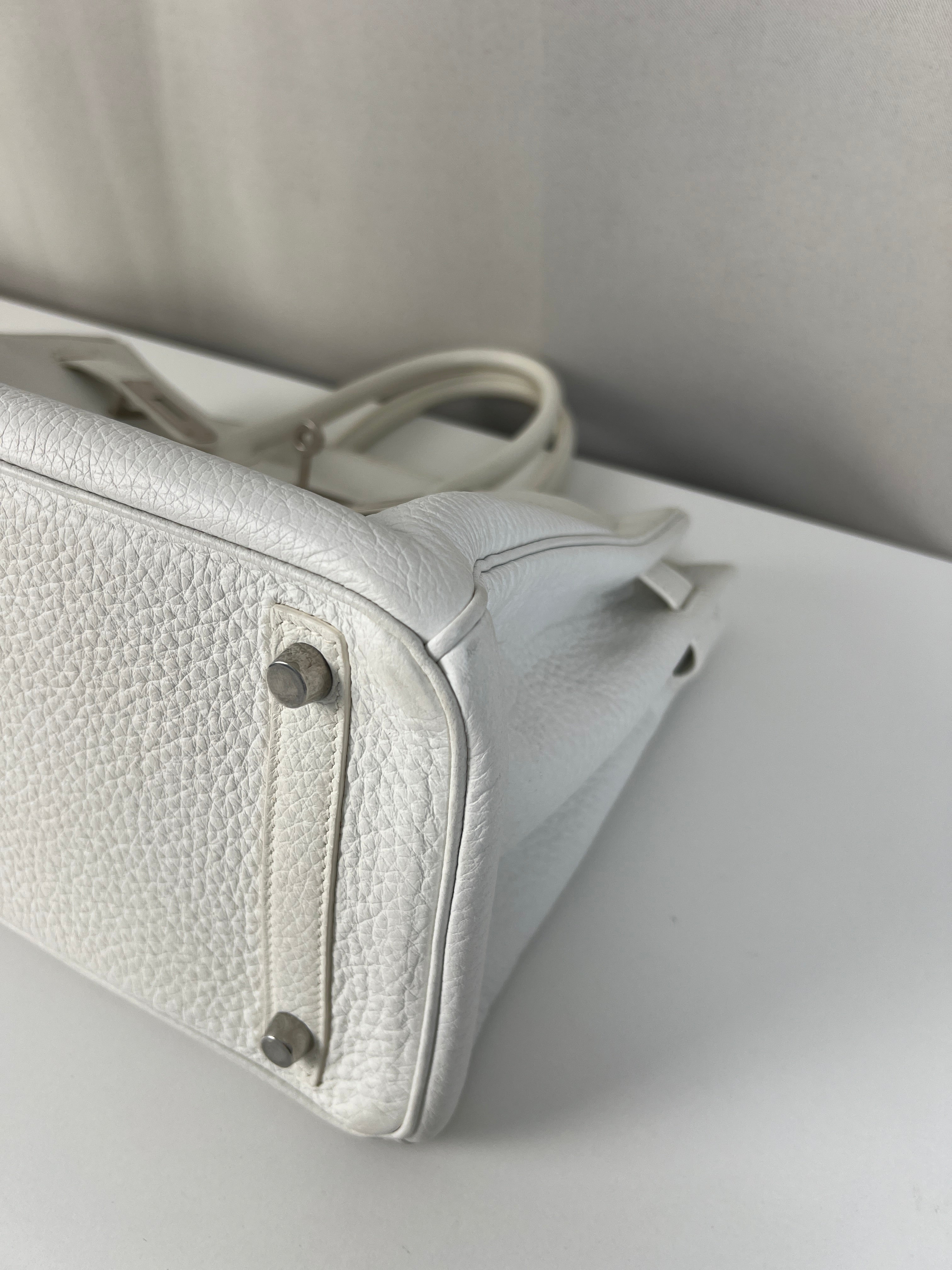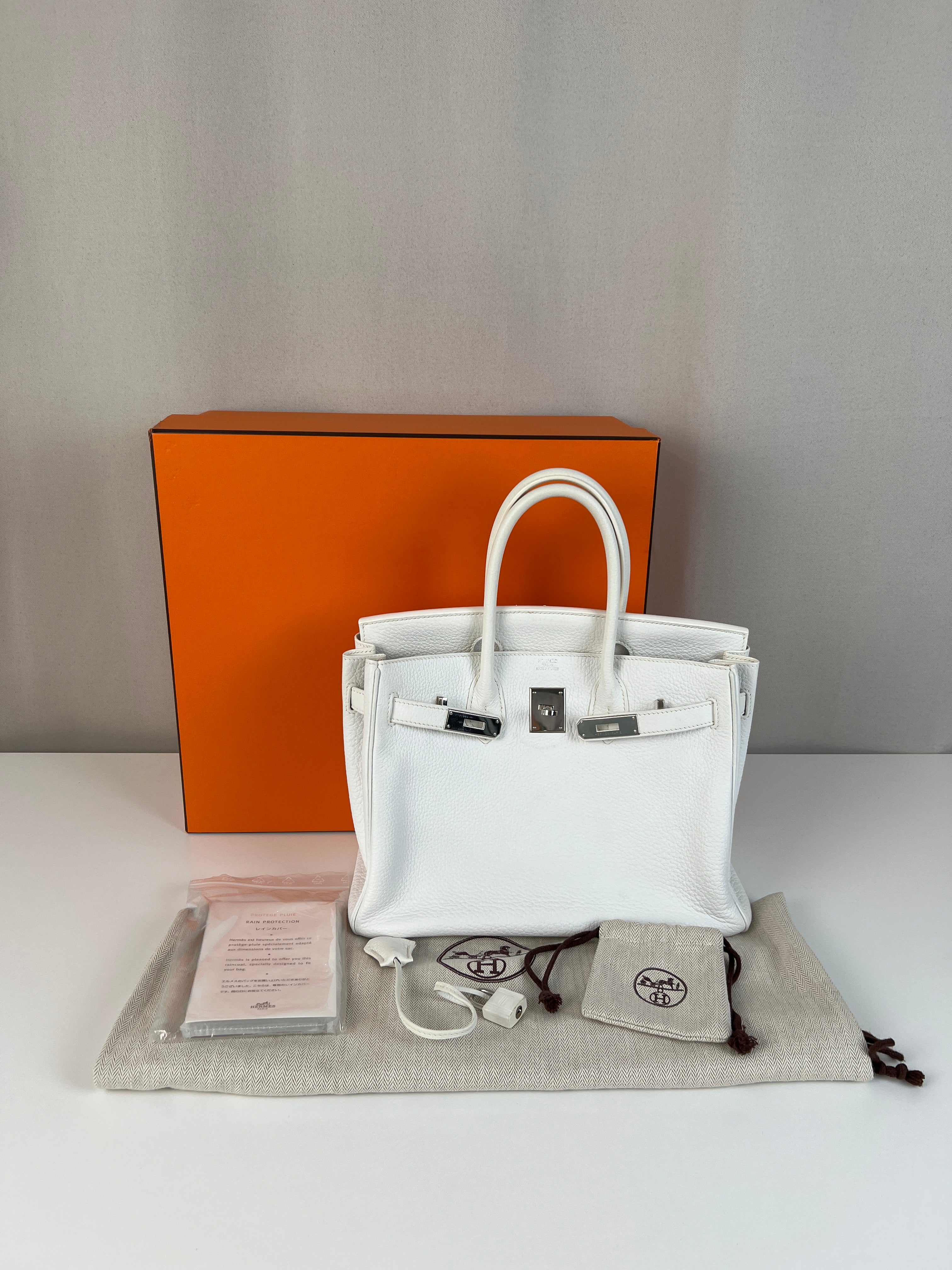 Ce sac à main Hermès Birkin 30 en cuir et accastillage argenté est en très bon état. Les deux anses en cuir sont en bon état, on voit qu'il a été utilisé. Le cuir est en bon/très bon état, on peut voir quelques signes d'usure en général et quelques "rides", dues à l'utilisation normale du sac. Les coins sont très bons. Une petite tache à l'intérieur de la poche intérieure (probablement du maquillage) puis quelques traces d'usure à l'intérieur mais presque pas. Il est livré avec boîte, dustbag, cadenas + clé et un sac imperméable. J'ai également réalisé le certificat Entrupy.