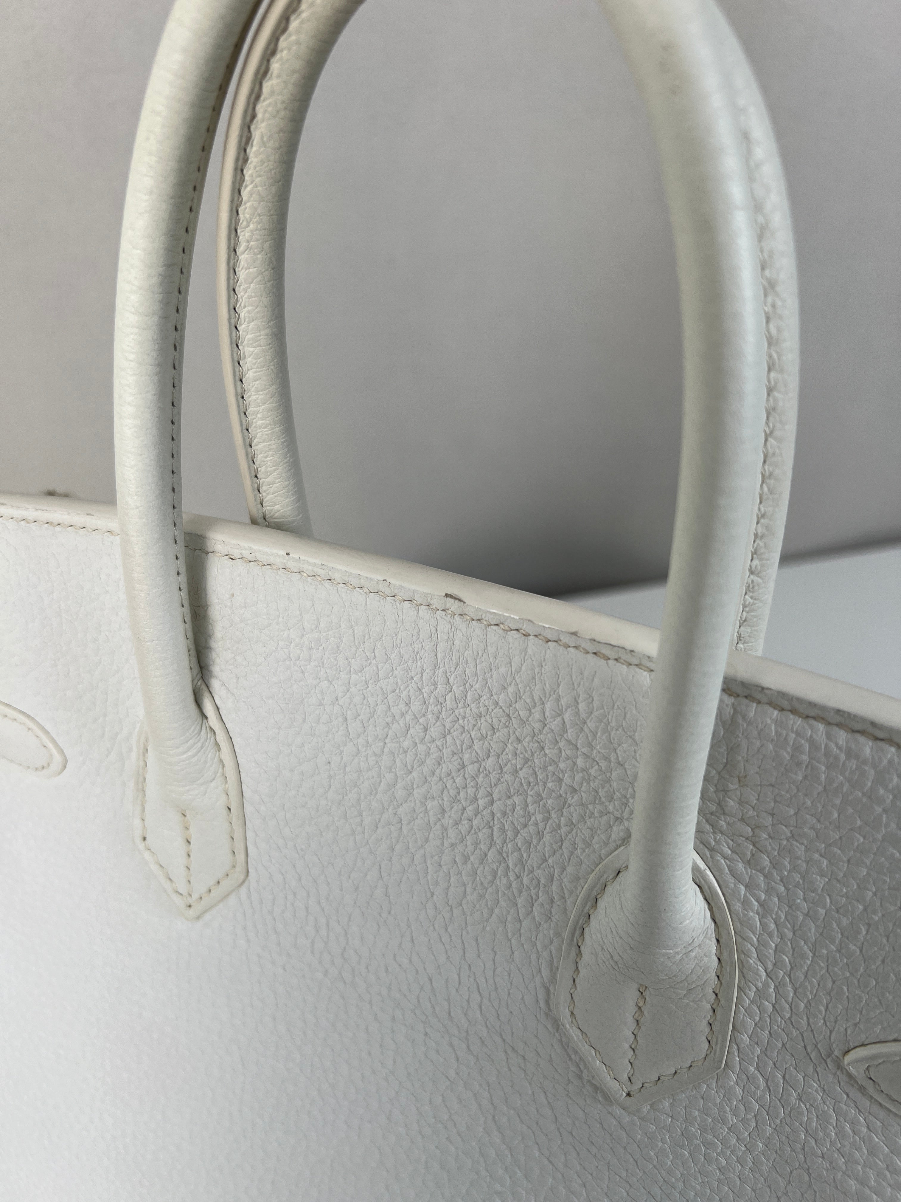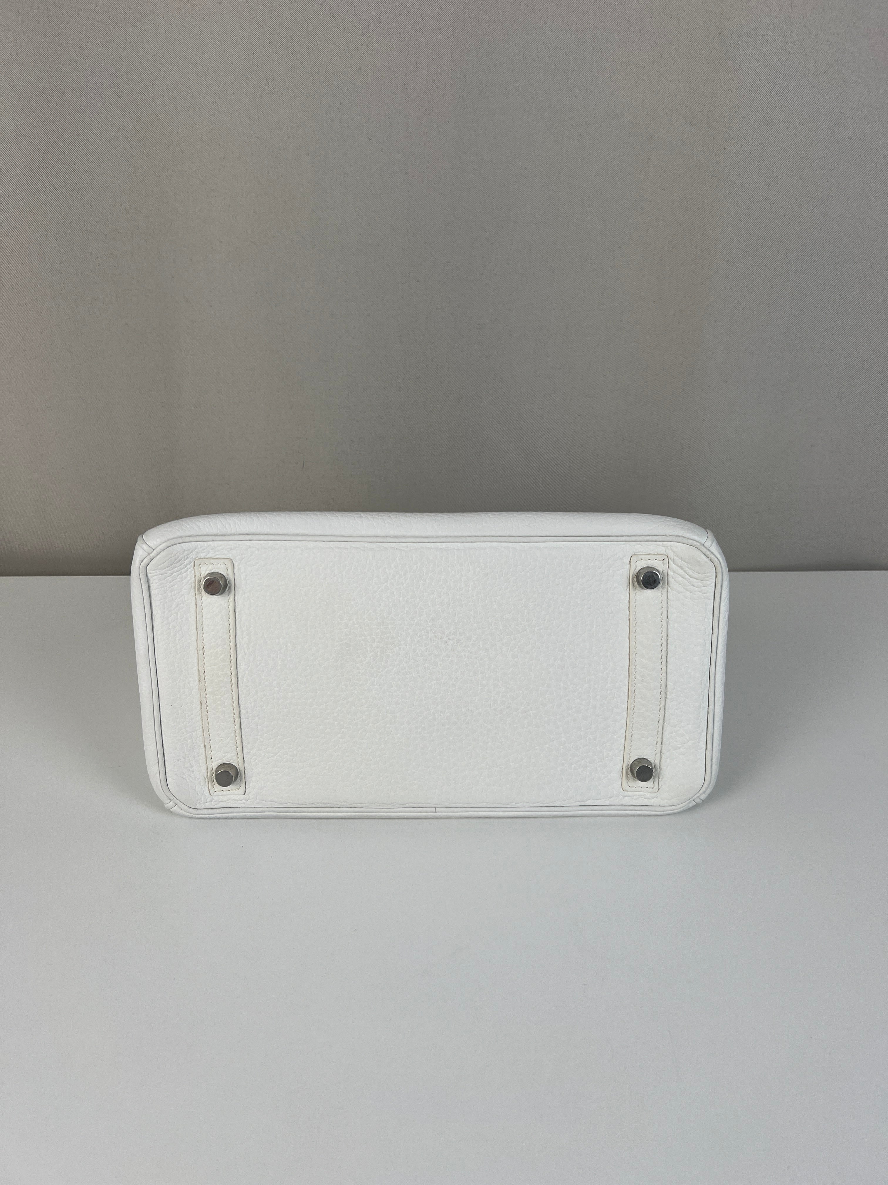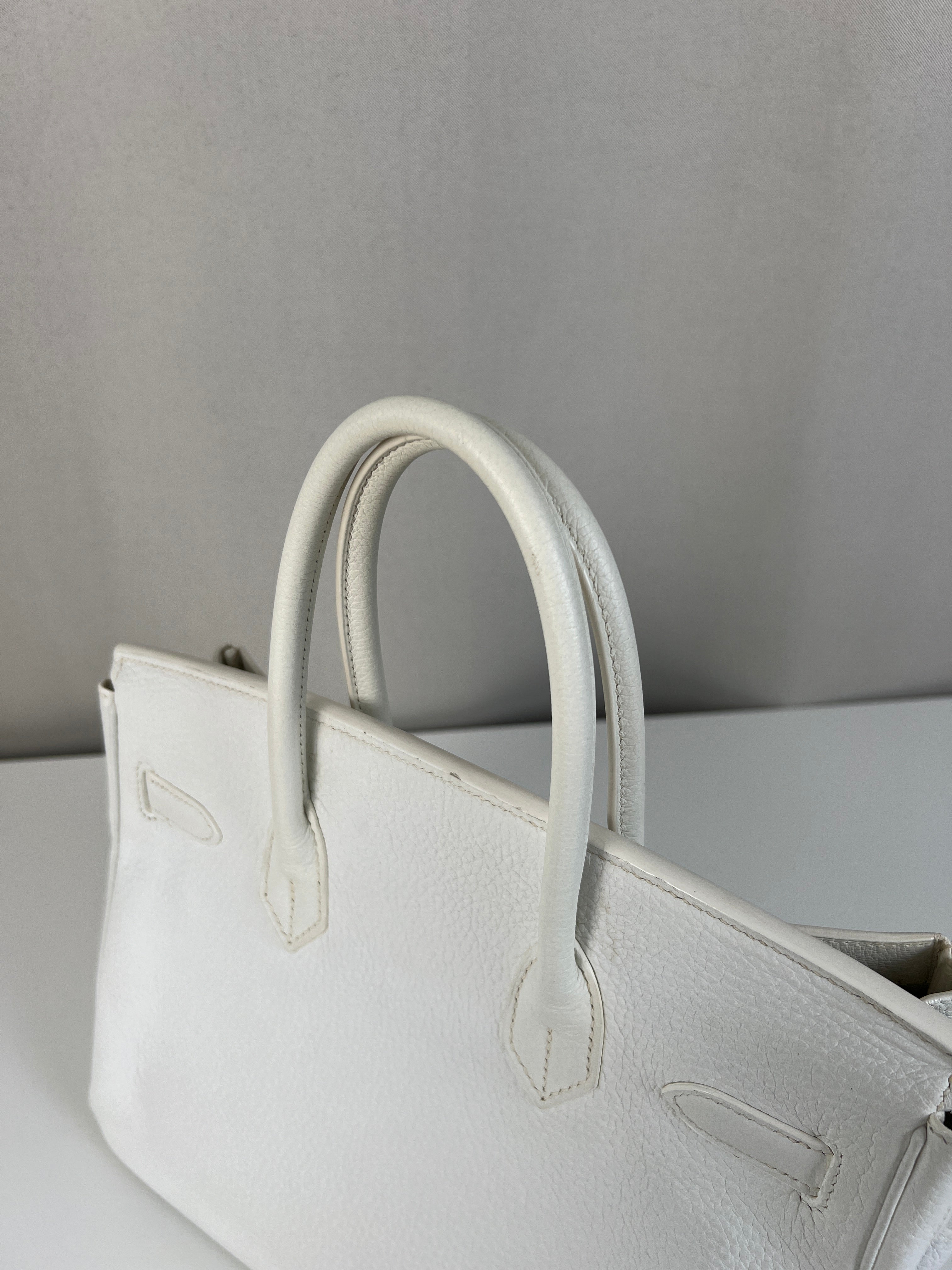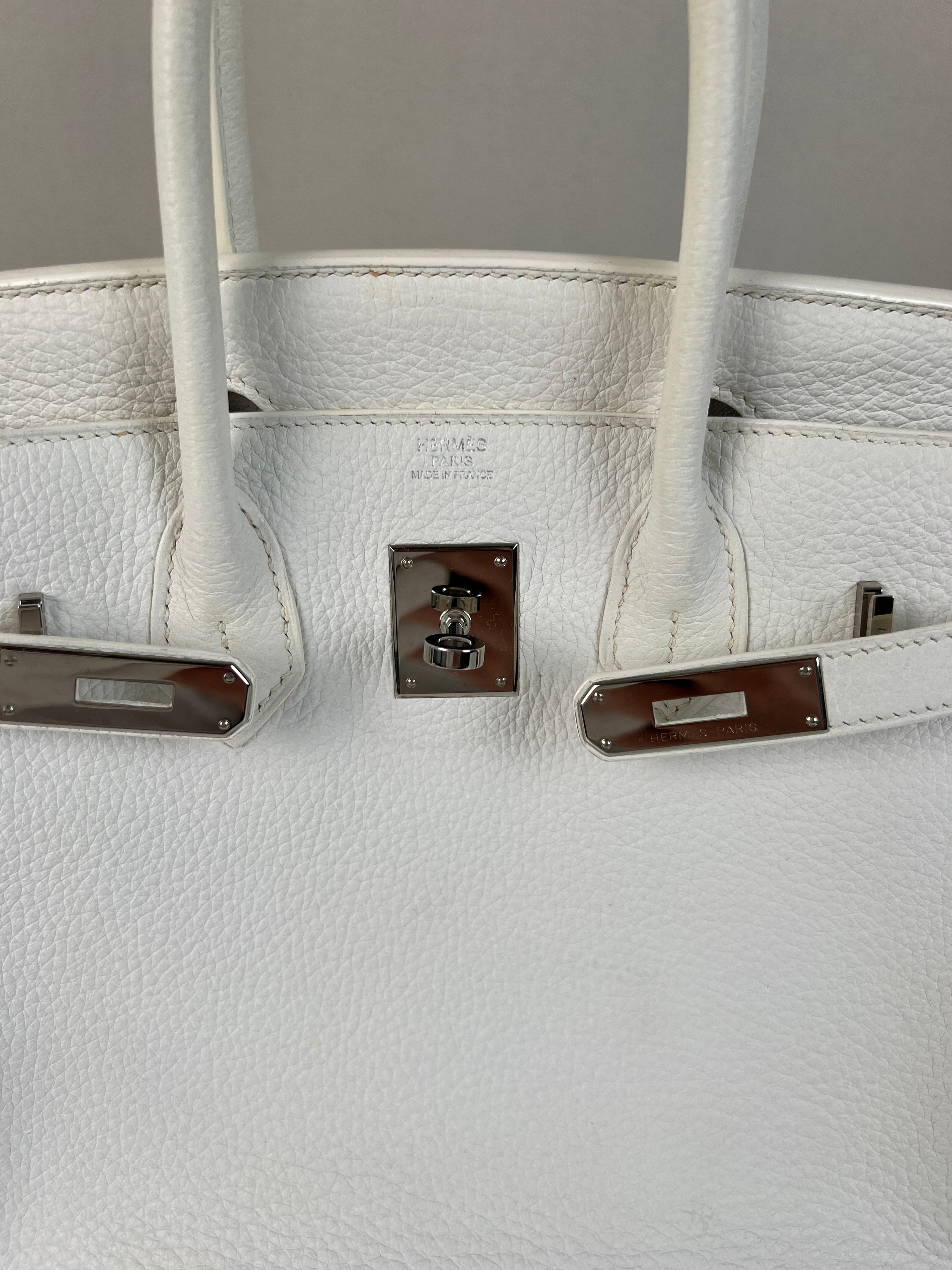 Ce sac à main Hermès Birkin 30 en cuir et accastillage argenté est en très bon état. Les deux anses en cuir sont en bon état, on voit qu'il a été utilisé. Le cuir est en bon/très bon état, on peut voir quelques signes d'usure en général et quelques "rides", dues à l'utilisation normale du sac. Les coins sont très bons. Une petite tache à l'intérieur de la poche intérieure (probablement du maquillage) puis quelques traces d'usure à l'intérieur mais presque pas. Il est livré avec boîte, dustbag, cadenas + clé et un sac imperméable. J'ai également réalisé le certificat Entrupy.