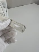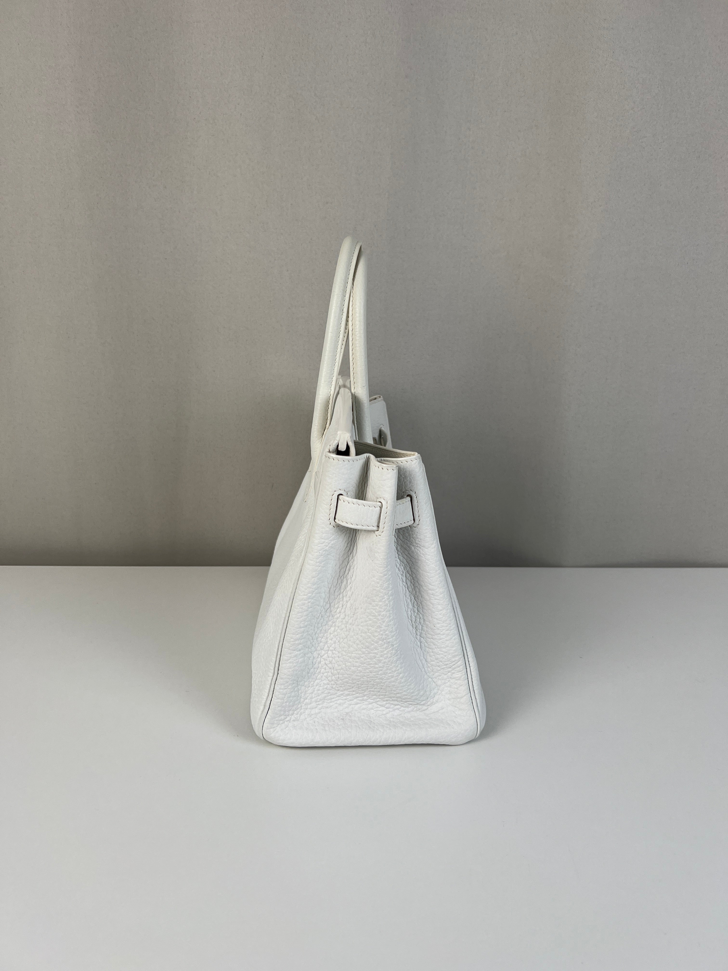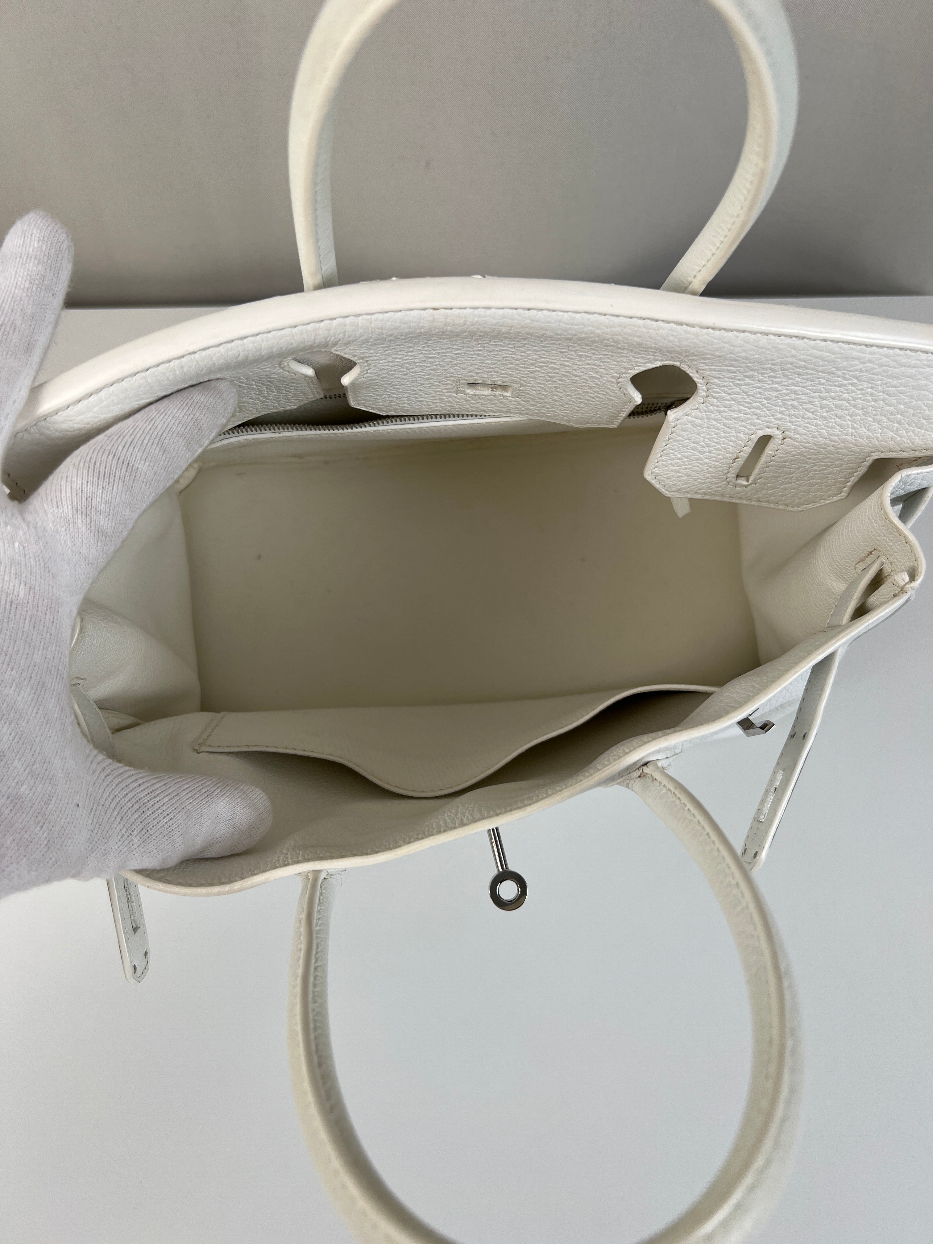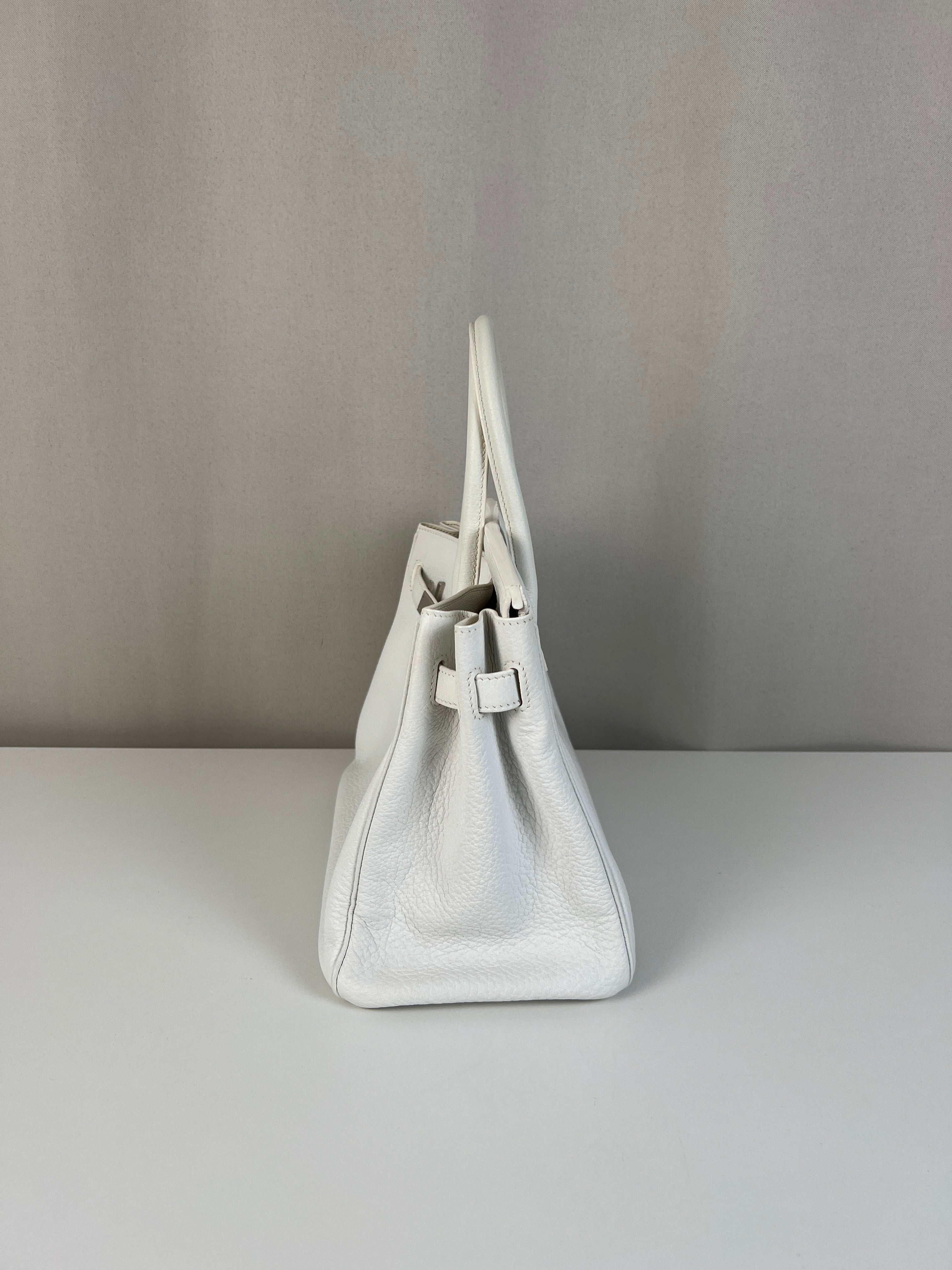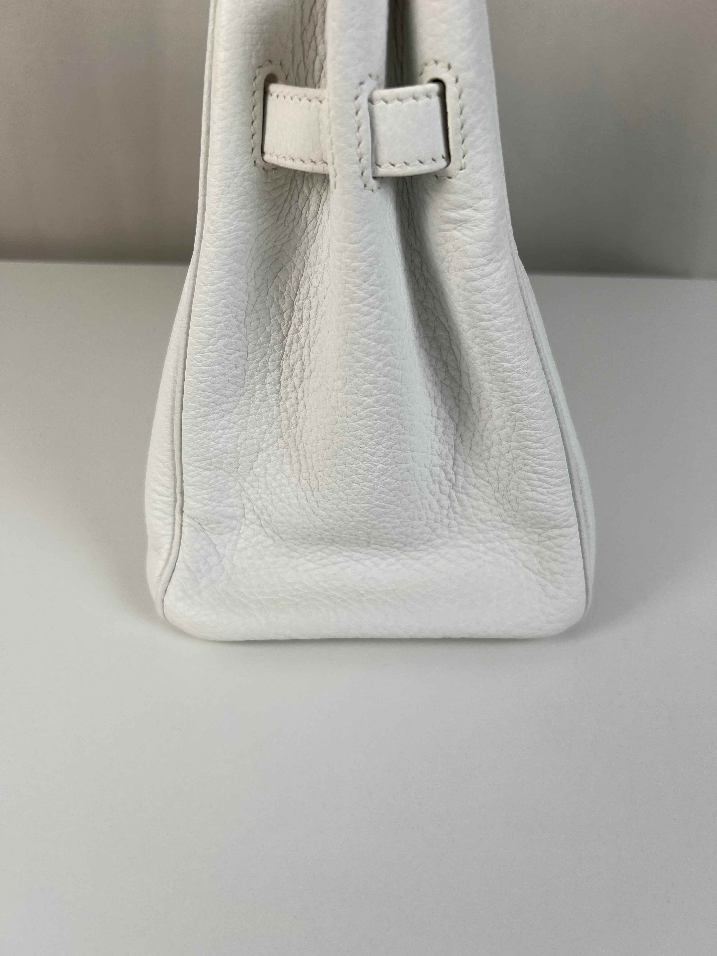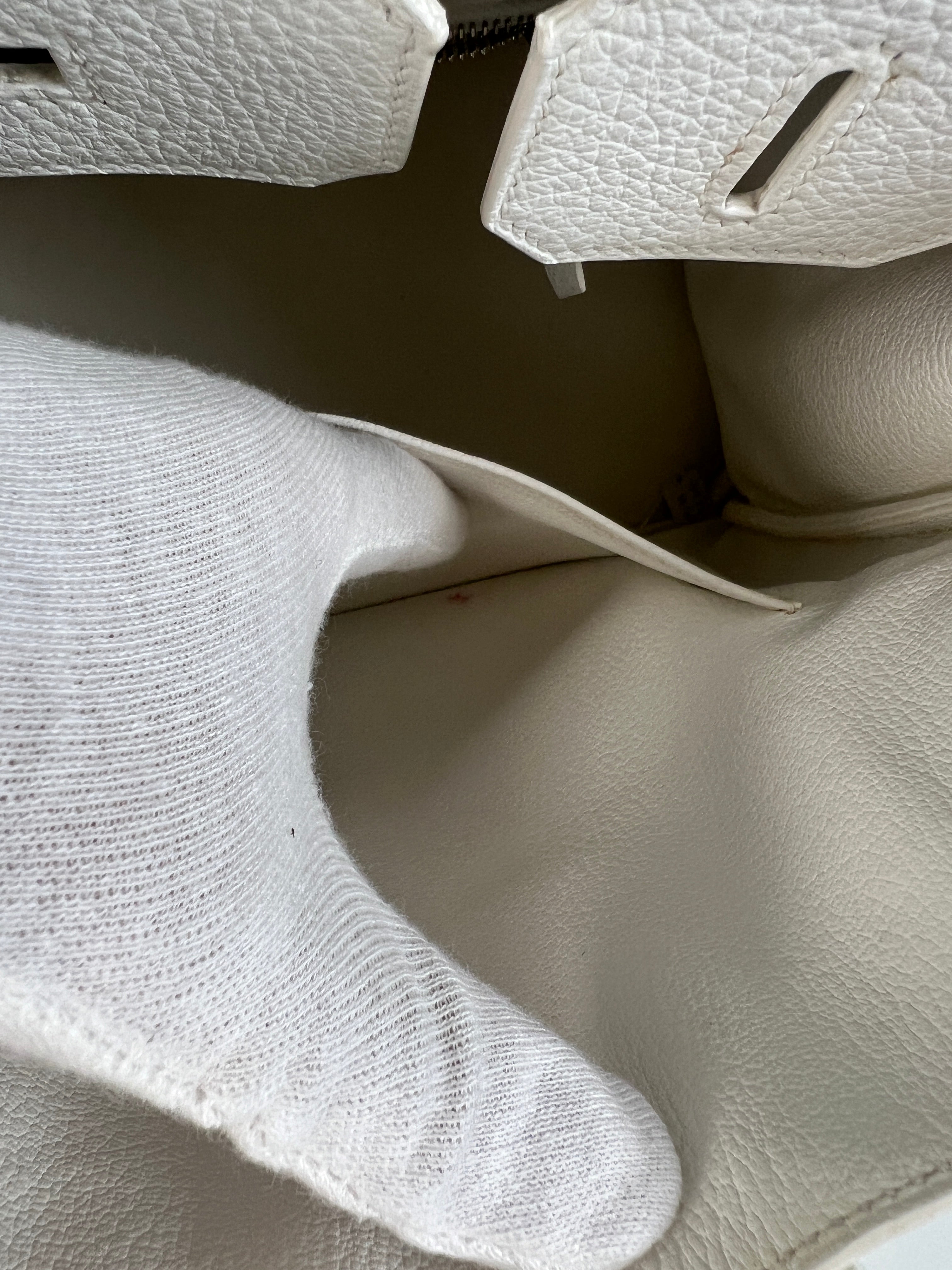 Ce sac à main Hermès Birkin 30 en cuir et accastillage argenté est en très bon état. Les deux anses en cuir sont en bon état, on voit qu'il a été utilisé. Le cuir est en bon/très bon état, on peut voir quelques signes d'usure en général et quelques "rides", dues à l'utilisation normale du sac. Les coins sont très bons. Une petite tache à l'intérieur de la poche intérieure (probablement du maquillage) puis quelques traces d'usure à l'intérieur mais presque pas. Il est livré avec boîte, dustbag, cadenas + clé et un sac imperméable. J'ai également réalisé le certificat Entrupy.
