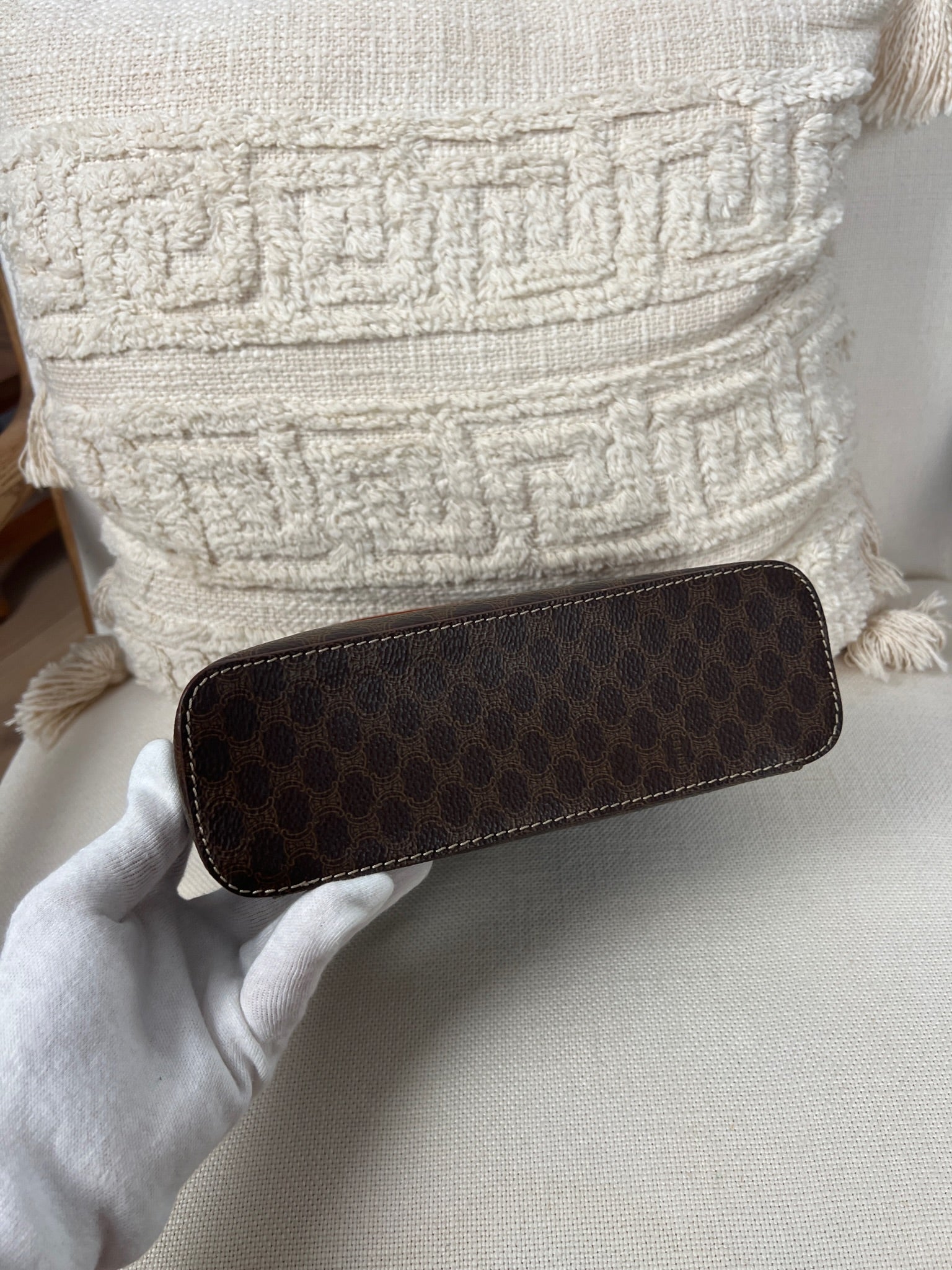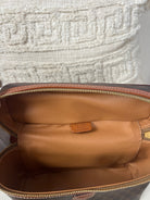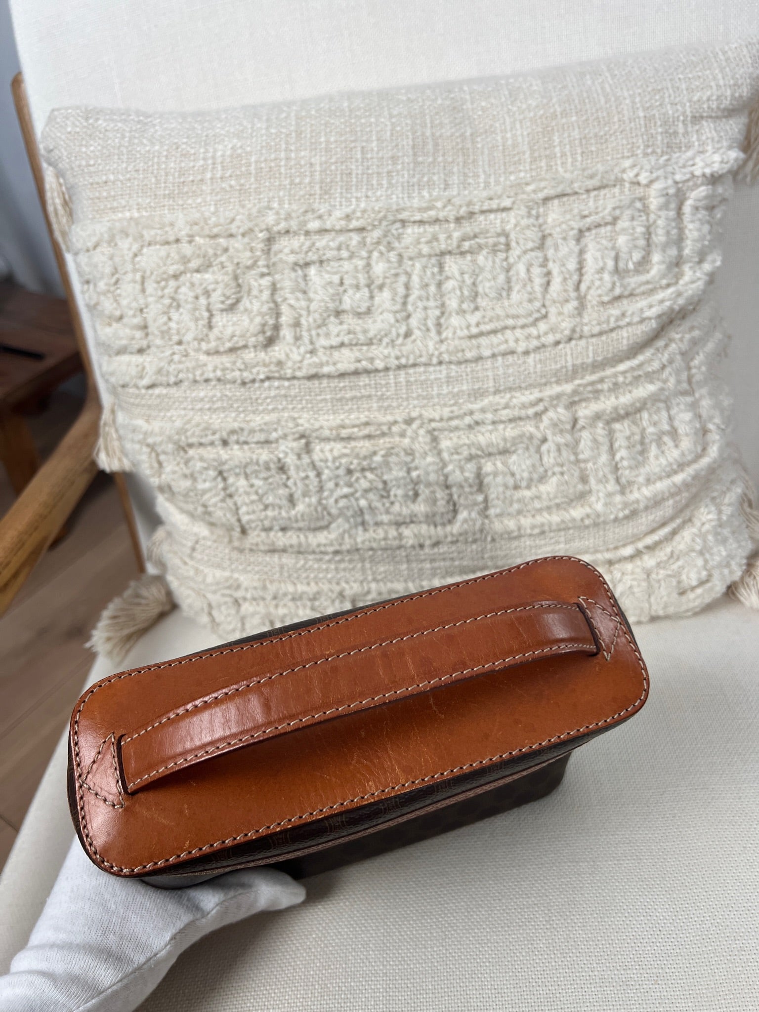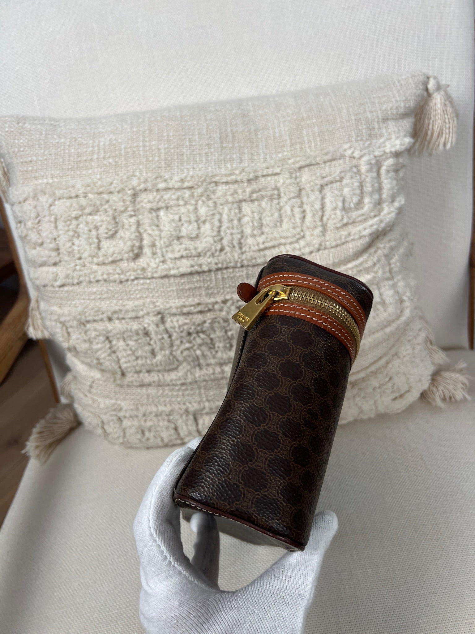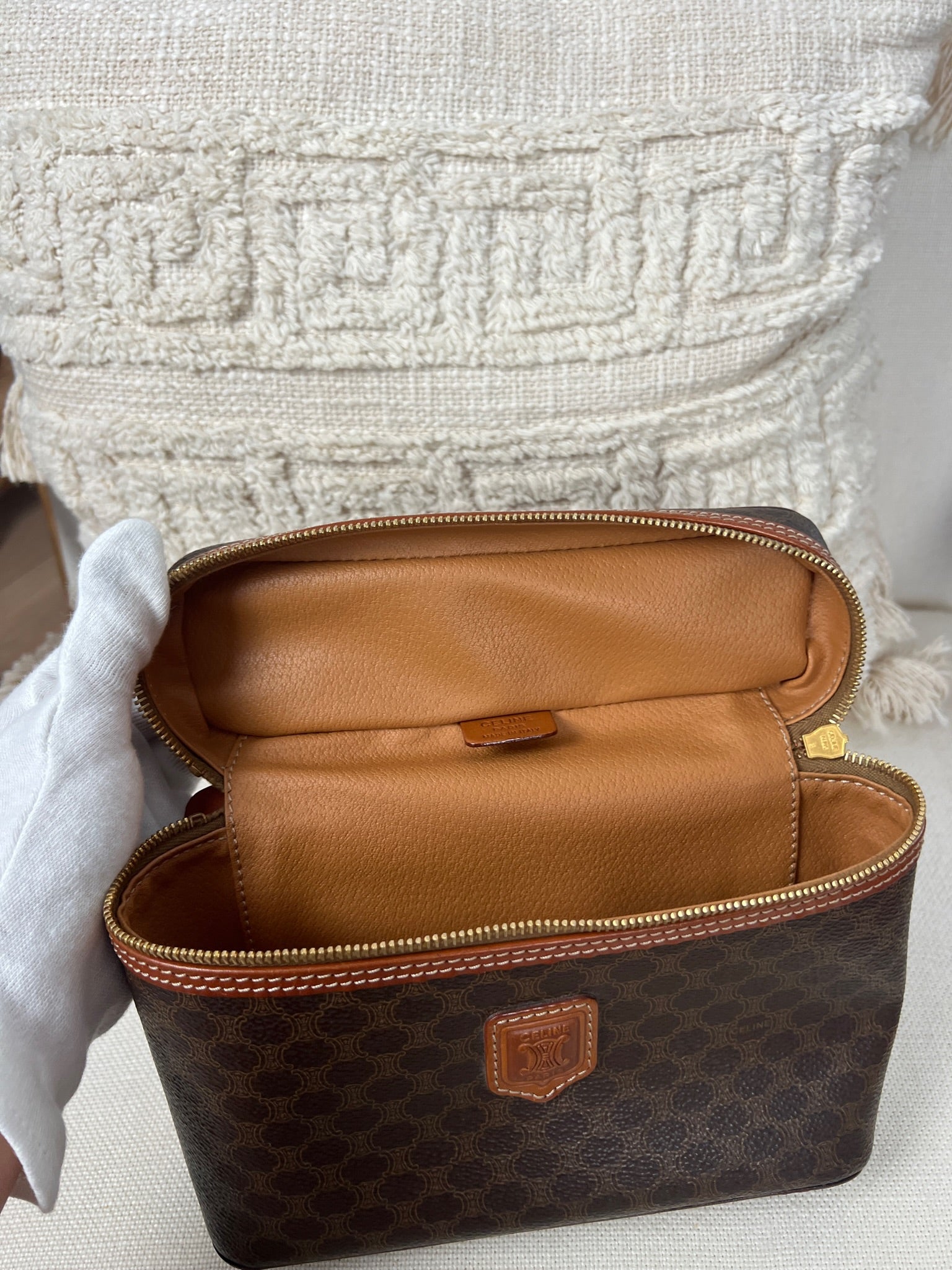 Cette trousse de toilette Céline est en bon état. Les parties en cuir sont tannées et peu rayées. La toile et les coins sont en très bon état. Le matériel est en très bon état. L'intérieur est en très bon état.
