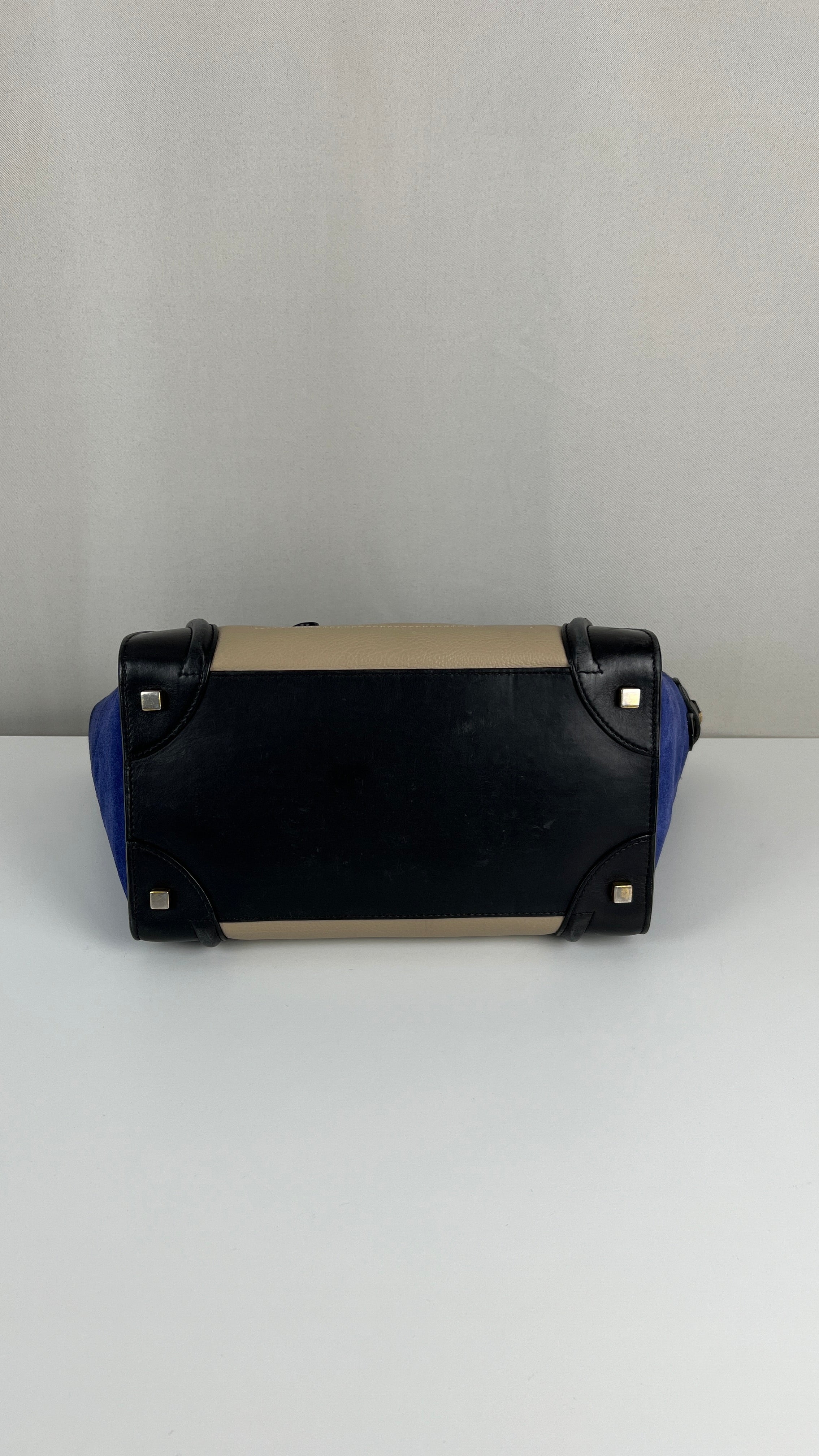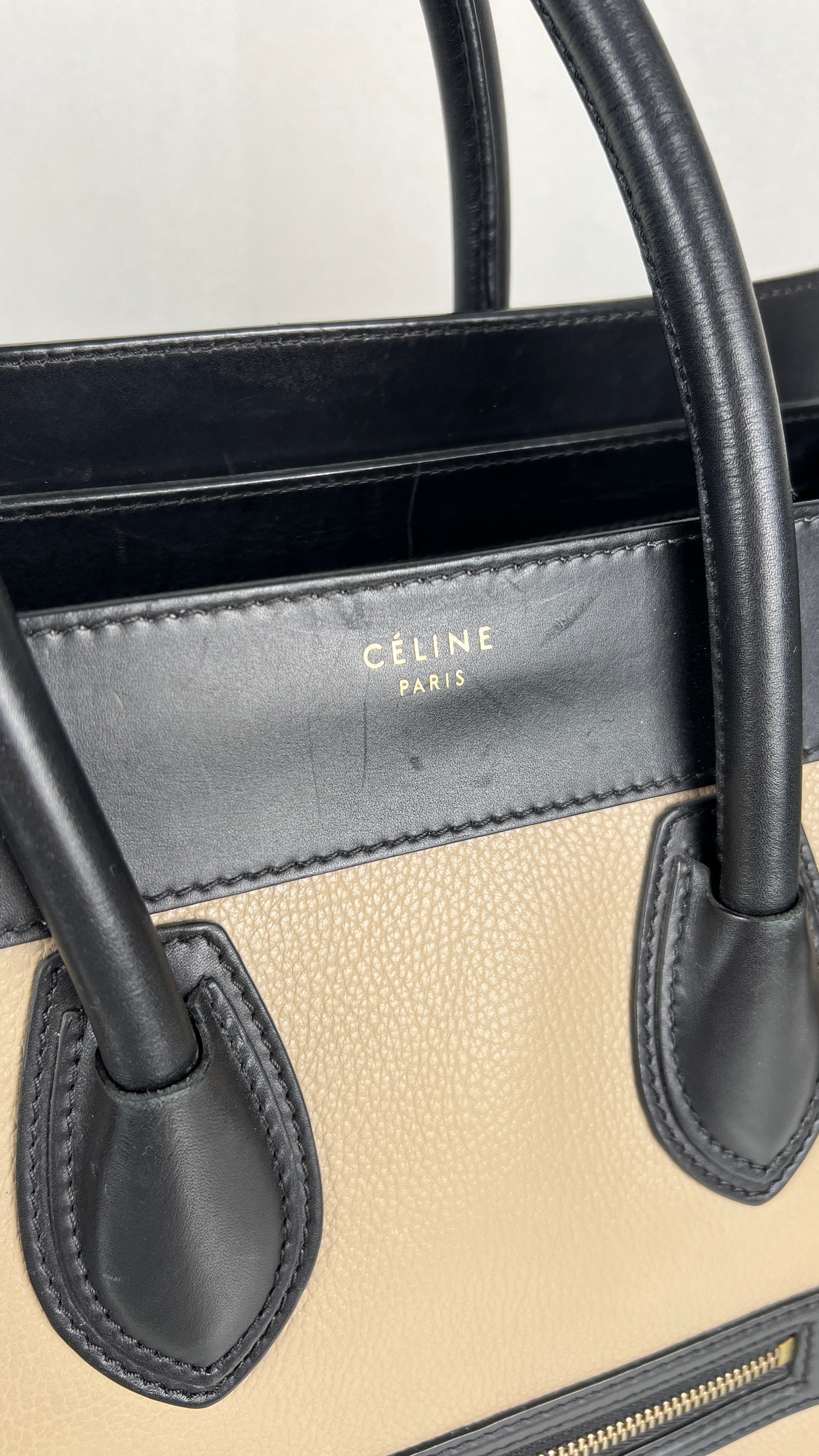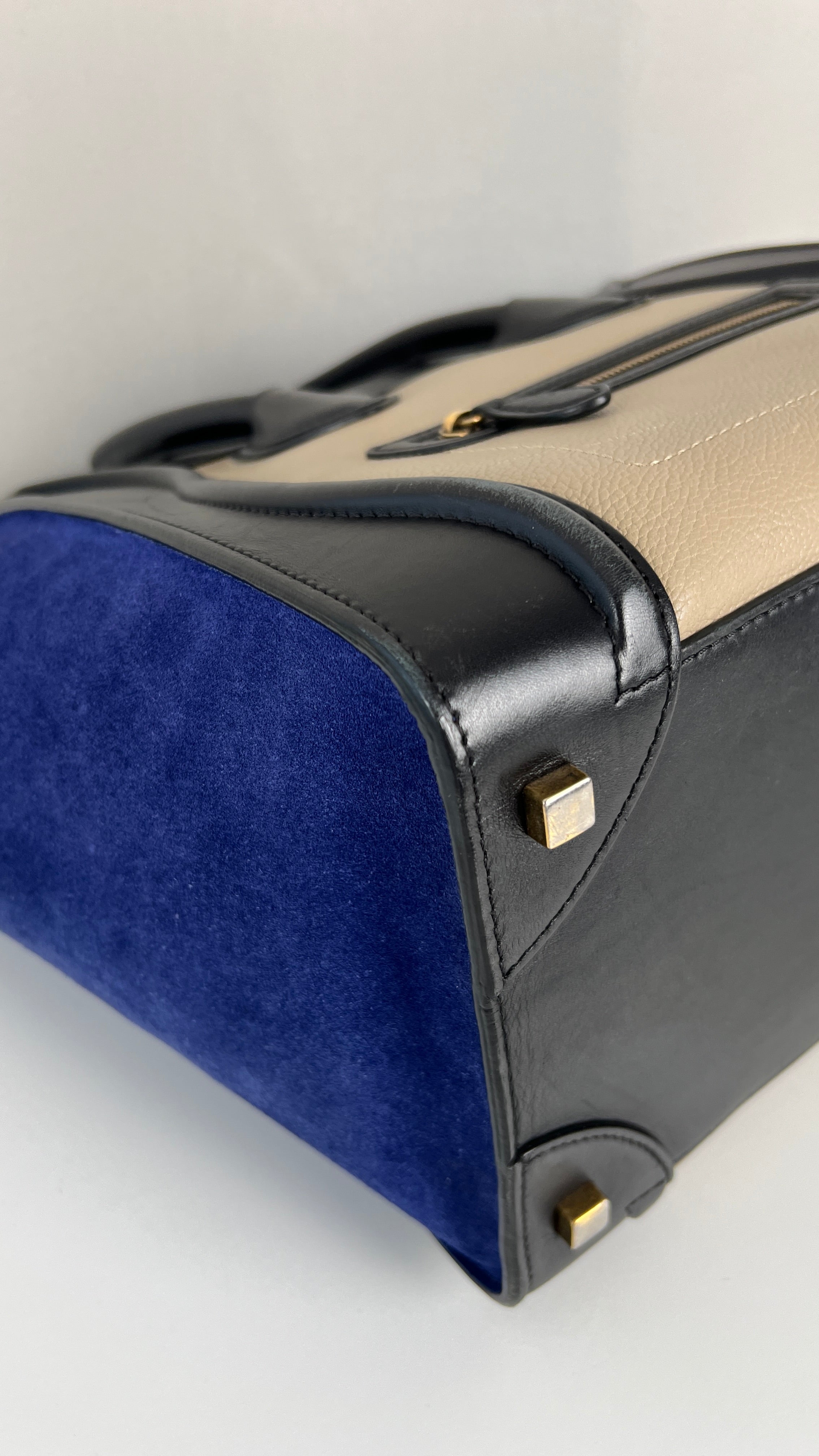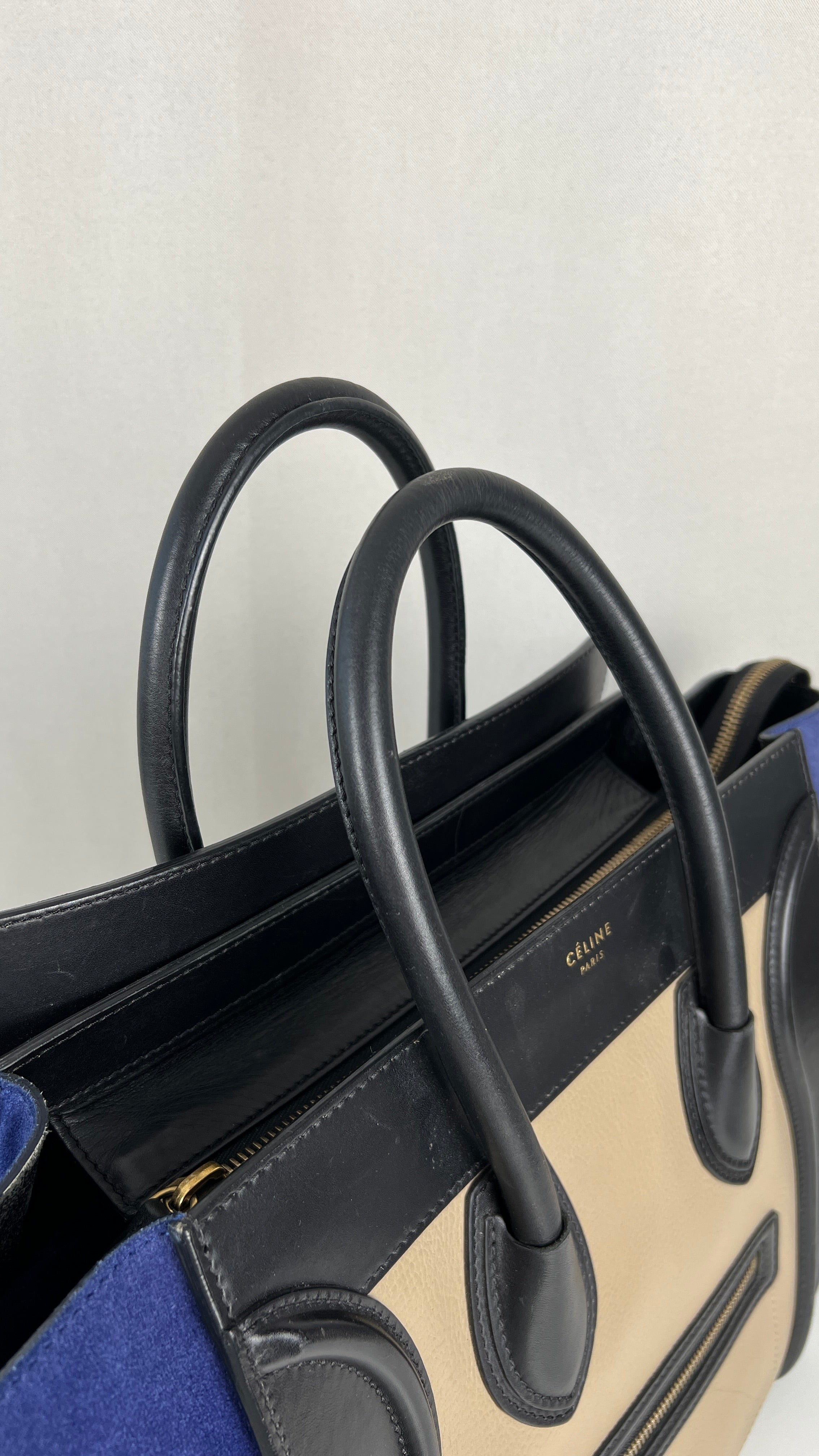 Ce sac Celine Luggage est en bon état. Il y a de petites traces d'usure sur le cuir en daim. Les coins sont en bon état, juste un peu frottés. Traces d'usure et rayures naturelles sur le cuir noir. Une trace au dos du sac sur le cuir beige. Les anses sont en très bon état. L'intérieur est en très bon état, on voit qu'il a été utilisé à l'intérieur et sur les côtés intérieur.
