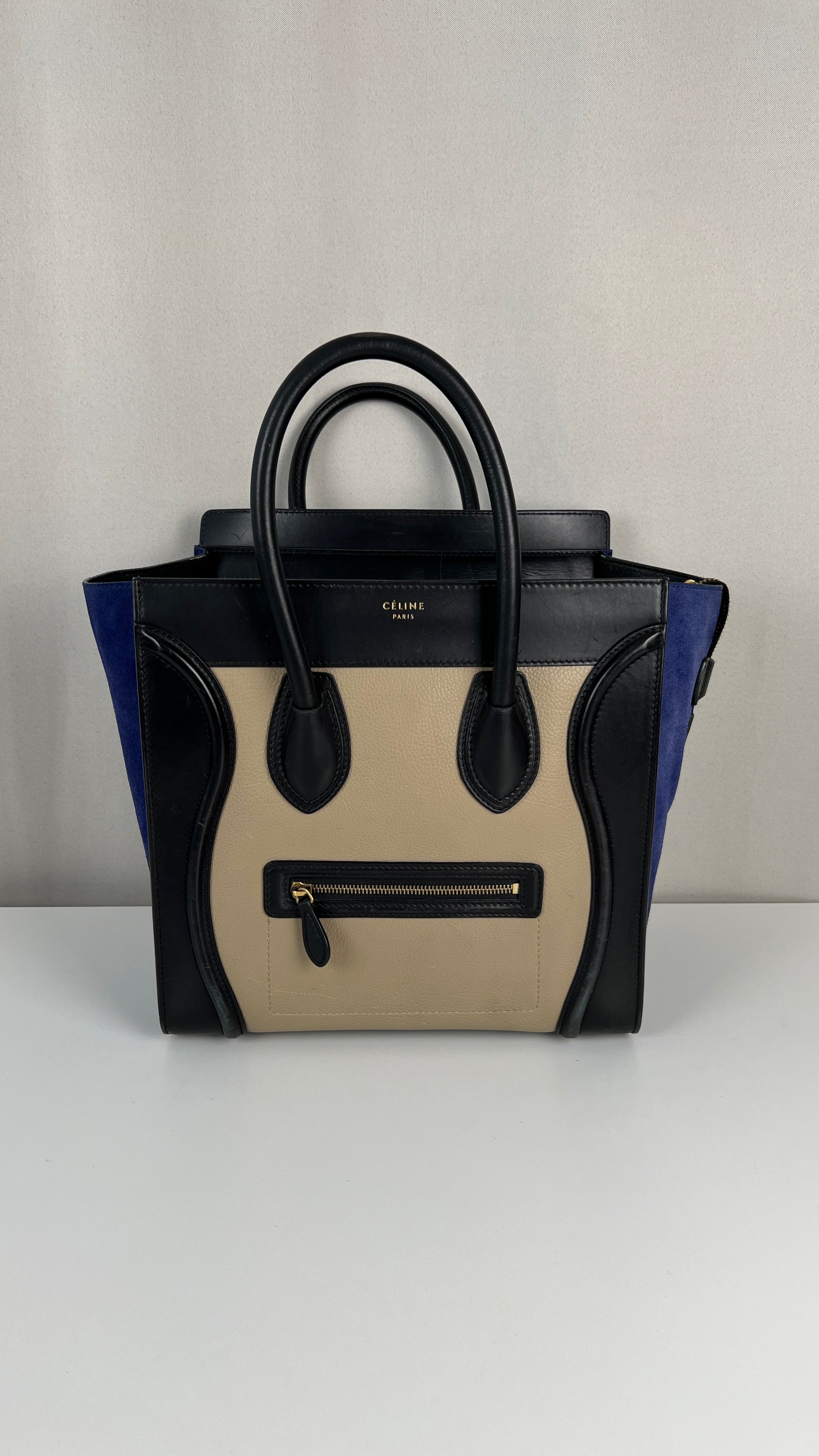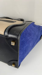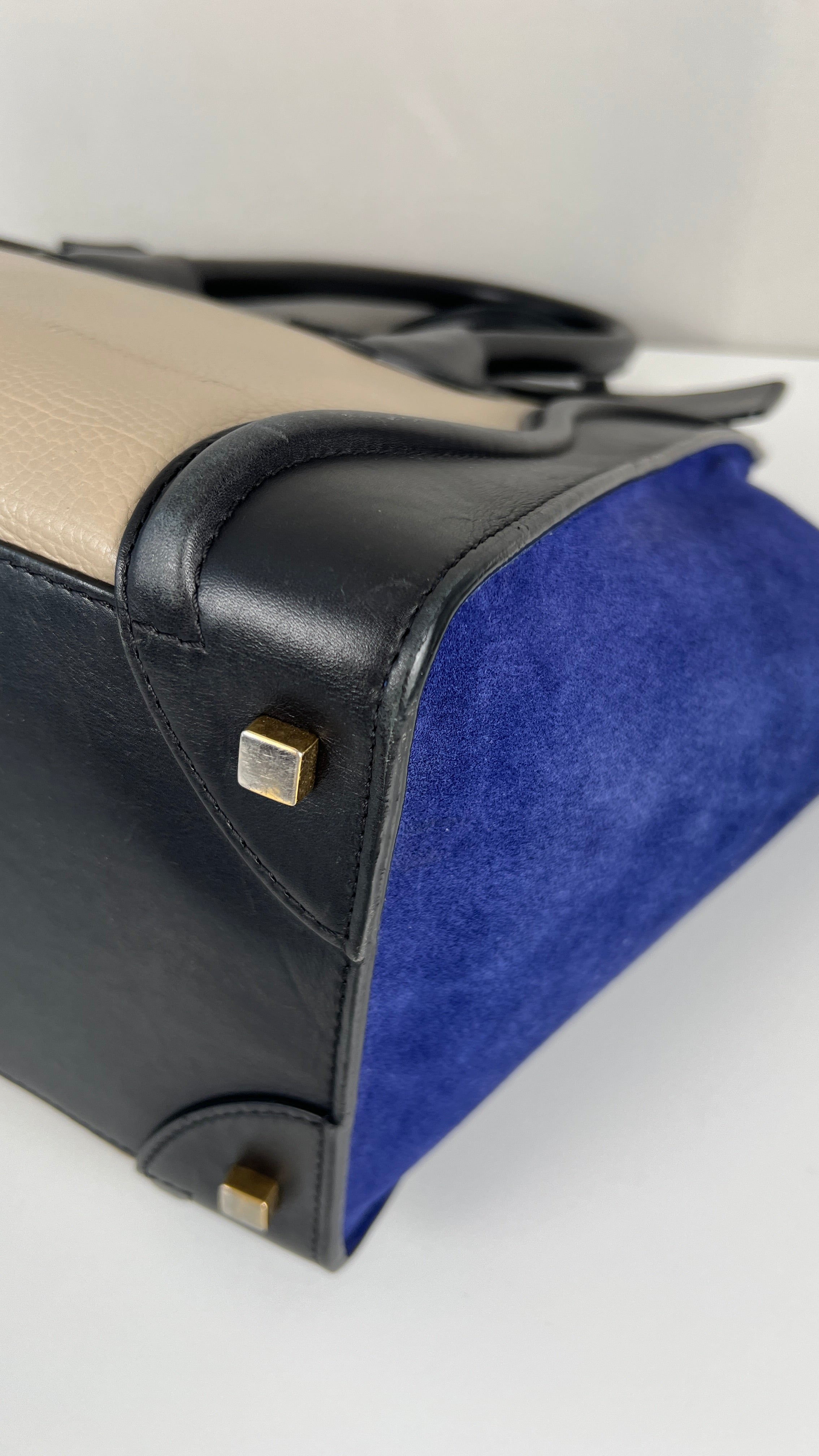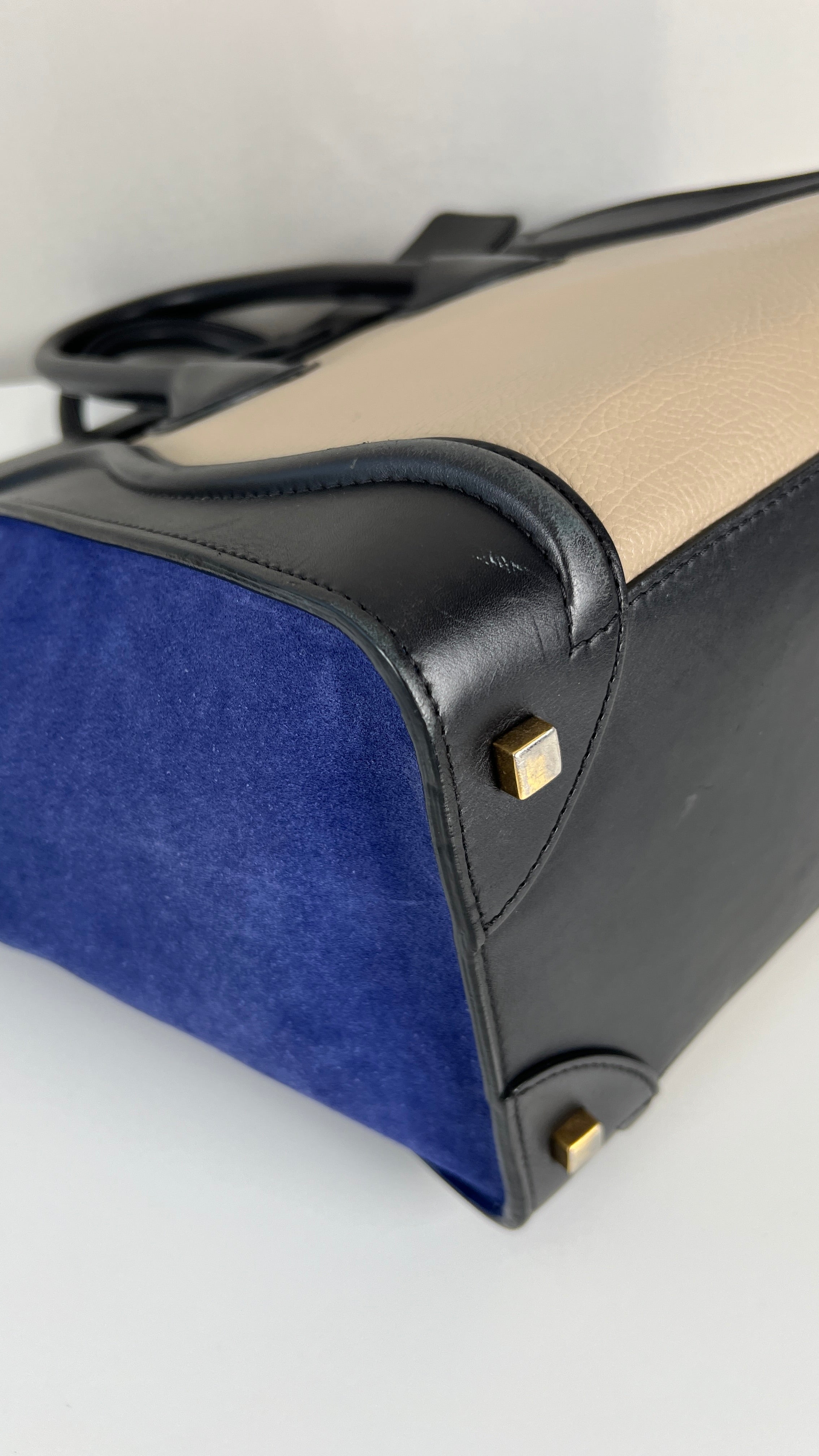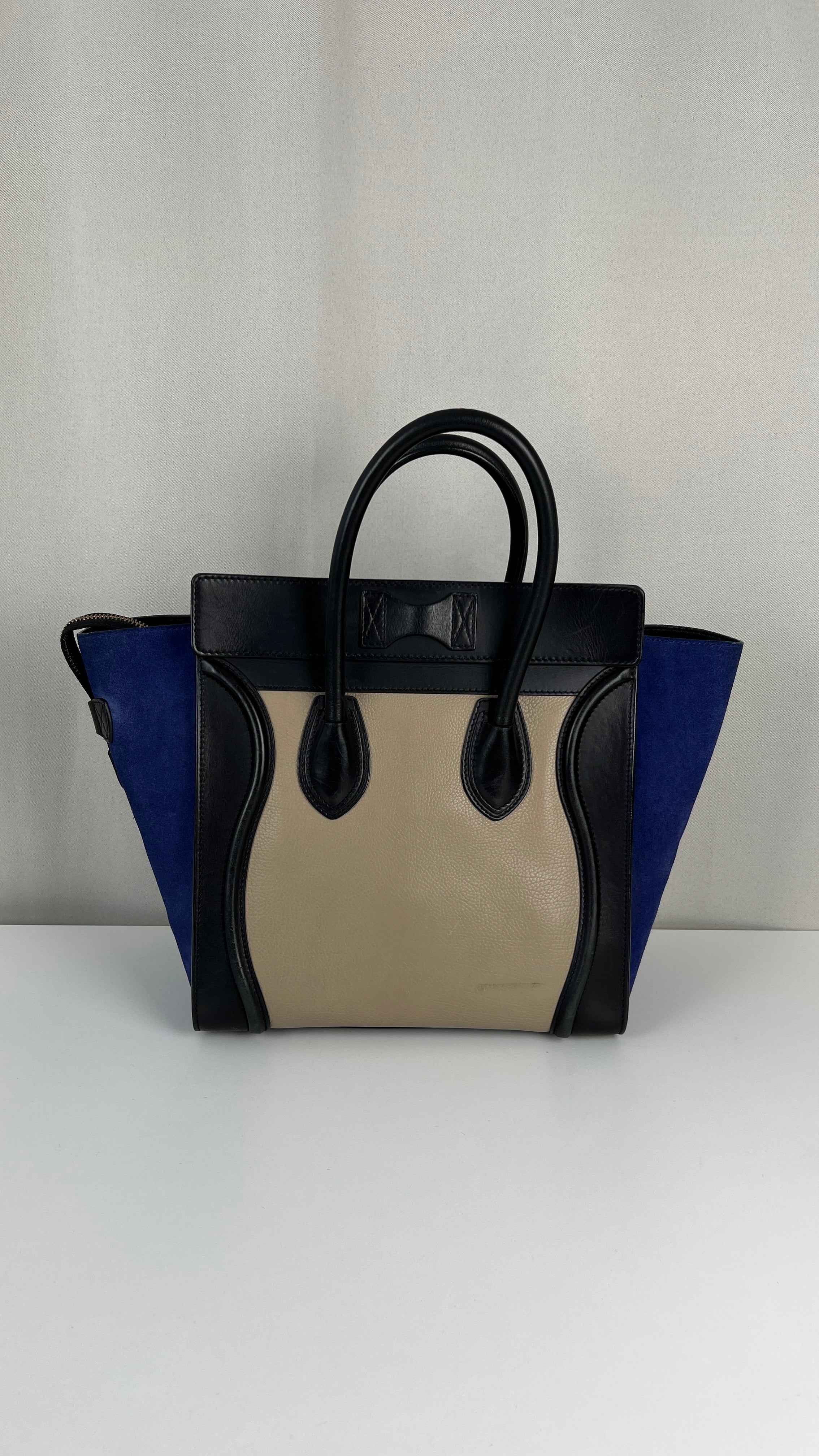 Ce sac Celine Luggage est en bon état. Il y a de petites traces d'usure sur le cuir en daim. Les coins sont en bon état, juste un peu frottés. Traces d'usure et rayures naturelles sur le cuir noir. Une trace au dos du sac sur le cuir beige. Les anses sont en très bon état. L'intérieur est en très bon état, on voit qu'il a été utilisé à l'intérieur et sur les côtés intérieur.