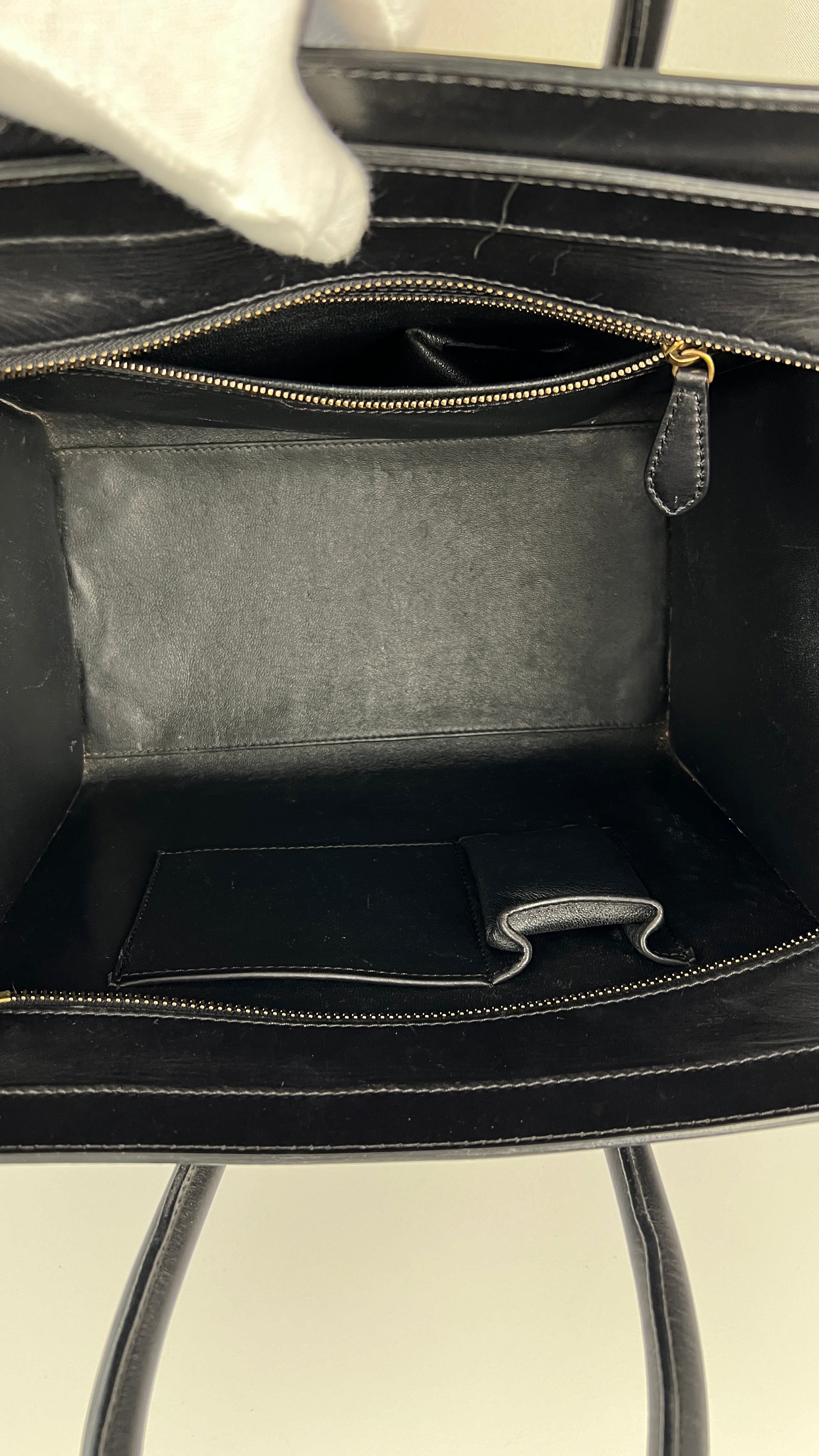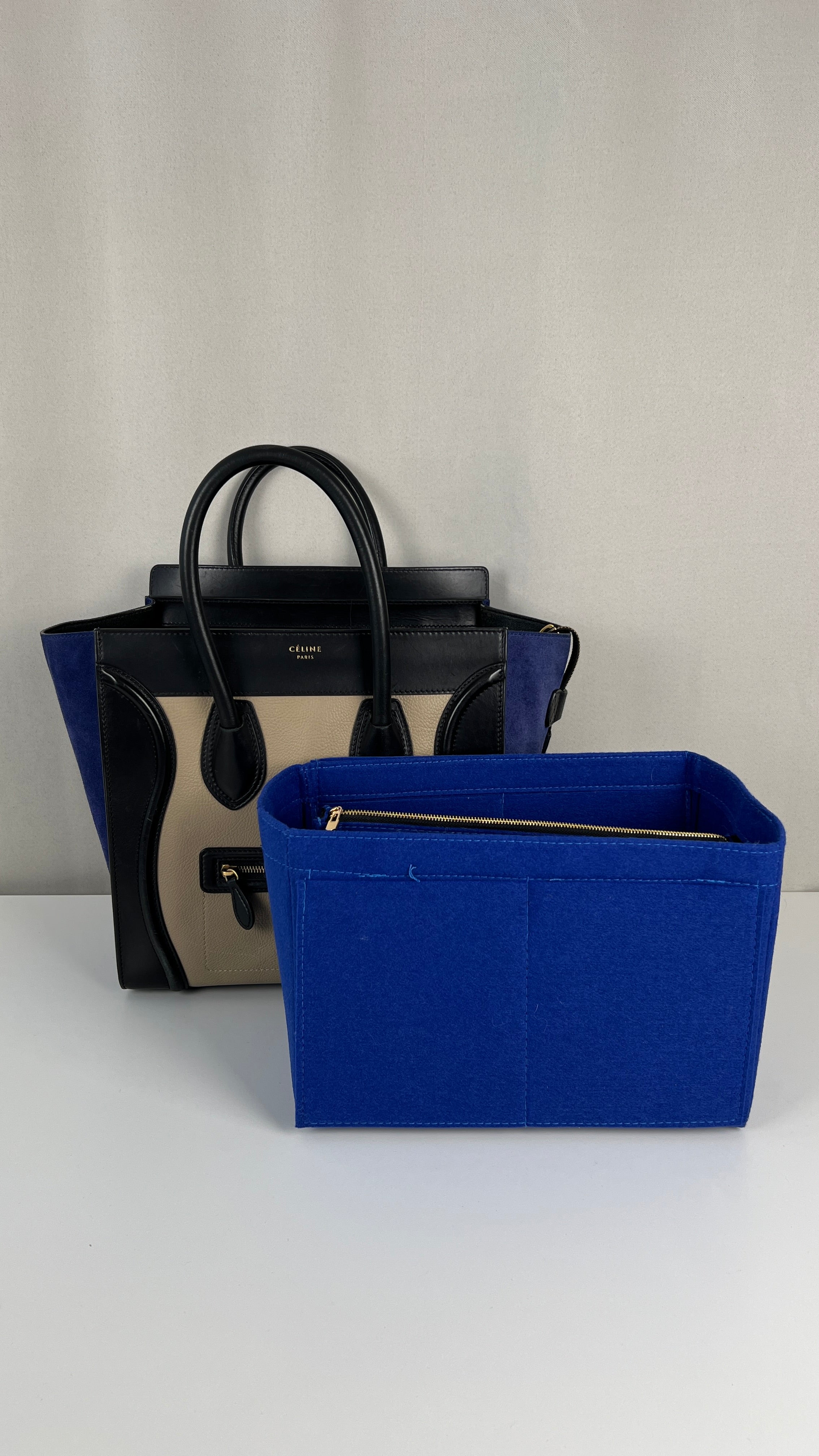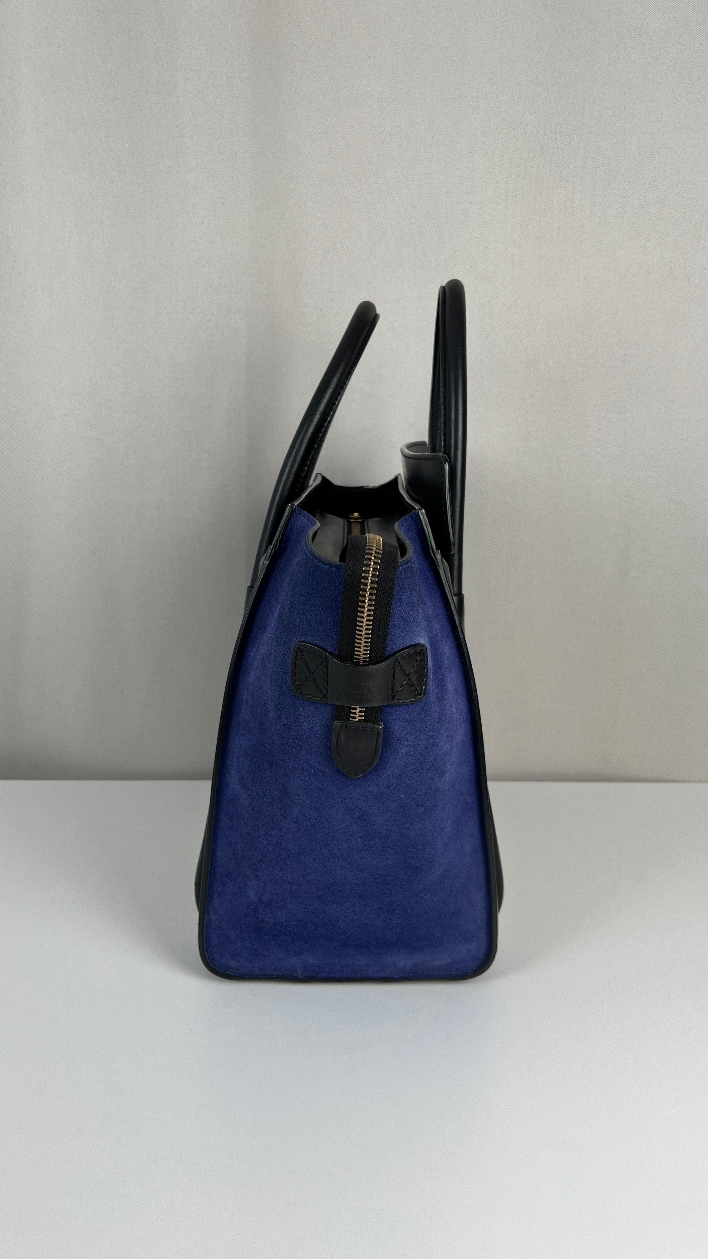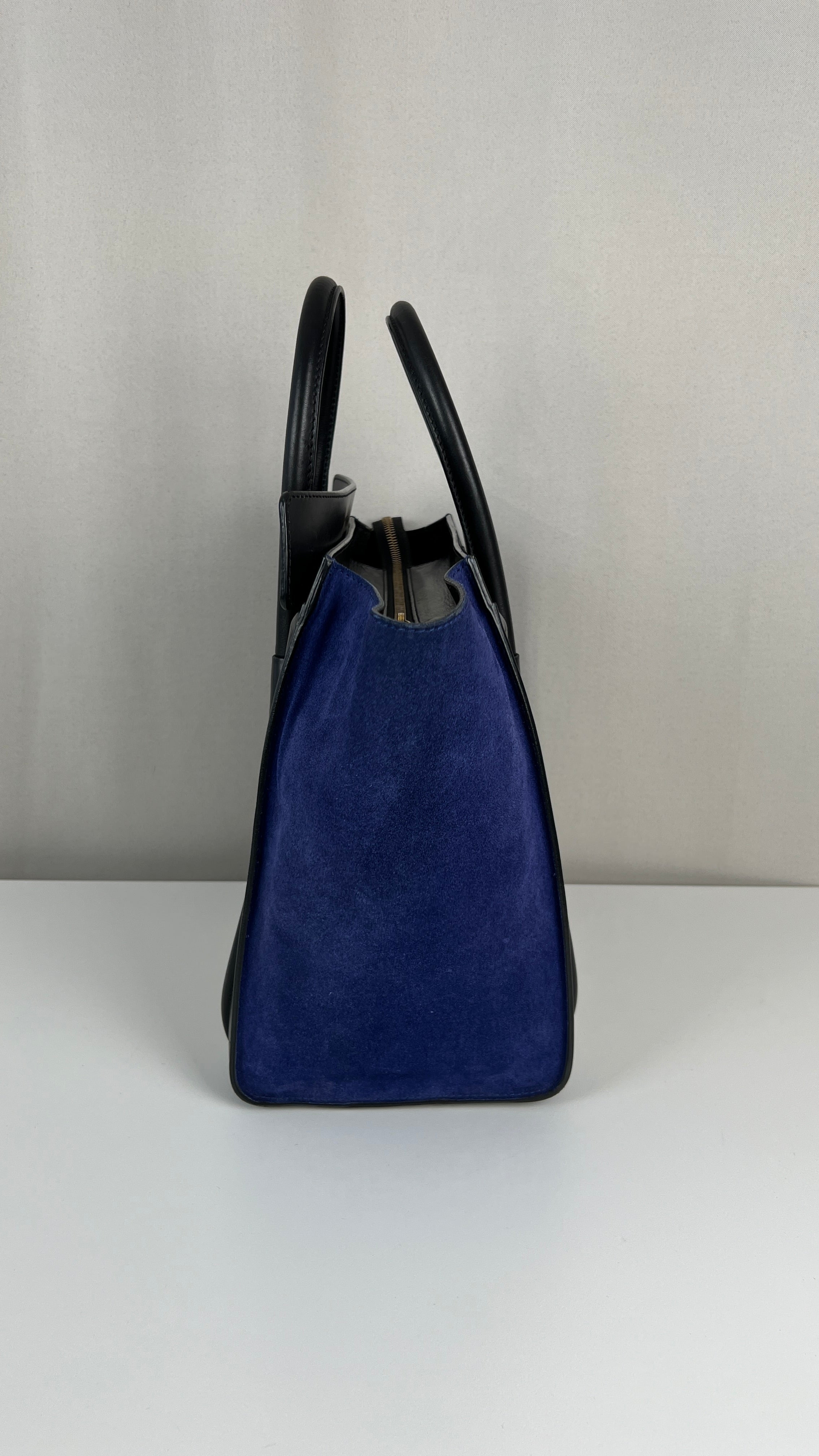 Ce sac Celine Luggage est en bon état. Il y a de petites traces d'usure sur le cuir en daim. Les coins sont en bon état, juste un peu frottés. Traces d'usure et rayures naturelles sur le cuir noir. Une trace au dos du sac sur le cuir beige. Les anses sont en très bon état. L'intérieur est en très bon état, on voit qu'il a été utilisé à l'intérieur et sur les côtés intérieur.